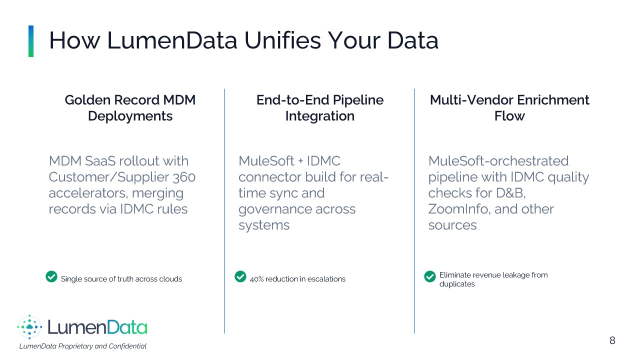 LumenData modernizes complex enterprise data, turning legacy systems into business value through data strategy, governance, quality, and analytics. It has delivered solutions for 50+ blue-chip clients worldwide.