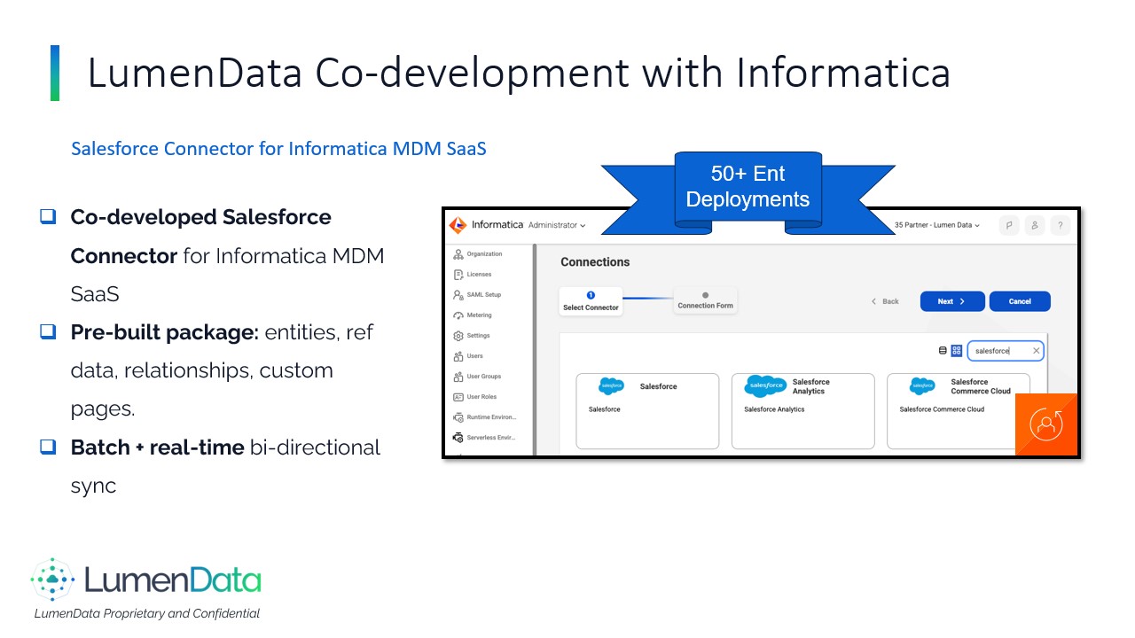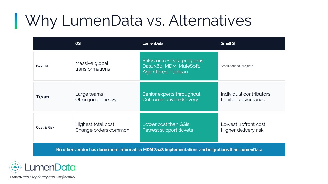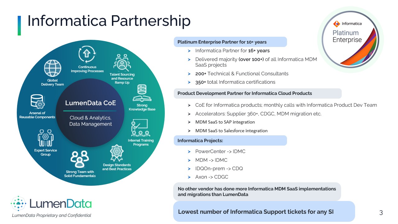 About LumenData - The Salesforce Data Activation Partner Who We Are####LumenData is a data modernization and analytics consulting firm and long‑time Informatica Platinum Partner. We help enterprises move faster with governed, trusted, and interoperable data across cloud and hybrid estates.####What We Do:####We modernize and connect data estates by migrating legacy pipelines such as PowerCenter to IDMC and by implementing secure integrations across APIs, SFTP, and EDI in both batch and real‑time patterns, including CDC. Our teams establish governance and master‑data foundations using CDGC, IDQ, and C360/MDM so that stewardship workflows and reliable lineage are built in from the start. We design and operate data platforms on Snowflake and Databricks with well‑defined semantic layers and rationalized BI footprints, including transitions from to Power BI or Tableau. ####We also prepare organizations for AI and machine learning through curated data products, feature stores, retrieval and knowledge graphs, and robust MLOps. When solutions are live, we provide managed services with SLAs focused on performance, cost, and reliability.