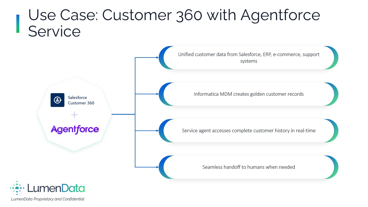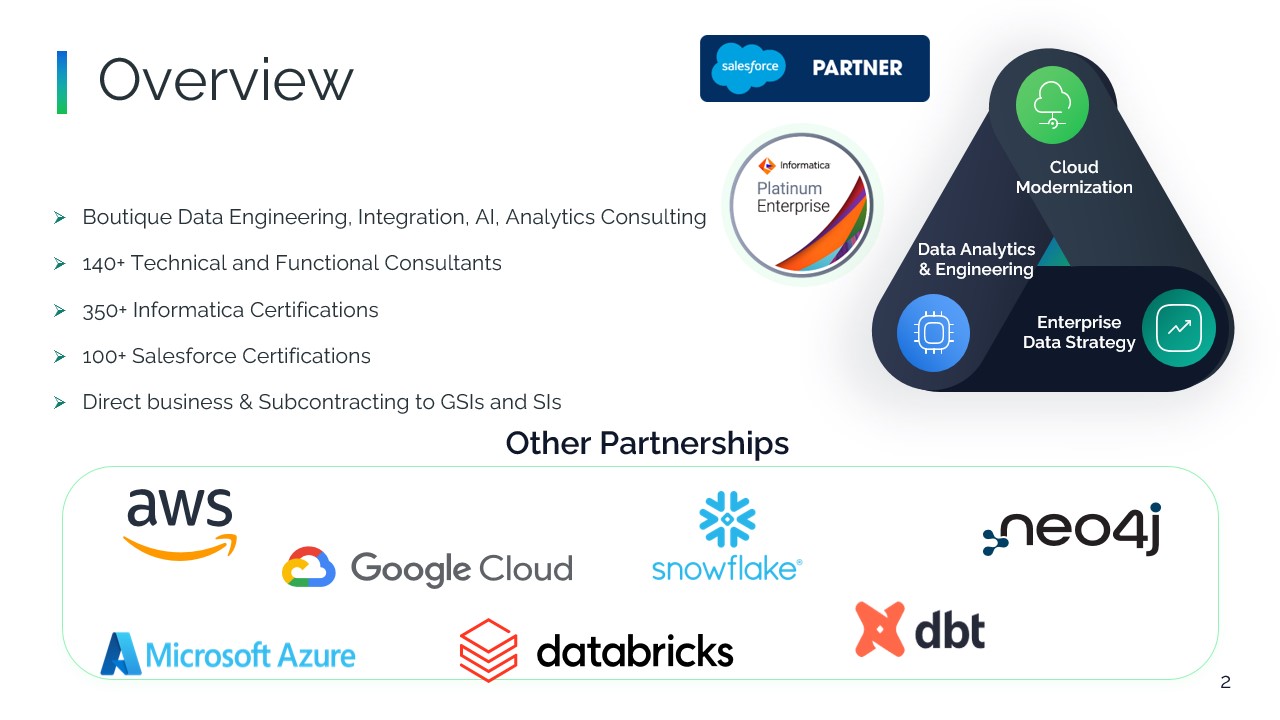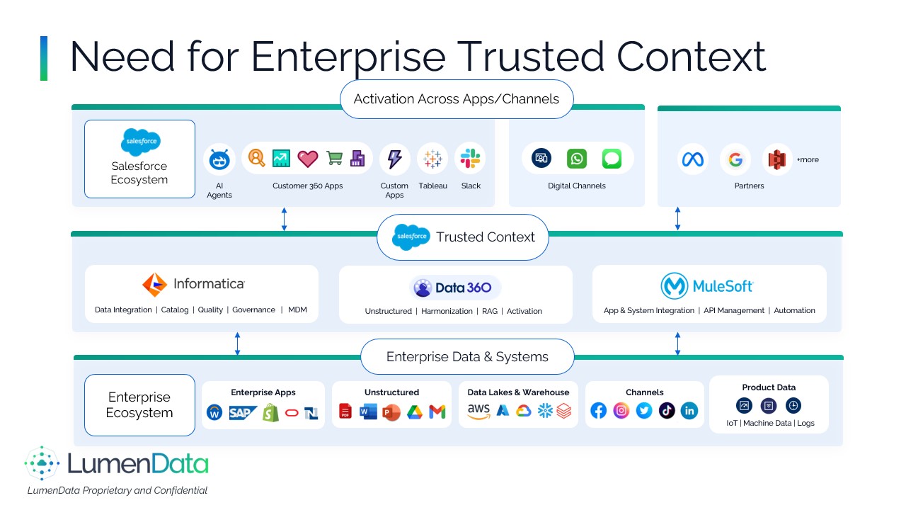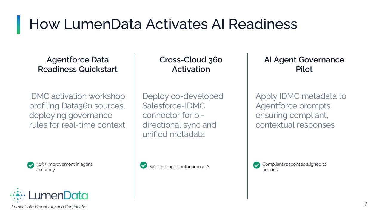 About LumenData - The Salesforce Data Activation Partner Who We Are####LumenData is a data modernization and analytics consulting firm and long‑time Informatica Platinum Partner. We help enterprises move faster with governed, trusted, and interoperable data across cloud and hybrid estates.####What We Do:####We modernize and connect data estates by migrating legacy pipelines such as PowerCenter to IDMC and by implementing secure integrations across APIs, SFTP, and EDI in both batch and real‑time patterns, including CDC. Our teams establish governance and master‑data foundations using CDGC, IDQ, and C360/MDM so that stewardship workflows and reliable lineage are built in from the start. We design and operate data platforms on Snowflake and Databricks with well‑defined semantic layers and rationalized BI footprints, including transitions from to Power BI or Tableau. ####We also prepare organizations for AI and machine learning through curated data products, feature stores, retrieval and knowledge graphs, and robust MLOps. When solutions are live, we provide managed services with SLAs focused on performance, cost, and reliability.