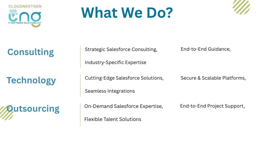 About CLOUDNEXTGEN IT Software Solutions LLP CloudNextGen is a specialized technology consultancy positioned at the intersection of CRM, Data, and AI. We are building a dedicated Salesforce practice focused on mid-market and enterprise digital transformation. Our core strength lies in Data-First Implementations—ensuring that Salesforce isn't just a database, but a powerhouse driven by clean data and seamless integrations. We specialize in the "Power Trio" of Salesforce: Core Clouds, MuleSoft, and Data Cloud.##Organizations choose CloudNextGen for our deep technical rigor. Unlike traditional consultancies, we bring a "Product Engineering" mindset to CRM. We don't just configure; we architect. Clients rely on us for:##Complex Migrations: Transitioning legacy data into high-performing Salesforce environments.##AI Readiness: Preparing data architecture to leverage Salesforce Einstein and Agentforce.##Security-First Approach: Leveraging our expertise in Sovereign Cloud environments to ensure absolute data compliance.##Our mission is to accelerate the "Next Gen" of business operations. We value Technical Excellence, Transparency, and Scalability. Our goal for this partnership is to drive innovation through the Salesforce ecosystem.