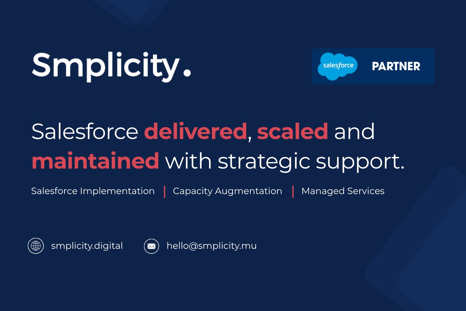 About Smplicity Consulting Ltd (Mauritius) Founded in 2016 as a UK Salesforce Partner, we set up our Mauritius delivery centre in 2018. Following the UK business acquisition in 2023, Mauritius now operates as our independent headquarters. Under the same leadership, Smplicity Consulting (Mauritius) continues as a Salesforce Partner, delivering implementations, team augmentation and managed services to clients across the UK, EU, US, Africa and Australia.####We deliver end-to-end Salesforce expertise: covering the full ecosystem from Sales, Service and Marketing to Finance, Telecom, Nonprofit, Slack, Revenue, Education and Media. Our certified consultants, developers and architects integrate seamlessly into your team, providing the####Why choose us?##Proven experience: Years of delivery and acquisition success give us clear insight into what makes projects succeed.####Trusted consultants: Every consultant is vetted, technically strong and client-ready, adding value from pre-sales to delivery.####High-stakes delivery: We’ve stabilised failing projects, fixed poor scoping and turned around critical engagements.####Commercially sound: Our tailored, cost-conscious approach ensures efficient delivery, measurable outcomes and lasting adoption.