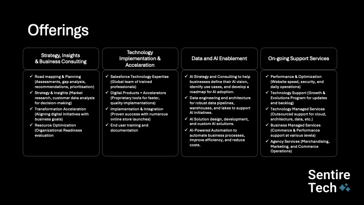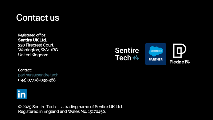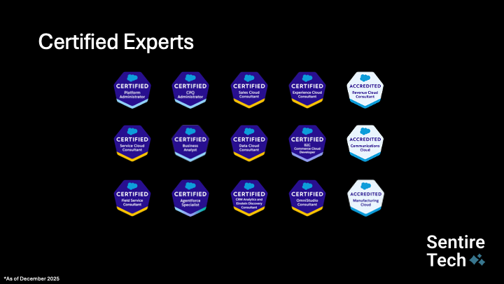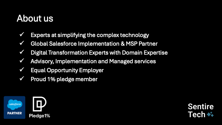 Sentire Tech is a global Salesforce partner with a goal to make technology simple for businesses.####We blend deep Salesforce expertise with a practical, human approach that focuses on what matters most: clarity, adoption, and results.