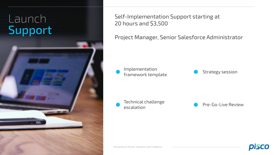 Self-implementing Salesforce? Pisco’s Launch Support gives you the expert backup you need. A dedicated project manager and senior administrator to guide you from setup to go-live, without the commitment of ongoing managed services.