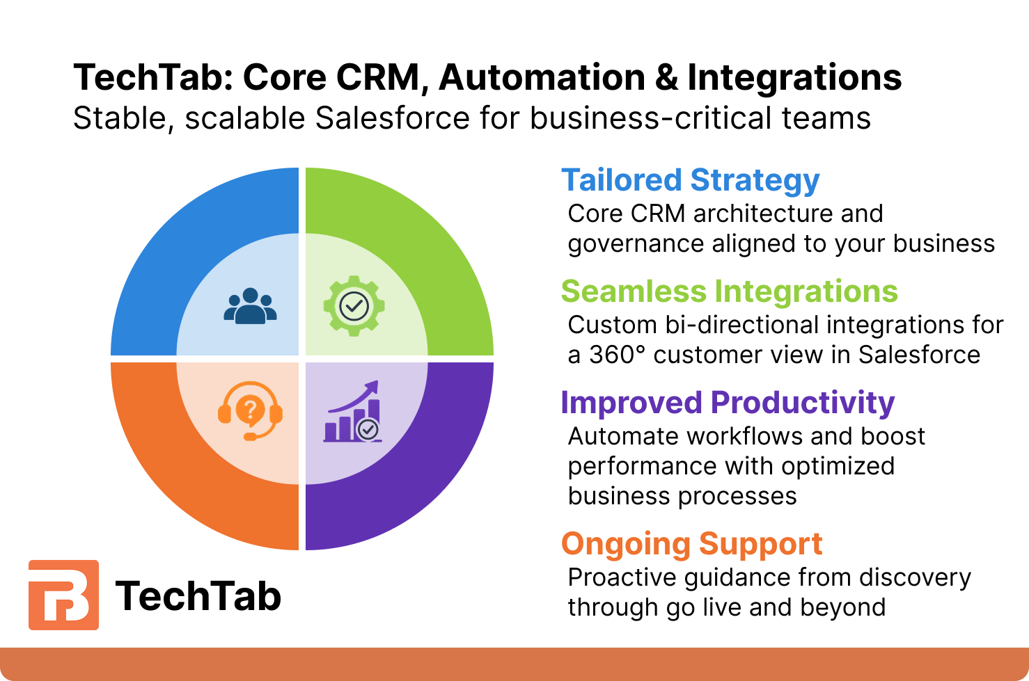 About TechTab Founded in 2023, TechTab was built on the belief that Salesforce consulting should be about delivering real value, not just making sales. Too often, businesses are sold solutions they don’t need, leading to unnecessary complexity. We started TechTab to combine top-tier technical expertise with a client-first approach, ensuring every solution is designed with long-term success in mind.####At TechTab, the client always comes first. We don’t just take requests—we strategically tailor Salesforce to fit your business needs. If something won’t serve your goals, we provide honest guidance rather than pushing unnecessary features.####With experience across small businesses, enterprises, and companies navigating mergers and acquisitions, we bring deep industry knowledge and a practical approach to every engagement. Whether it’s a new implementation or optimizing an existing org, we focus on efficiency, scalability, and real business impact.####TechTab is led by two expert founders who take a hands-on approach to every project. As we grow, we remain committed to expanding our team while staying true to our mission: delivering exceptional, client-driven Salesforce solutions.