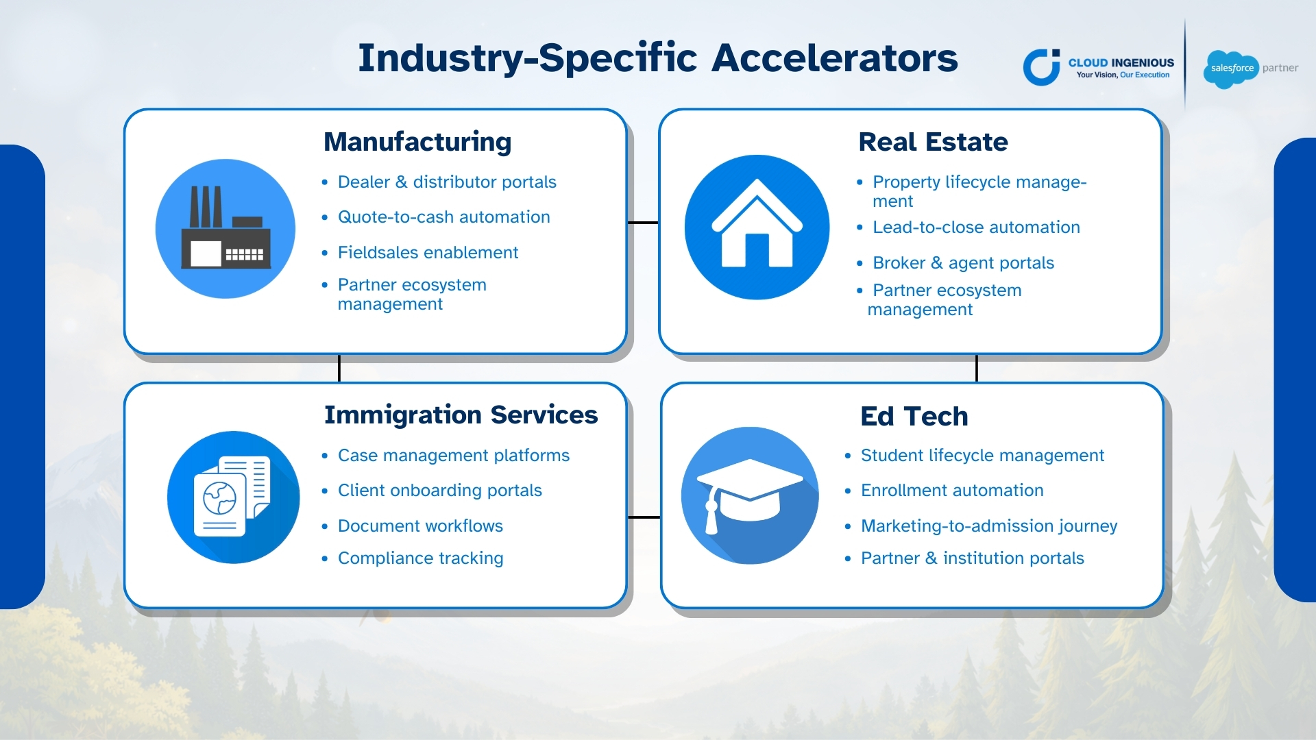 With over a decade in the Salesforce ecosystem, Cloud Ingenious drives growth and maximize ROI with expert solutions across all Salesforce products. Trust us as your partner for unparalleled success.