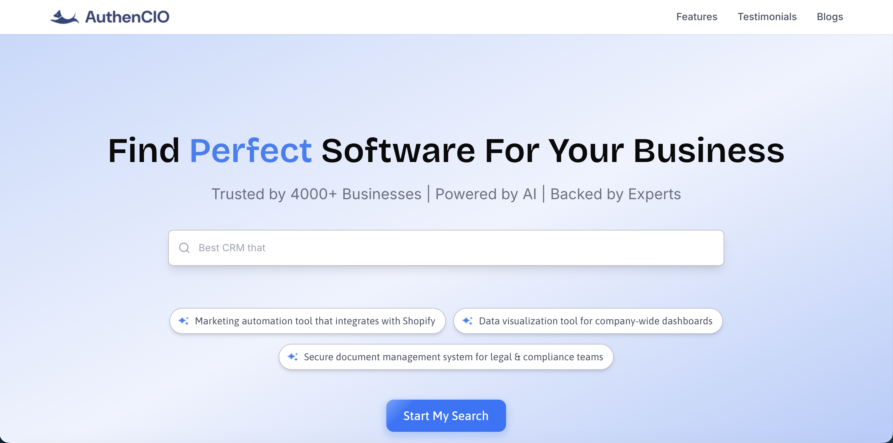 AuthenCIO is an AI-driven software discovery and implementation platform designed to help businesses find the most suitable tools quickly and implement them confidently. Trusted by 8000+ businesses across the world