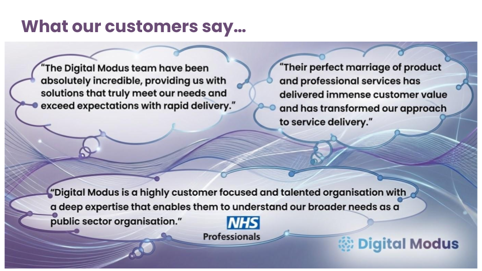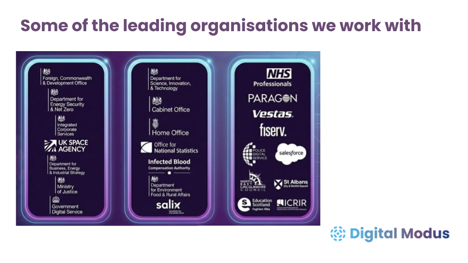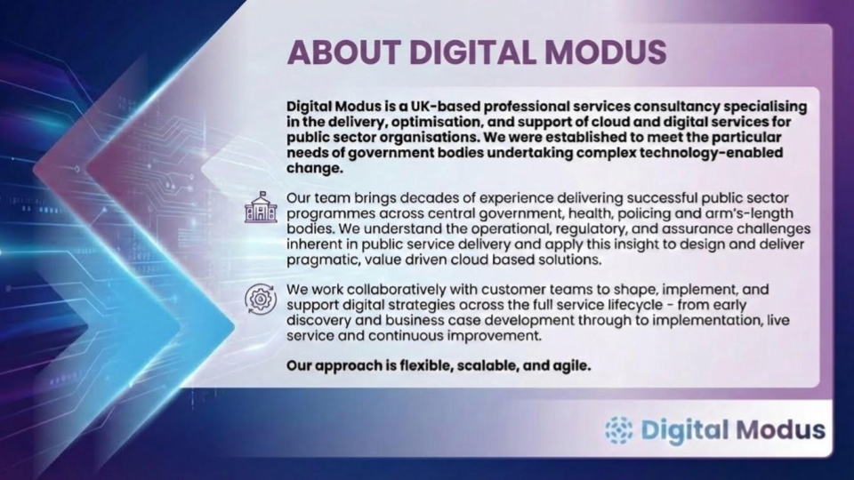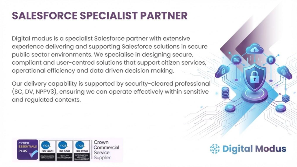 About Digital Modus Digital Modus is a fast-growing UK-based SME with a current team of over 40 experienced expert consultants across the Salesforce Platform (Core, Service, Sales, Marketing, Mulesoft and Tableau). ####We provide advisory, implementation and project delivery services with a specialism in security cleared resources. ####The whole team have a background and relevant experience in modernising public sector technology with a genuine passion for delivering the best customer access experience across government and highly regulated industries. Digital Modus has been integral in establishing digital standards and have successfully delivered digital transformation across the Central government departments, Agencies, Health Organisations and Local Councils (BEIS, FCDO, DVLA, Home Office and a number of local authority organisations). Outside of the Public Sector, we work with a handful of organisations in Financial Services, Media and Health. ####As an organisation we are deeply invested in customer outcome and work from an ethos of "deliver more, with less" - this has made us one of the fastest growing SME partner organisations inside of the UKI.