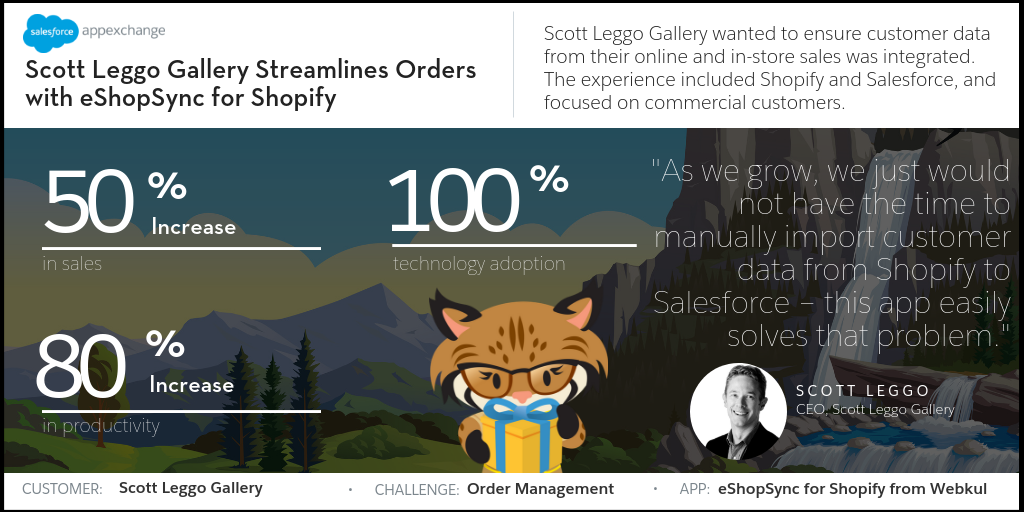 Scott Leggo Gallery increased productivity 80% with eShopSync for Shopify by Webkul. Get the app >>