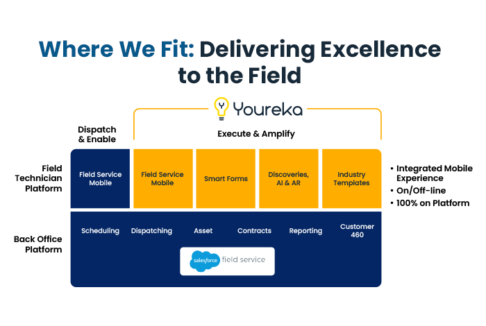 Field Service100% native to Salesforce, Youreka enables excellence in field service through mobile forms, guided assessments, inspections, and advanced mobile technology - online or offline, across key industries like manufacturing, utilities, energy and healthcare.