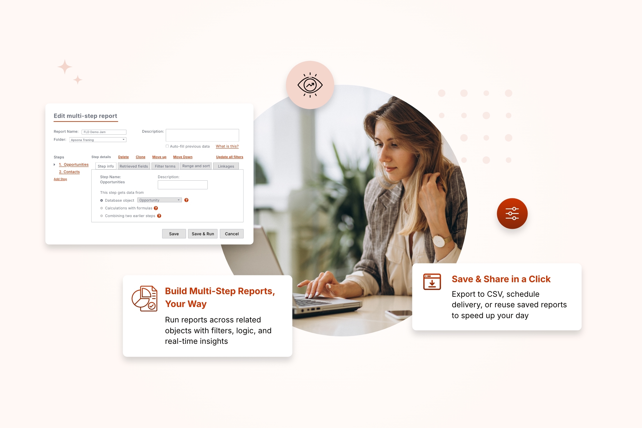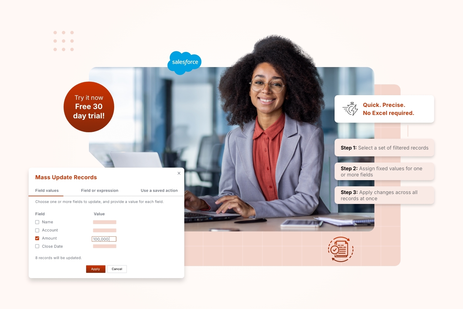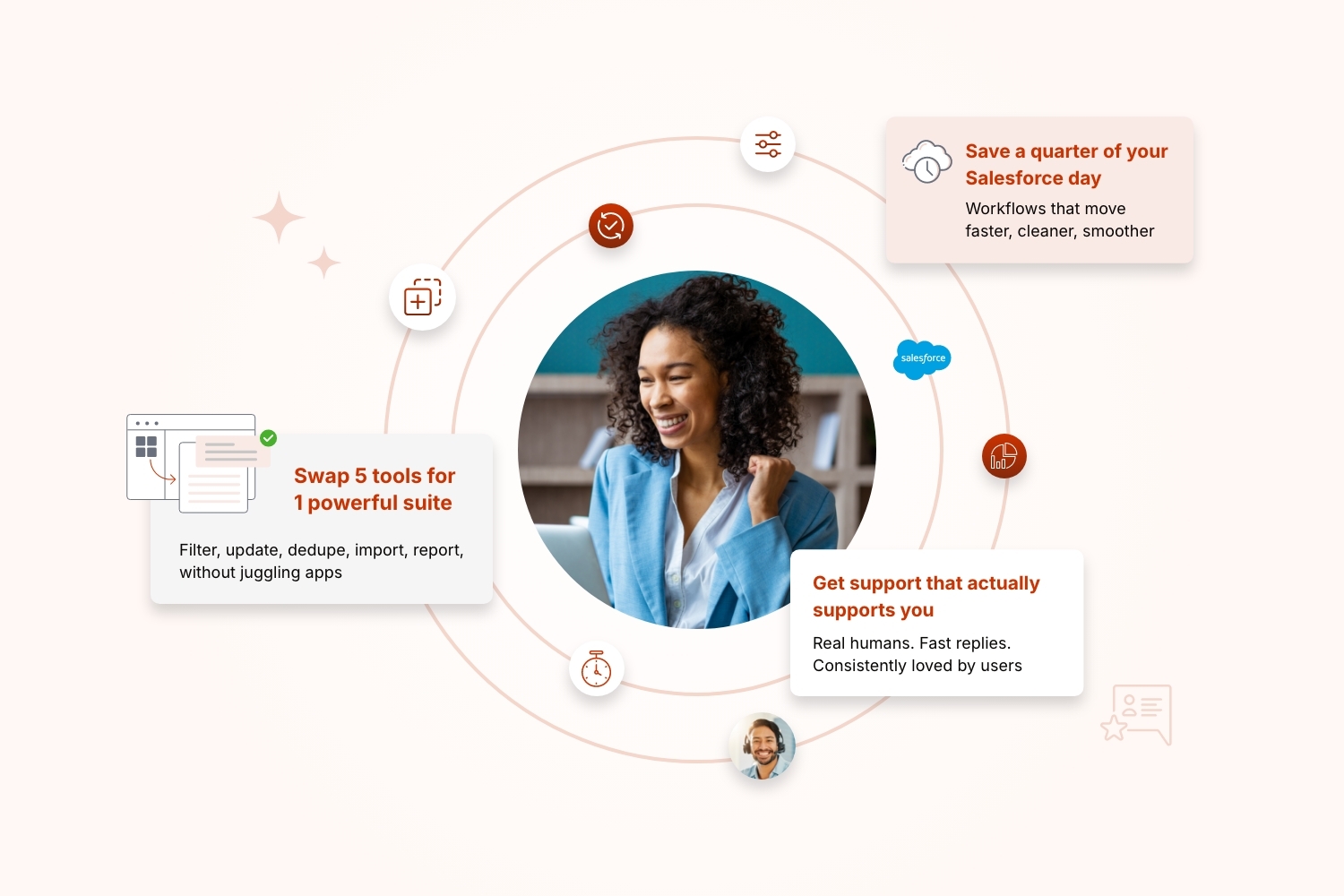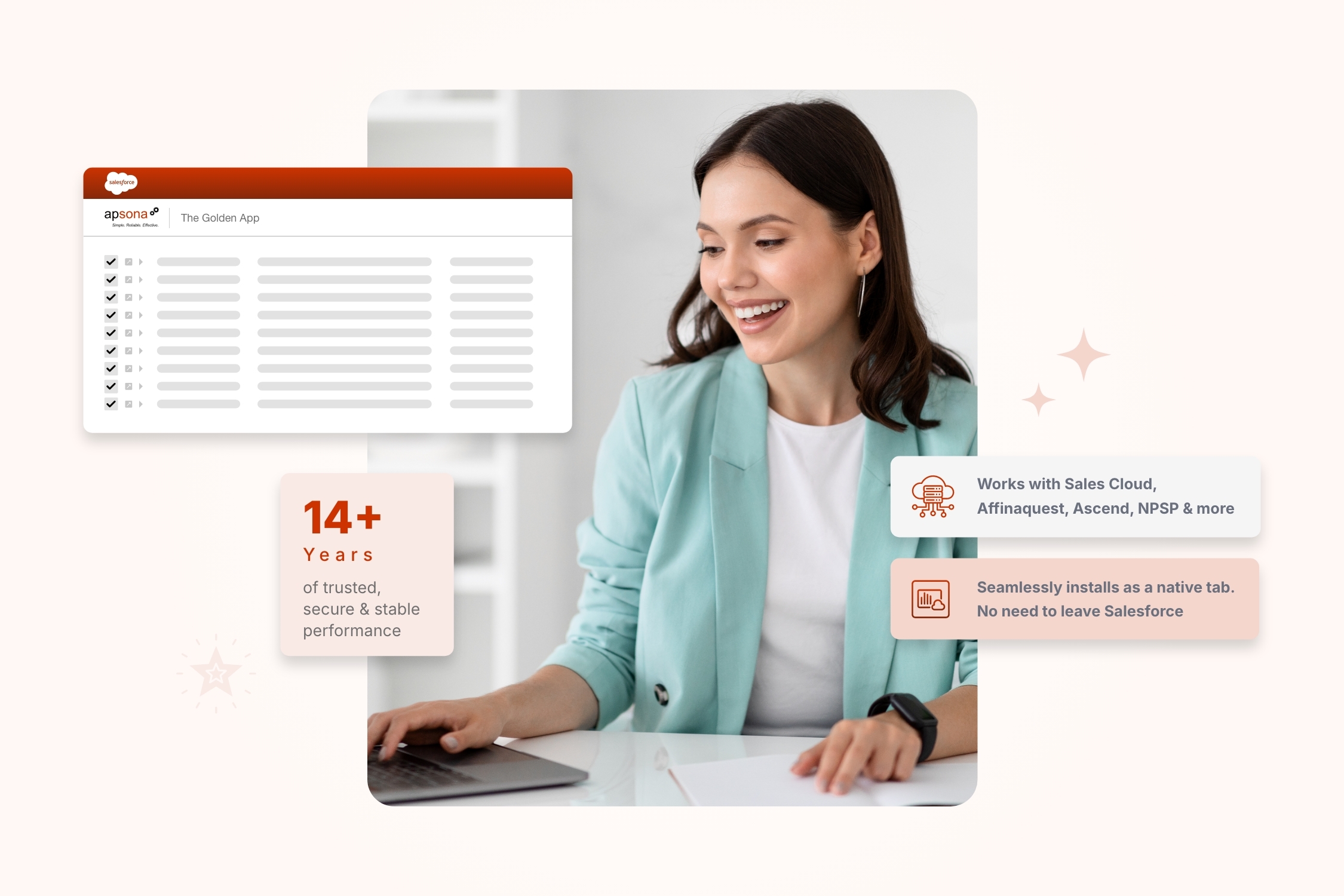 Save a quarter of your Salesforce day, guaranteed. Apsona empowers Admins and teams to simplify workflows with cross-object reporting, doc & email merge, deduplication, and inline editing. All native to Salesforce. Just clicks, no code.