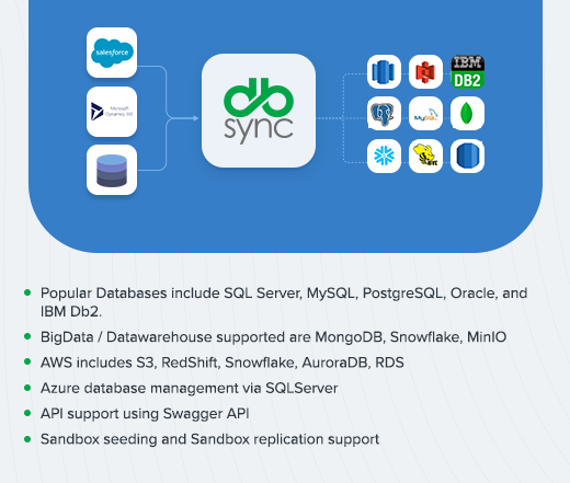 IntegrationConnect Salesforce with on-prem or cloud databases to ensure data accuracy, archive and compliance with DBSync's data replication and archiva solution. Experience seamless bi-directional data sync, robust security, and real-time insights for your business