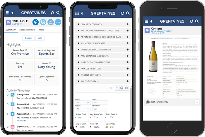 GreatVines is an enterprise-level Platform for beverage alcohol suppliers, distributors, and agencies. Our suite of mobile Wine & Spirit Sales Execution tools helps you manage 3-tier account relationships by delivering an intelligent, streamlined product.