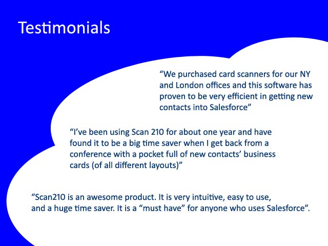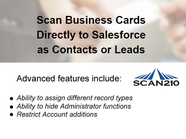 Productivity30 Day free trial to Scan business cards for quick upload as a Contact or Lead. Use Drag and Drop to create Salesforce Contact or Lead from email signature block. Requires CardScan or Ambir business card scanner available at additional cost.