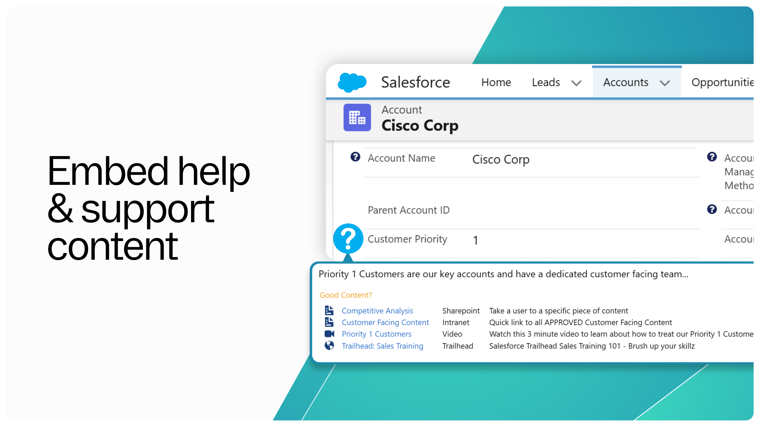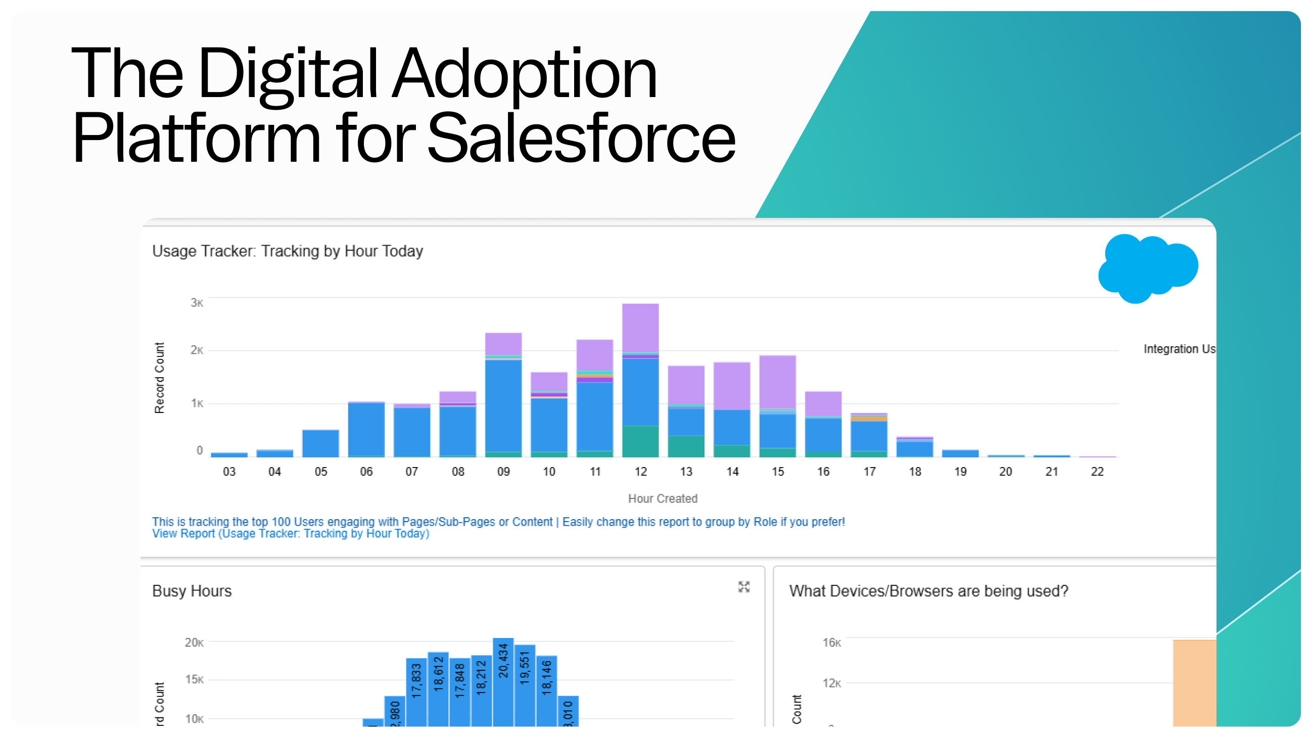 ProductivityDelivers in-app alerts, tips, and walkthroughs in Salesforce - plus actionable insights into user behaviour. Drive adoption, reduce support queries, and boost productivity with contextual help tailored to user roles, pages, and actions.