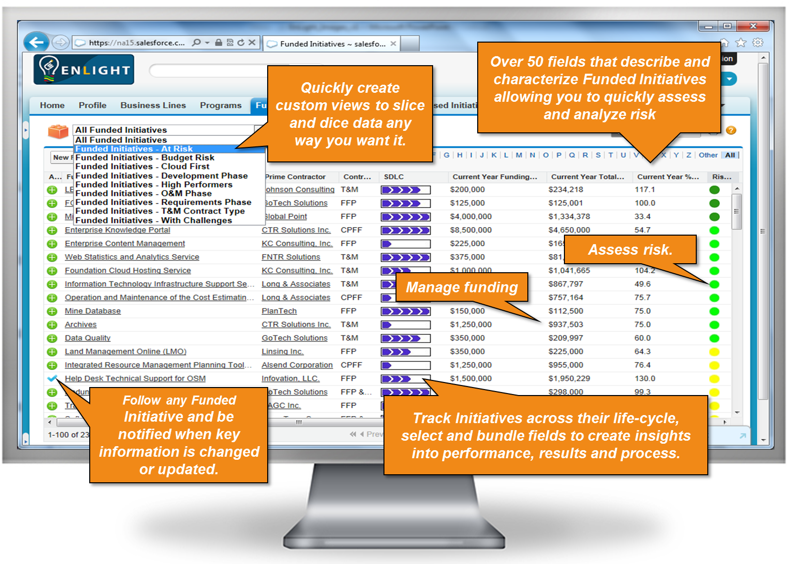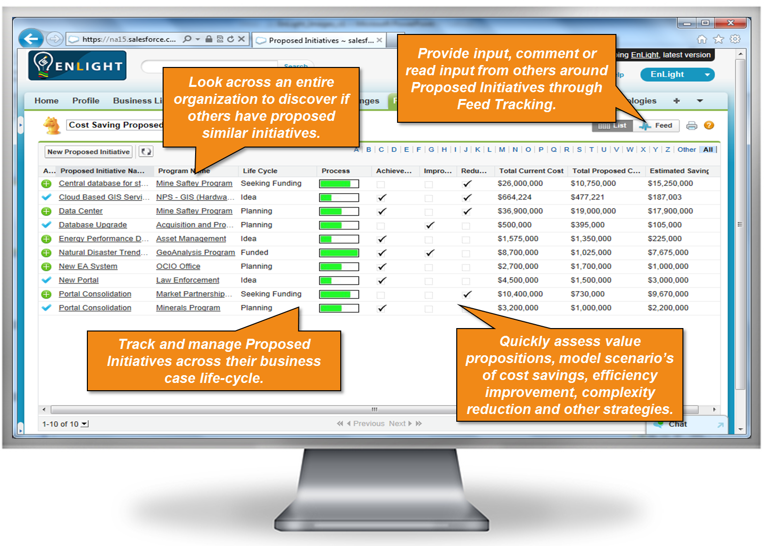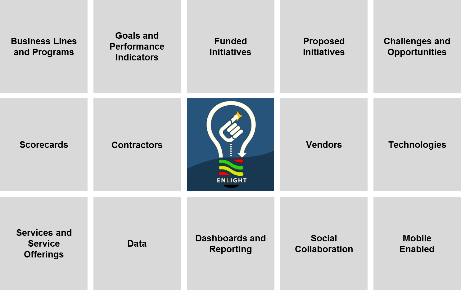 GovernmentEnLight is the 1st Enterprise IT Portfolio Management solution for Force.com that integrates over 15 Business, IT Management and Social Collaboration tools to provide customers a 360 degree view of IT’s role and impact across the organization.