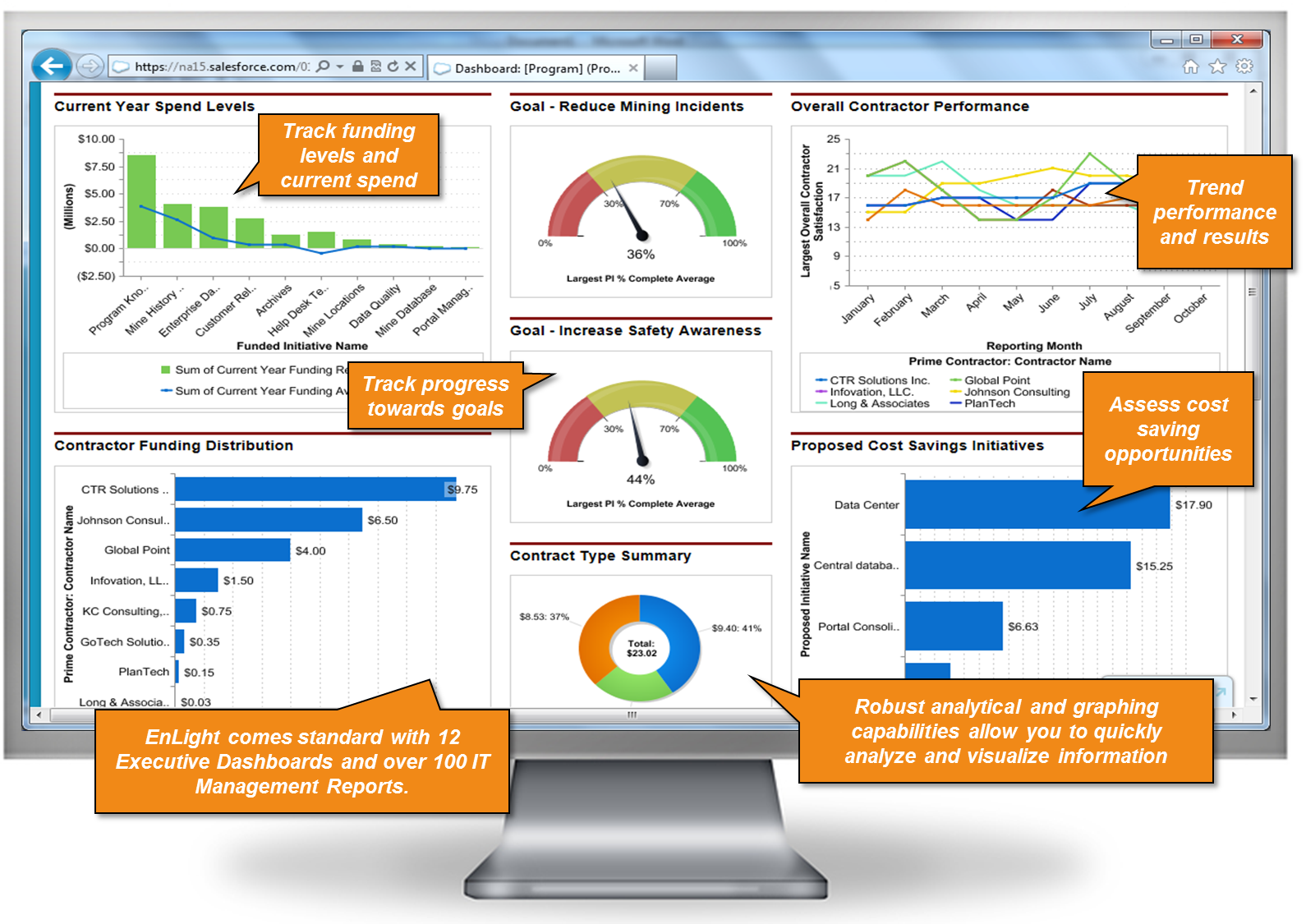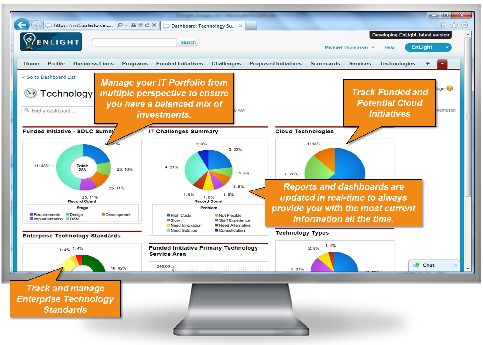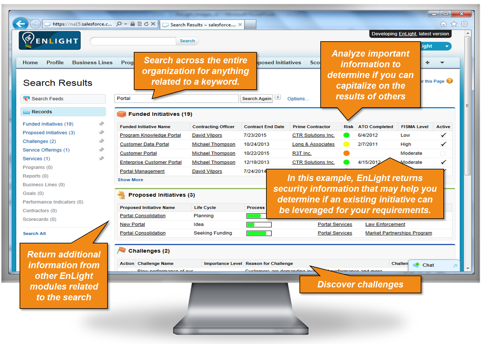 GovernmentEnLight is the 1st Enterprise IT Portfolio Management solution for Force.com that integrates over 15 Business, IT Management and Social Collaboration tools to provide customers a 360 degree view of IT’s role and impact across the organization.