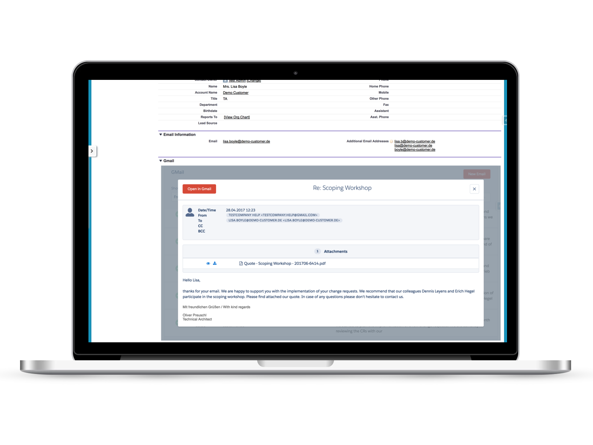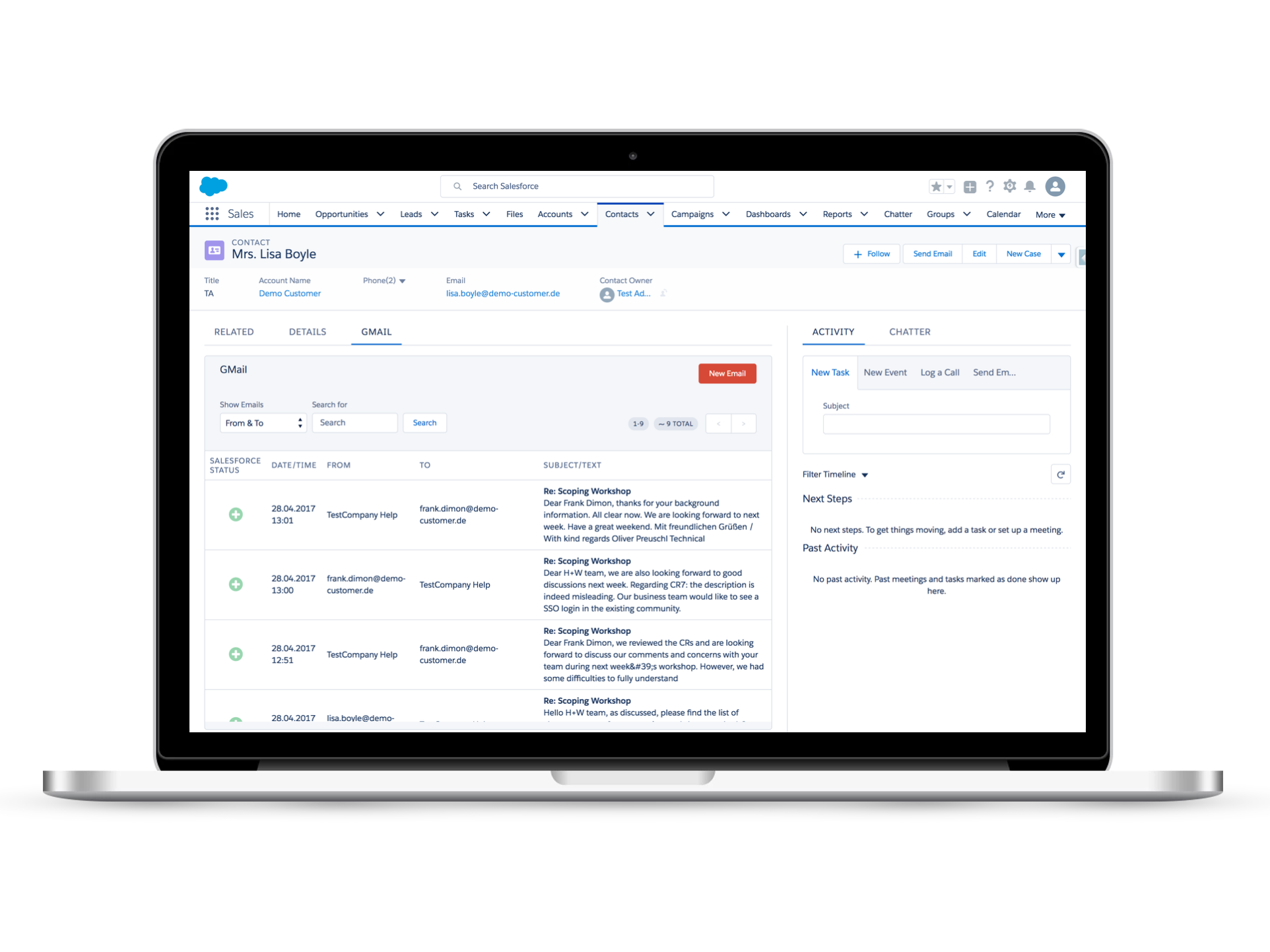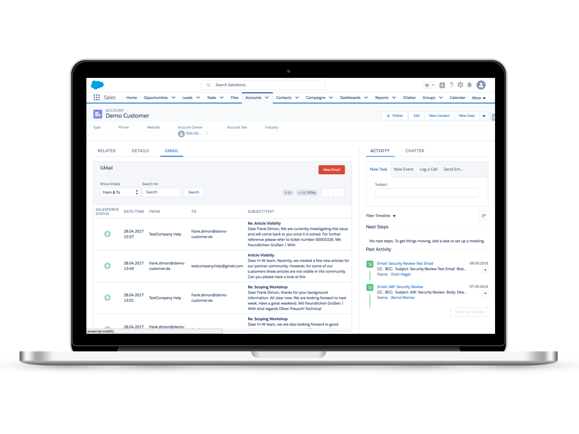 Email & Calendar Sync✔ View Gmail™ messages directly in your records (e.g. Contacts, Accounts, Opportunities)##✔ Intelligent identification of relevant emails (based on email addresses, domains, quote/ticket numbers, ...)##✔ No manual assignment needed##✔ Highly customizable