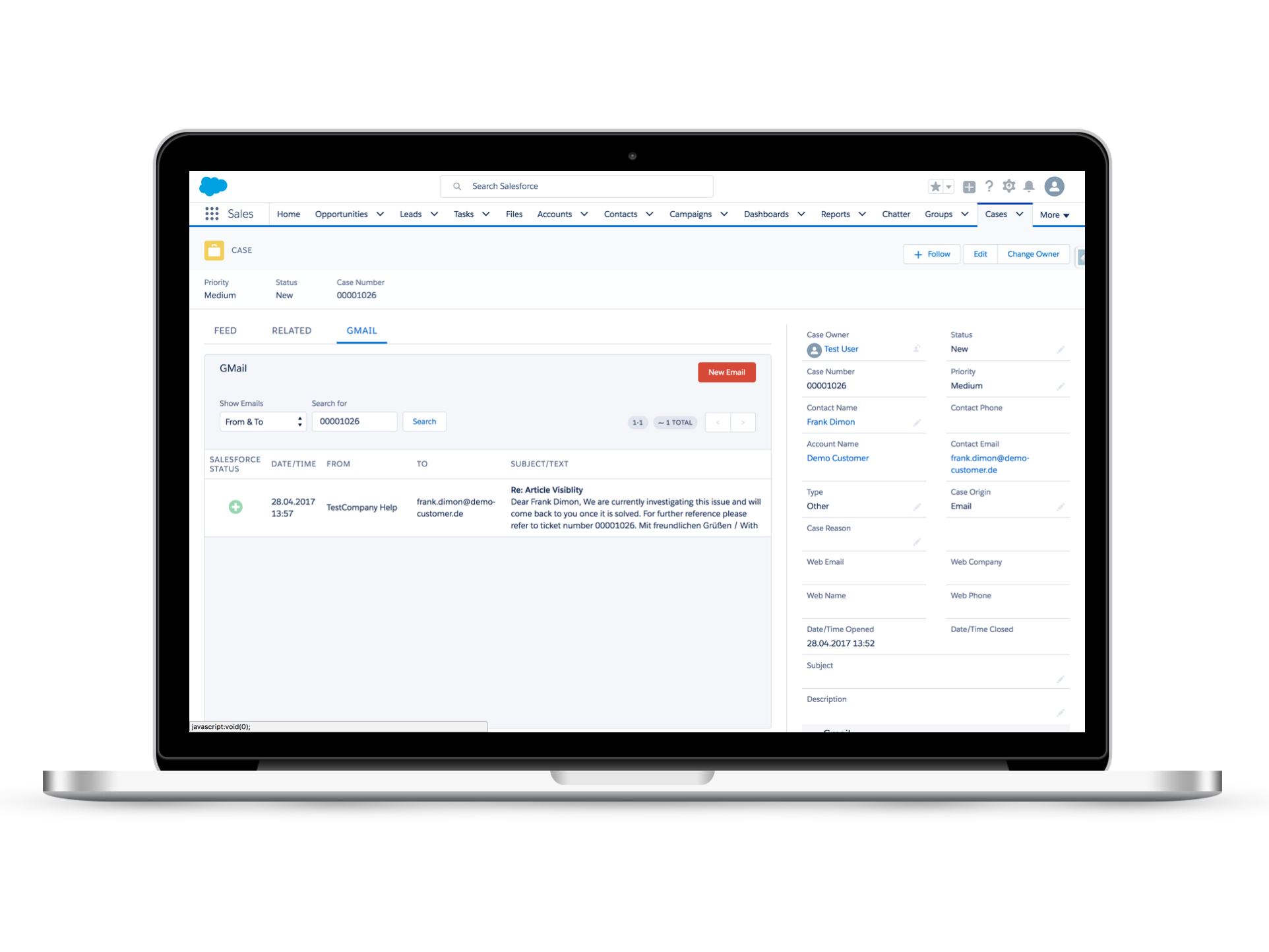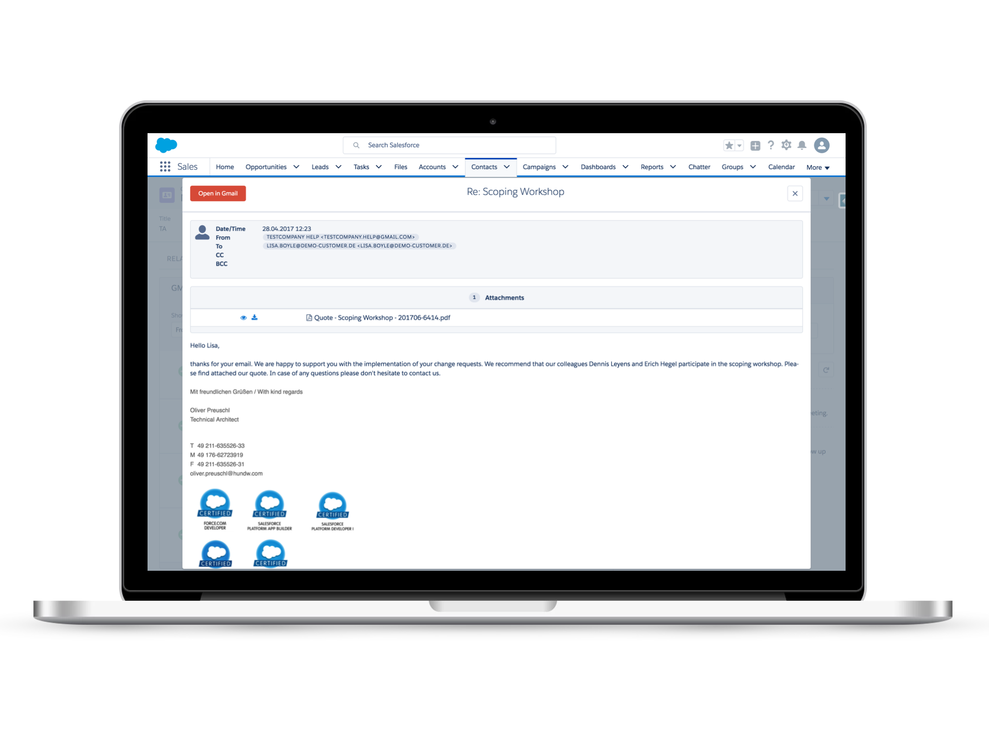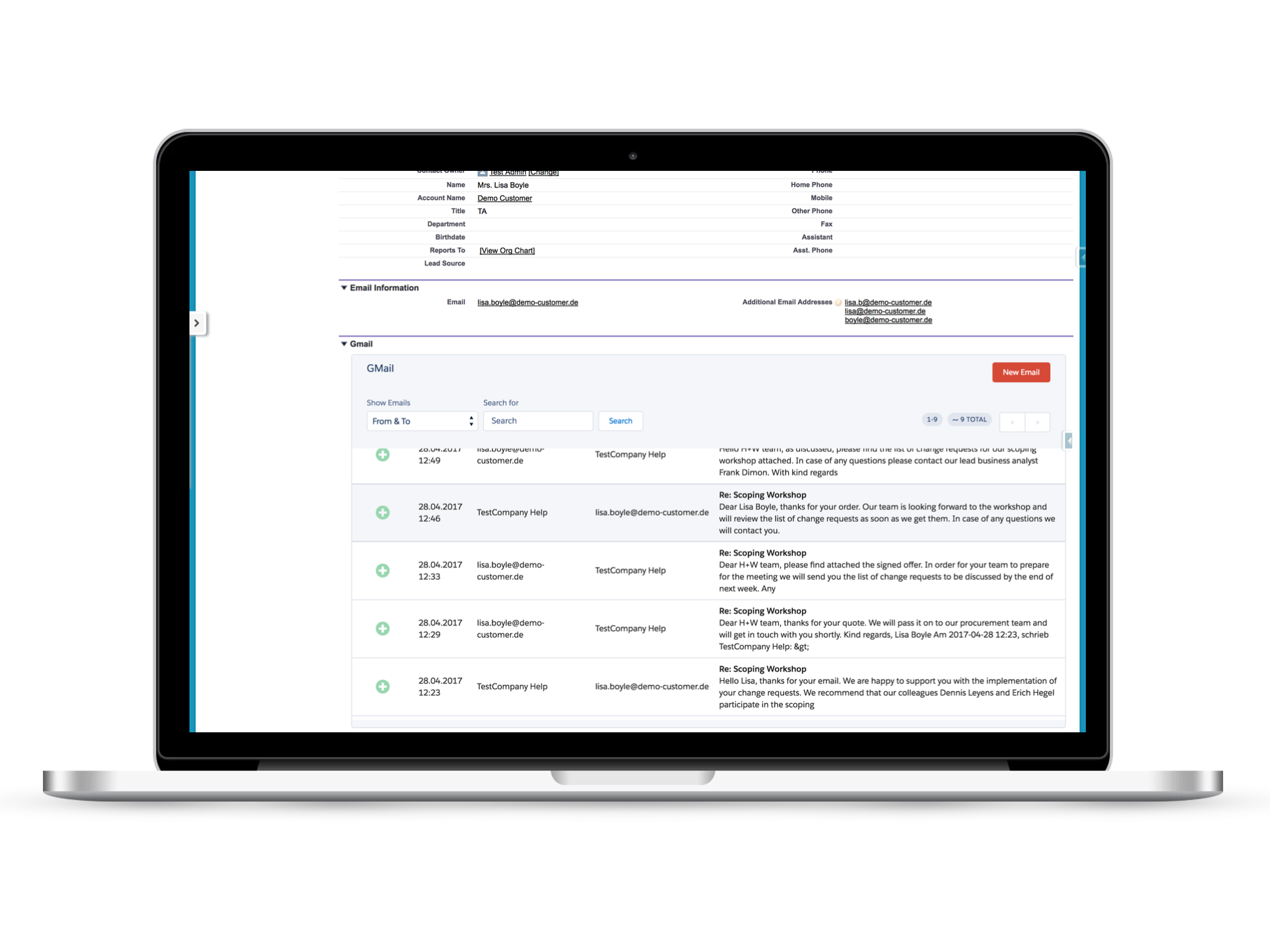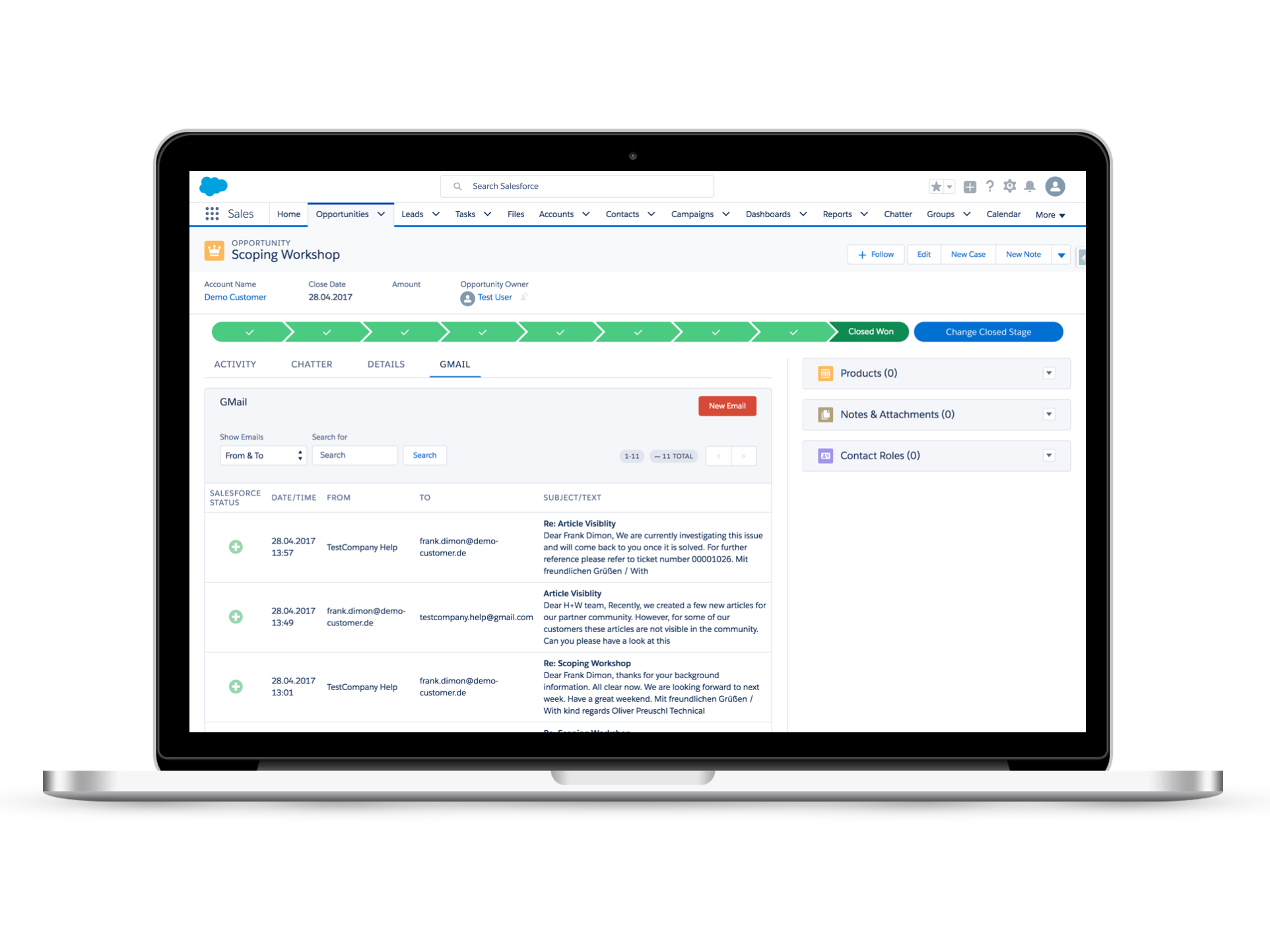 Email & Calendar Sync✔ View Gmail™ messages directly in your records (e.g. Contacts, Accounts, Opportunities)##✔ Intelligent identification of relevant emails (based on email addresses, domains, quote/ticket numbers, ...)##✔ No manual assignment needed##✔ Highly customizable