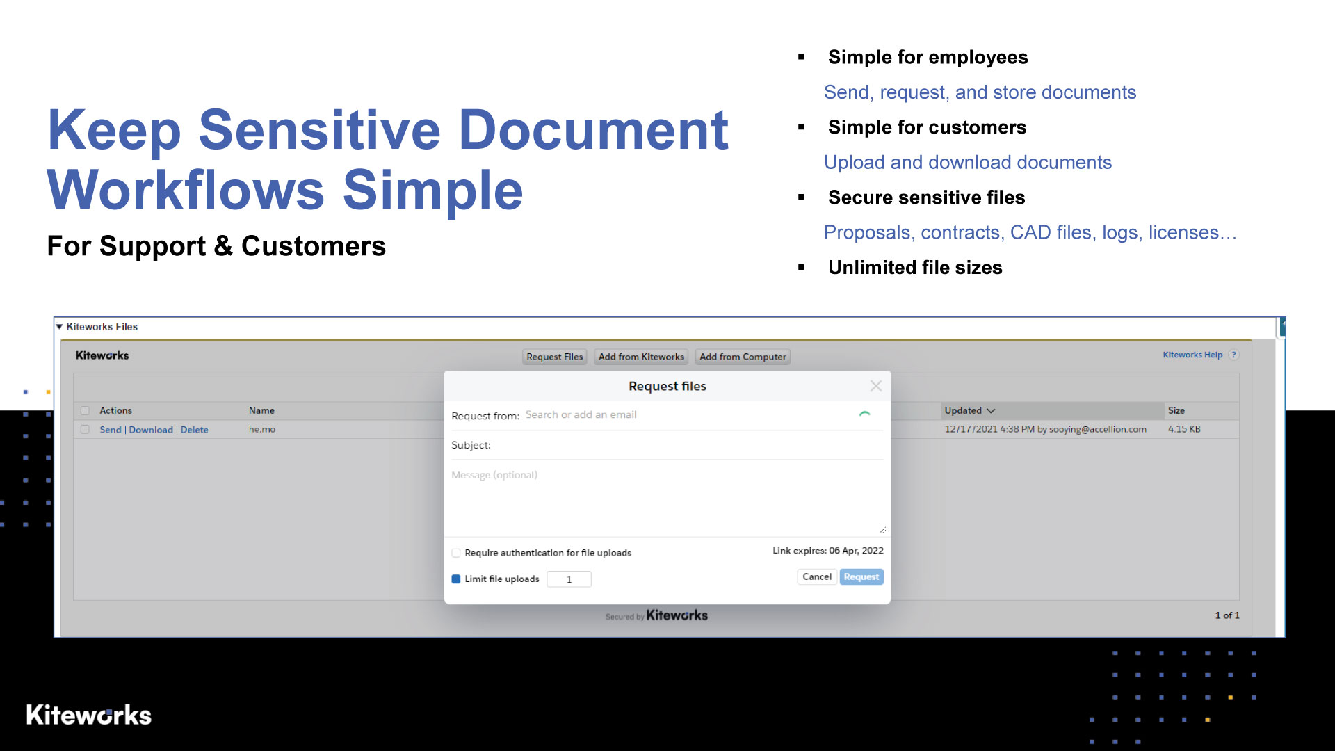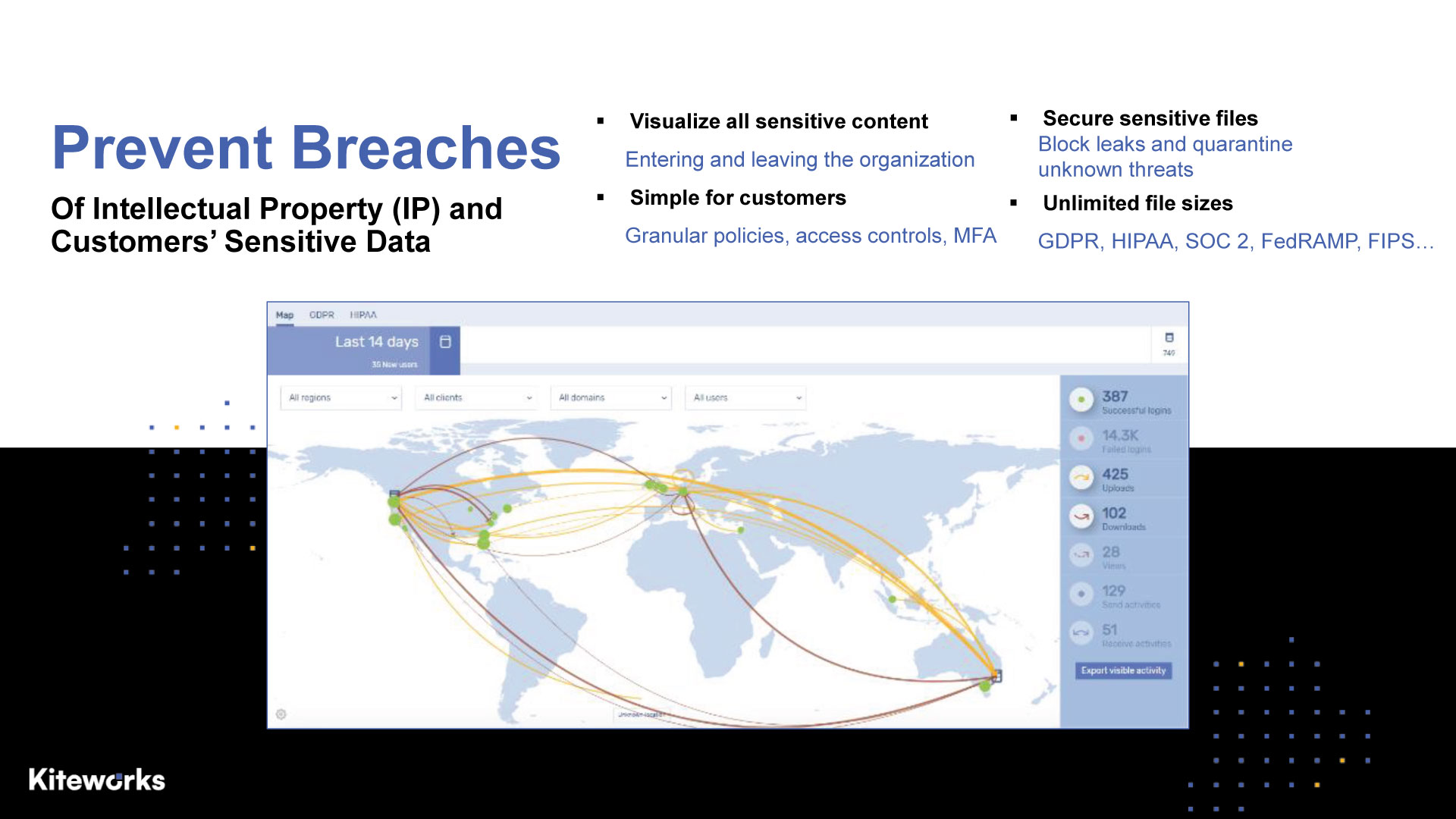 ProductivityKiteworks protects privacy and ensures compliance of all sensitive content sent via email, file share, automated file transfer, APIs, and web forms with one platform. ####Free Trial: Click Watch Demo to get hands-on now!
