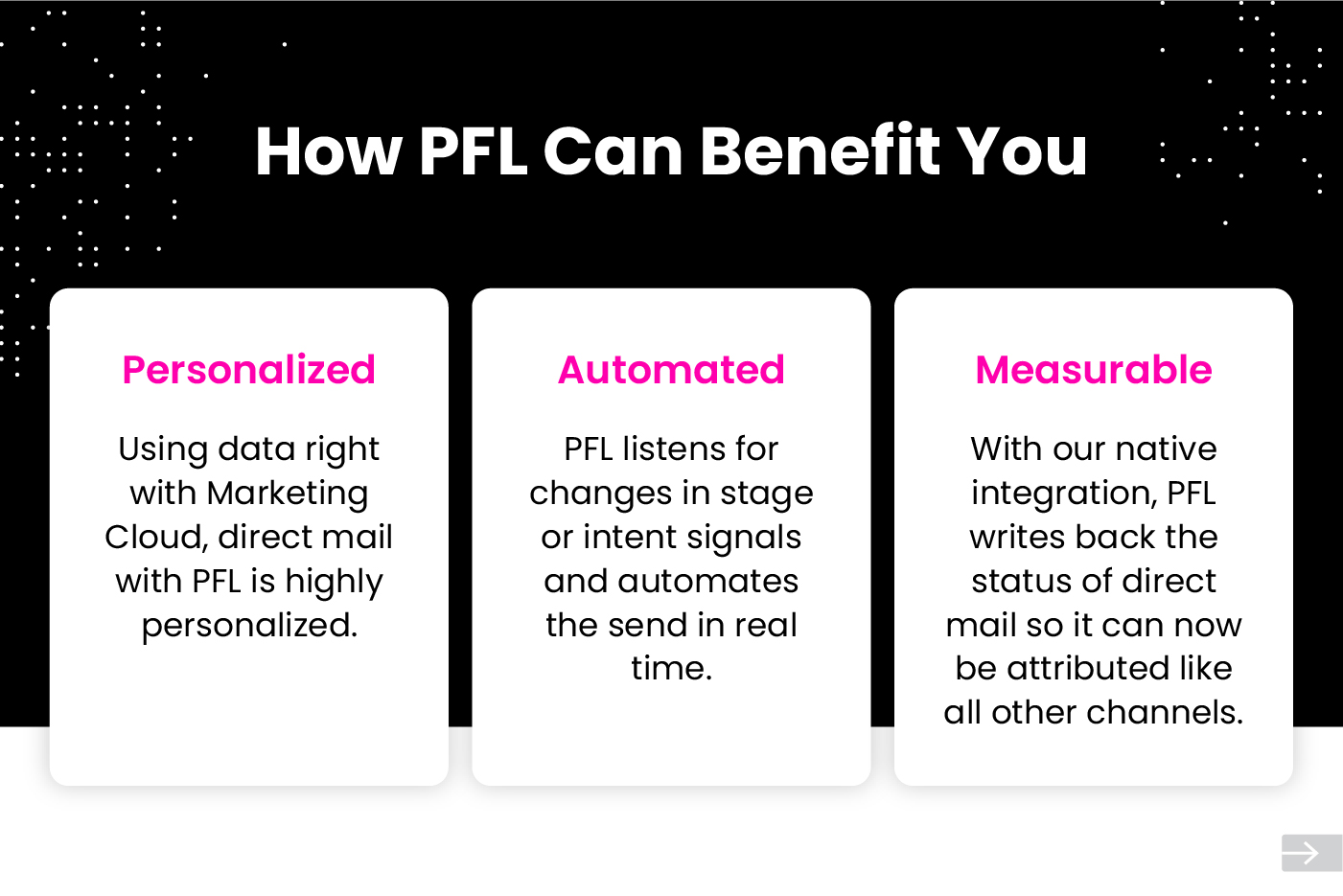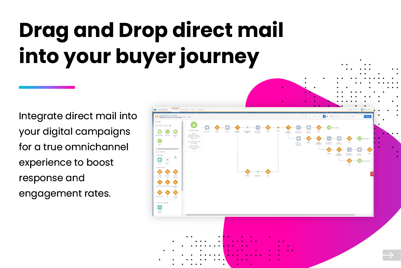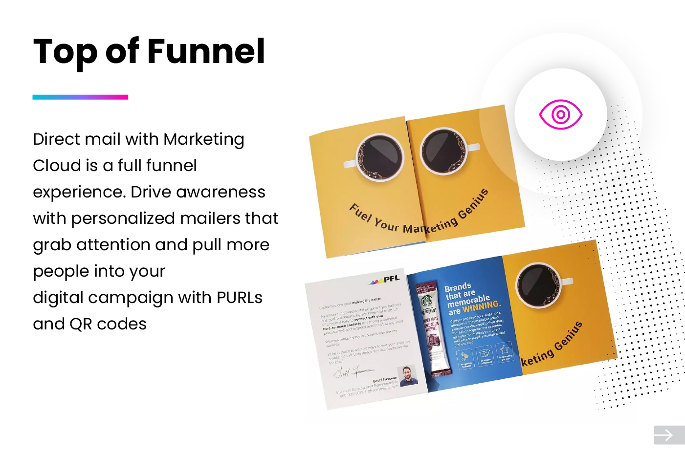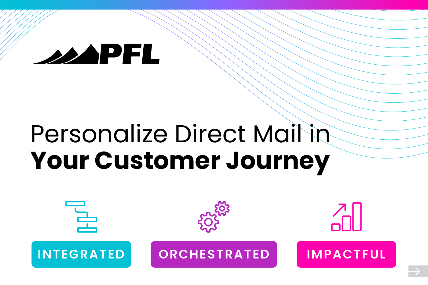 Trigger direct mail from journey builder as part of your buying journey. Modern direct mail is automated, personalized, and measurable when integrated with your Marketing Cloud. PFL delivers personalized direct mail to the right person at the right time.