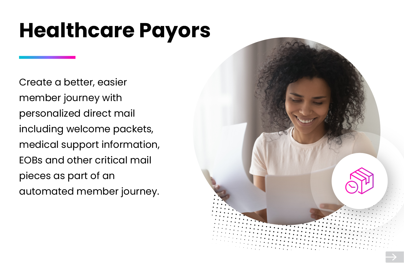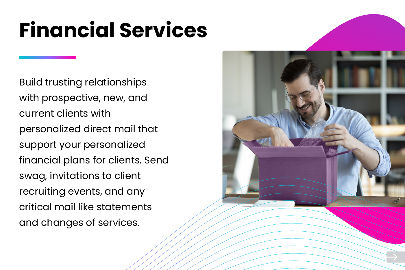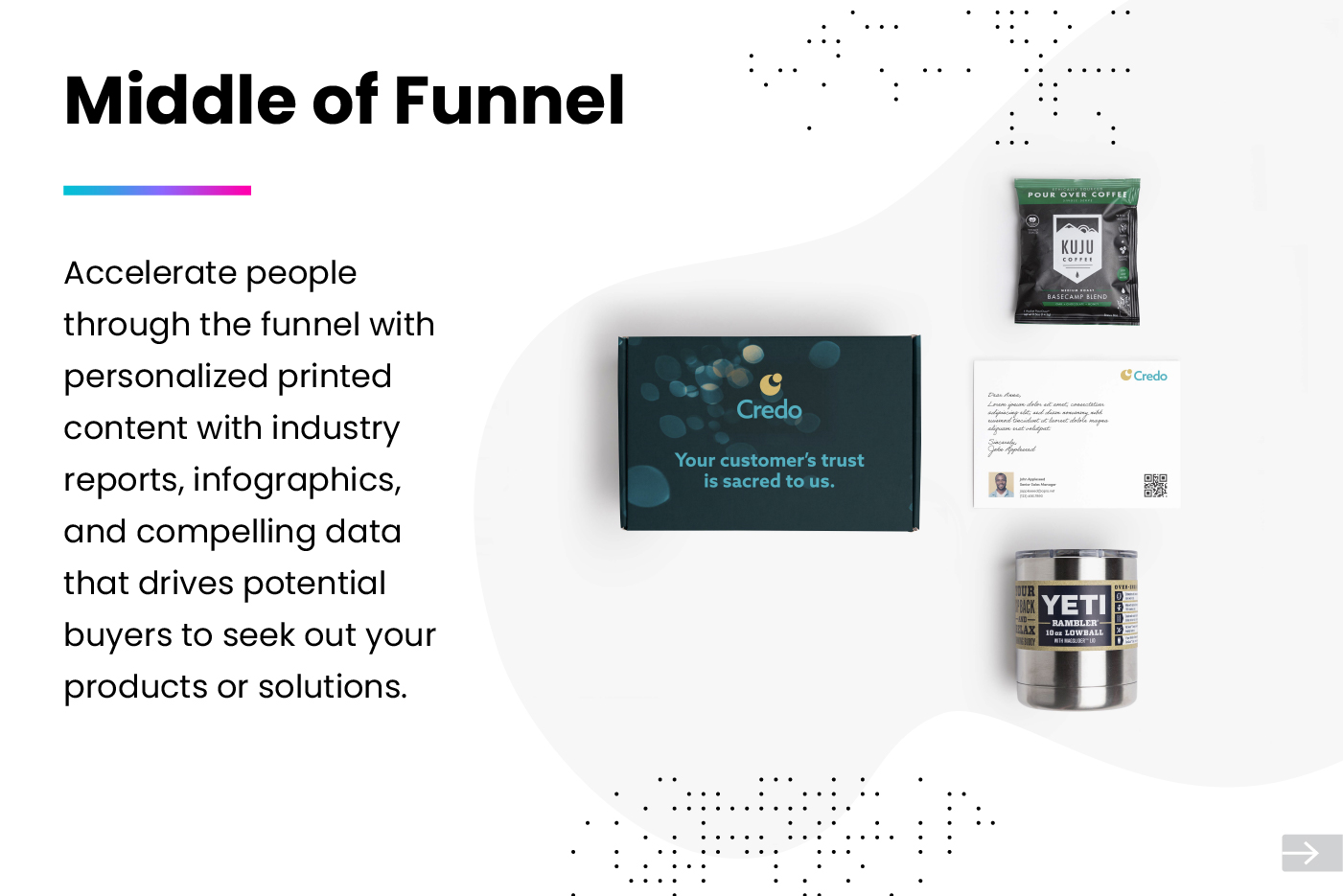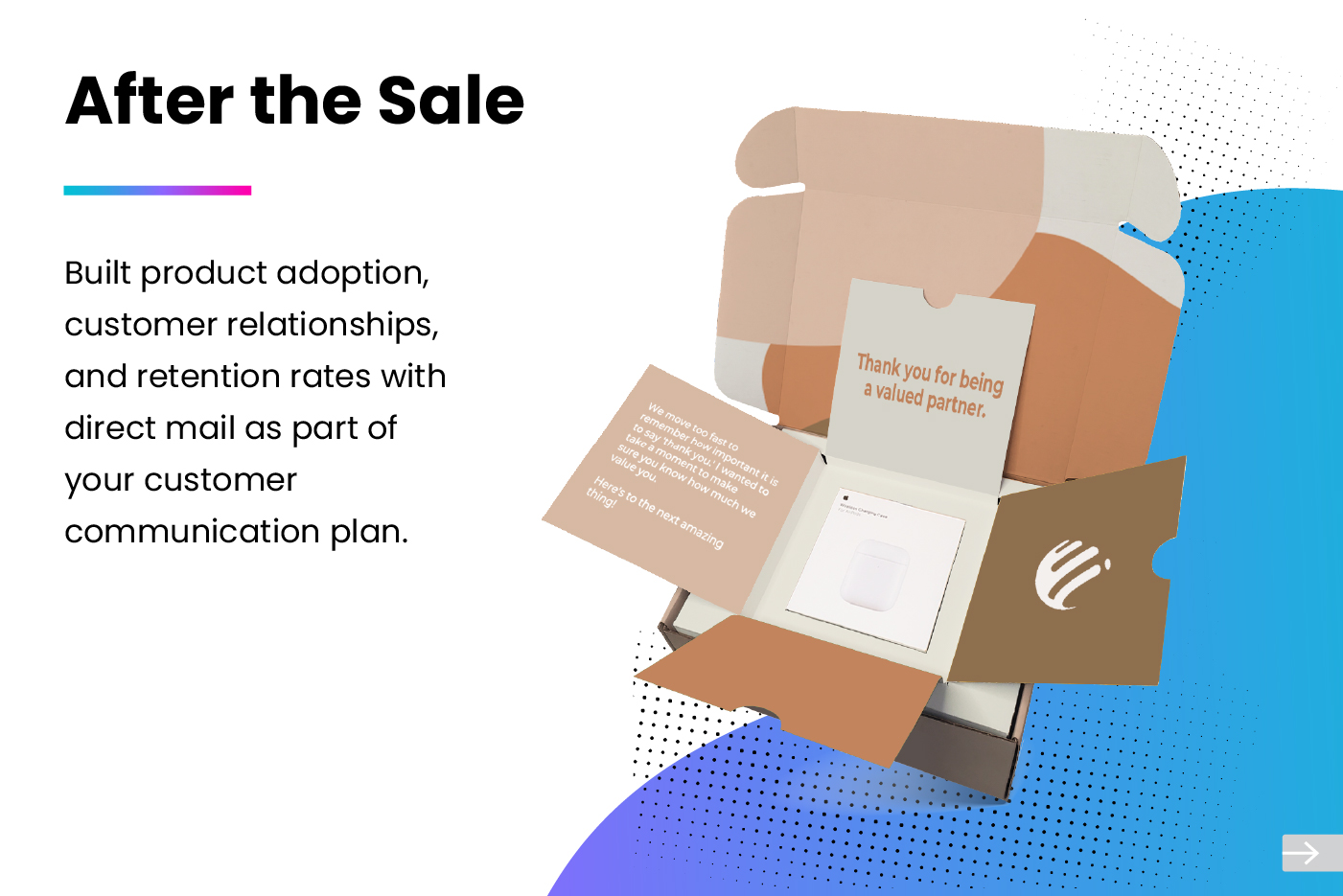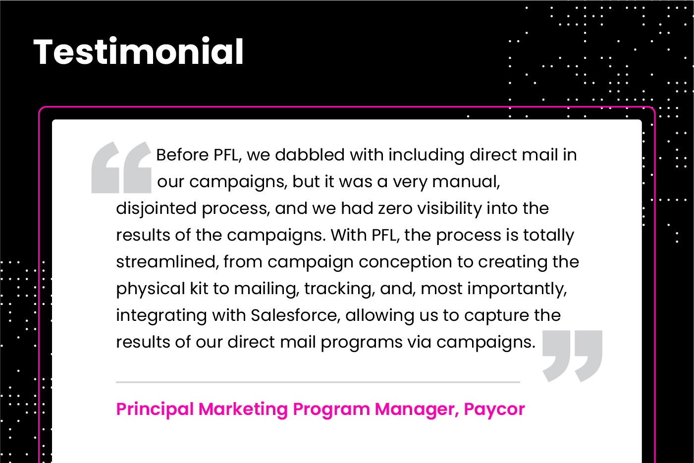 Trigger direct mail from journey builder as part of your buying journey. Modern direct mail is automated, personalized, and measurable when integrated with your Marketing Cloud. PFL delivers personalized direct mail to the right person at the right time.