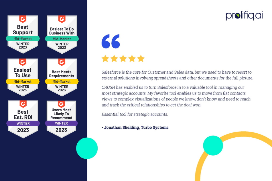 This Subscription Agreement (“Agreement”) is between Prolifiq Software Inc., an Oregon corporation, (“PROLIFIQ”) and the person or entity (“Customer”) who has ordered use of the PROLIFIQ online suite of software tools and services (the “Services”) that are available in connection with this Agreement. It constitutes the complete agreement between the parties regarding the Services, and supersedes all prior or contemporaneous agreements or representations, written or oral, concerning that same subject matter. Any modifications to this Agreement must be in writing signed by a duly authorized representative of both parties. ####PLEASE READ THIS SUBSCRIPTION AGREEMENT CAREFULLY BEFORE USING THE SERVICES. BY ENABLING USE OF THE SERVICES IN YOUR SALESFORCE.COM (“SFDC”) ACCOUNT THROUGH THE APPEXCHANGE, YOU ARE AGREEING TO THIS AGREEMENT. IF YOU ARE USING THE SERVICES ON BEHALF OF A COMPANY OR OTHER LEGAL ENTITY, YOU REPRESENT THAT YOU HAVE THE AUTHORITY TO BIND SUCH ENTITY TO THIS AGREEMENT, IN WHICH CASE THE TERMS “YOU” OR “YOUR” SHALL REFER TO SUCH ENTITY. IF YOU DO NOT HAVE SUCH AUTHORITY, OR IF YOU DO NOT UNCONDITIONALLY AGREE TO THIS AGREEMENT, YOU MUST DISABLE THE SERVICES, AND YOU WILL NOT HAVE ANY RIGHT TO USE THE SERVICES. ####TERMS AND CONDITIONS####Prolifiq provides the Services via the Customer’s SFDC AppExchange platform (the “Platform”). Any use of the Services is subject to the Customer maintaining an appropriate account with SFDC. All Customer data is stored on the Platform and PROLIFIQ has no access to such data. Any use of the Services is subject to this Agreement, which together with the Orders (defined below) form a separate agreement between PROLIFIQ and the customer listed on the Order (the “Customer”).####1. Ordering. Customer and PROLIFIQ may from time-to-time enter into orders for the Services on a form provided by PROLIFIQ (each, an “Order”), and any such Order shall be governed by this Agreement. This Agreement governs any conflicts between it and any Order. Any additional provisions that Customer may add to a purchase order or similar ordering document are hereby rejected.##2. Services; Applications. In exchange for payment of the fees listed on the Order (“Fees”) and subject to the restrictions listed below in Section 3 and any listed in the Order, Customer may have the number of Users authorized by the Order access and use the Services listed on the Order for the duration of the time period listed in the Order (the “Subscription Period”). A “User” means a specific individual identified by Customer who is an employee, contractor, consultant, or agent of Customer or any Affiliate of Customer, who is authorized by the Customer to use the Platform and who is authorized by the Customer to use the Services on Customer’s behalf. “Affiliate” means any corporation, firm, partnership or other entity that directly or indirectly controls, or is controlled by, or is under common control with Customer. Some of the Services may be provided through proprietary software applications (“Applications”). Subject to this Agreement and during the Subscription Period, PROLIFIQ grants to Customer a limited, non-exclusive, worldwide, non-transferable, non-sublicensible license to install the Applications onto Customer’s Platform instance and onto User desktops, laptops, smartphones, tablets, and other mobile devices, and to have the Users use the Applications to access and use the Services. Together, the Services and Applications are “PROLIFIQ Technology.” PROLIFIQ will use all commercially reasonable efforts to ensure that the Services are available for lawful use in accordance with the terms of this Agreement during the term of each Order at all hours of the time that the Platform is available to Customer, excluding (a) the time during initial installation of the Applications or installation of upgrades to the Applications, (b) planned downtime (of which PROLIFIQ shall give advance electronic notice), (c) any unavailability caused by circumstances beyond the reasonable control of PROLIFIQ, including without limitation any force majeure event as set forth in Section 14.6 below, or (d) any downtime caused by any act or omission of Customer or its Users or any breach or non-compliance by Customer of the terms of this Agreement.##3. Restrictions. Other than as allowed by this Agreement, Customer will not: (a) allow any person who is not a User access or use the Services through any means; (b) reverse engineer, decompile, disassemble or otherwise attempt to discover the source code of or trade secrets embodied in the Services or the Platform or to modify, copy or create derivative works based on the Services or any part, feature, function or user interface thereof; (c) distribute, transfer, sell, resell, rent, grant sublicenses, or otherwise make available the Services to third parties (including as an application service provider, service bureau, or rental source); (d) embed or incorporate in any manner the Services into websites other than the Platform; (e) except as enabled by an application programming interface released by PROLIFIQ, create add-ons, plug-ins, extensions, modifications to or derivative works of the Services; (f) use the Services in a manner not authorized under the documentation and knowledge base for the Services as set forth at www.prolifiq.com or as provided to Customer at the time of installation, as updated from time to time (“Documentation”) or the Platform or in violation of any applicable law, rule or regulation, including any export/import laws; or (g) in any way access or use the Services to directly or indirectly develop, promote, distribute, sell or support any product or service that is competitive with the Services. Other than as stated in Section 2, PROLIFIQ reserves all right, title and interest in the PROLIFIQ Technology. The PROLIFIQ Technology uses the patents listed on the PROLIFIQ 