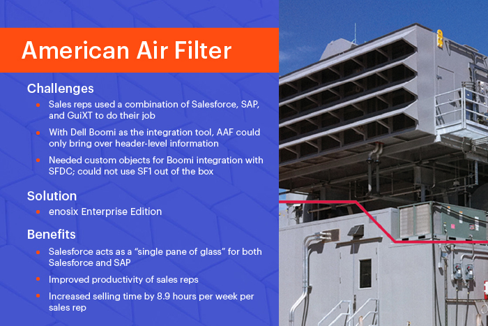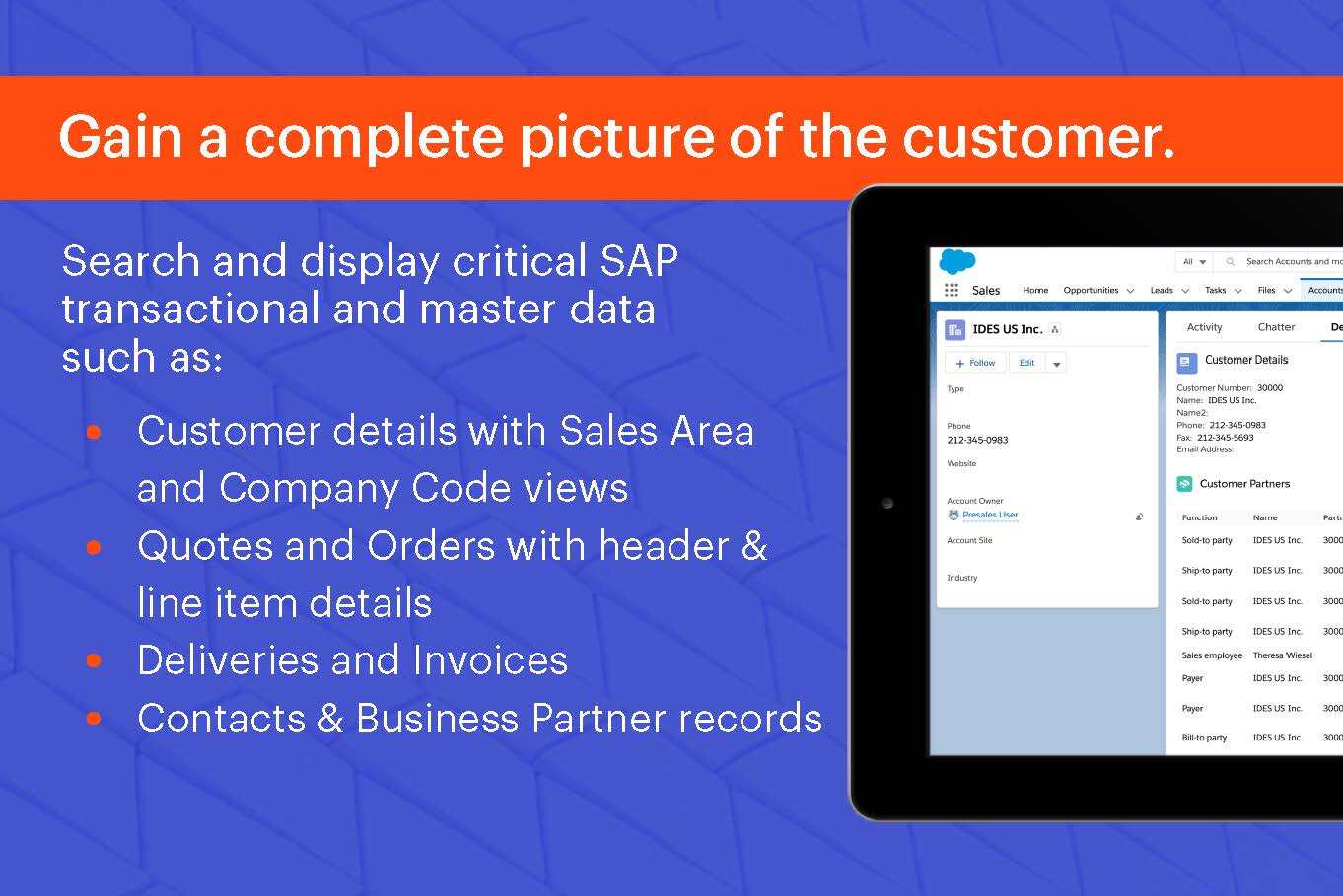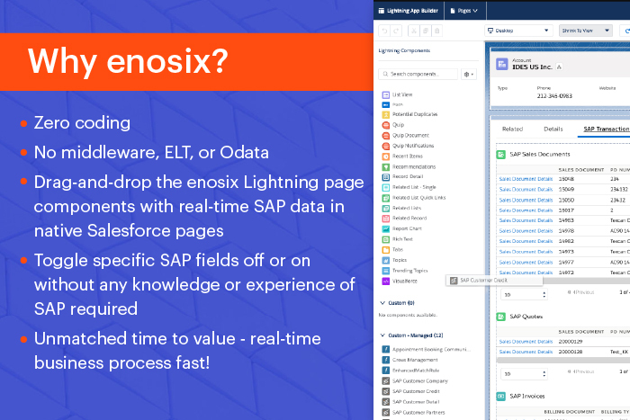 ManufacturingOur SAP integration delivers real-time SAP data and business process in Salesforce without complex front-end coding or middleware. Our pre-built, Salesforce-native solutions provide customer info, order, quote and delivery history, SAP pricing, and more.