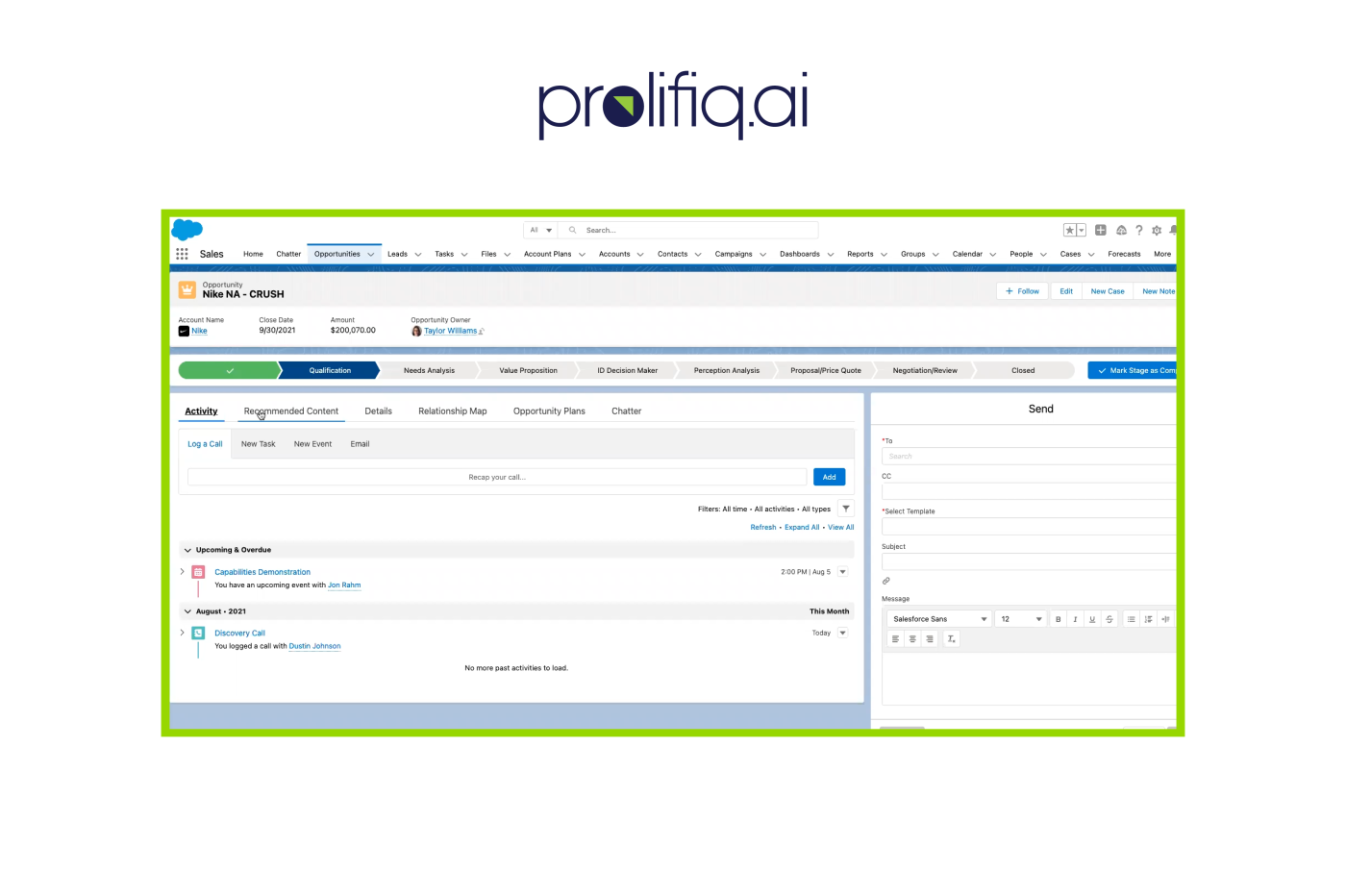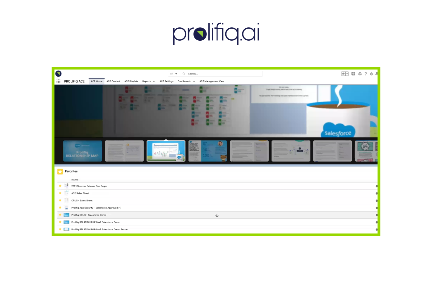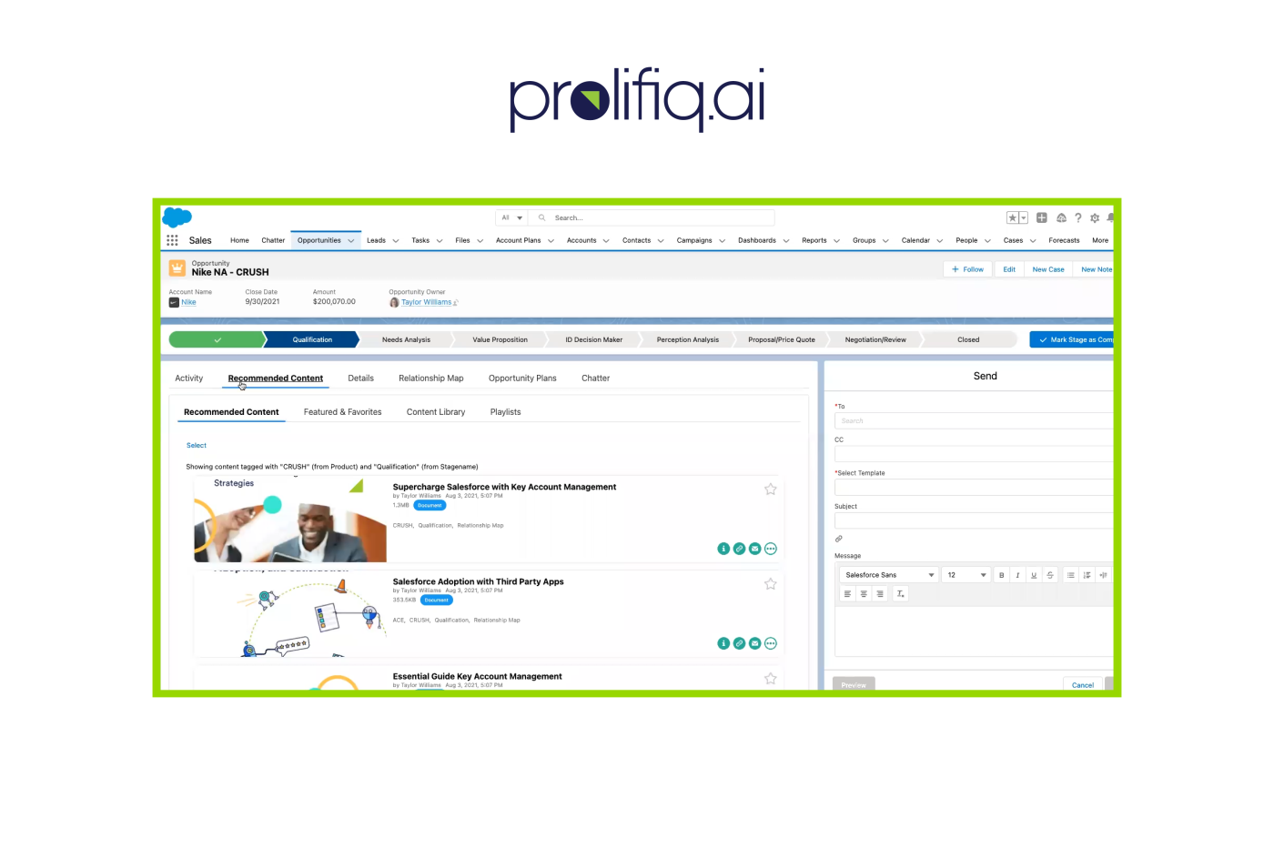 ProductivityEnable sales teams to easily distribute marketing approved content throughout the buying cycle natively in Salesforce. Leveraging smart content recommendations, version control, and playlists sellers can access the most up- to-date and relevant content.
