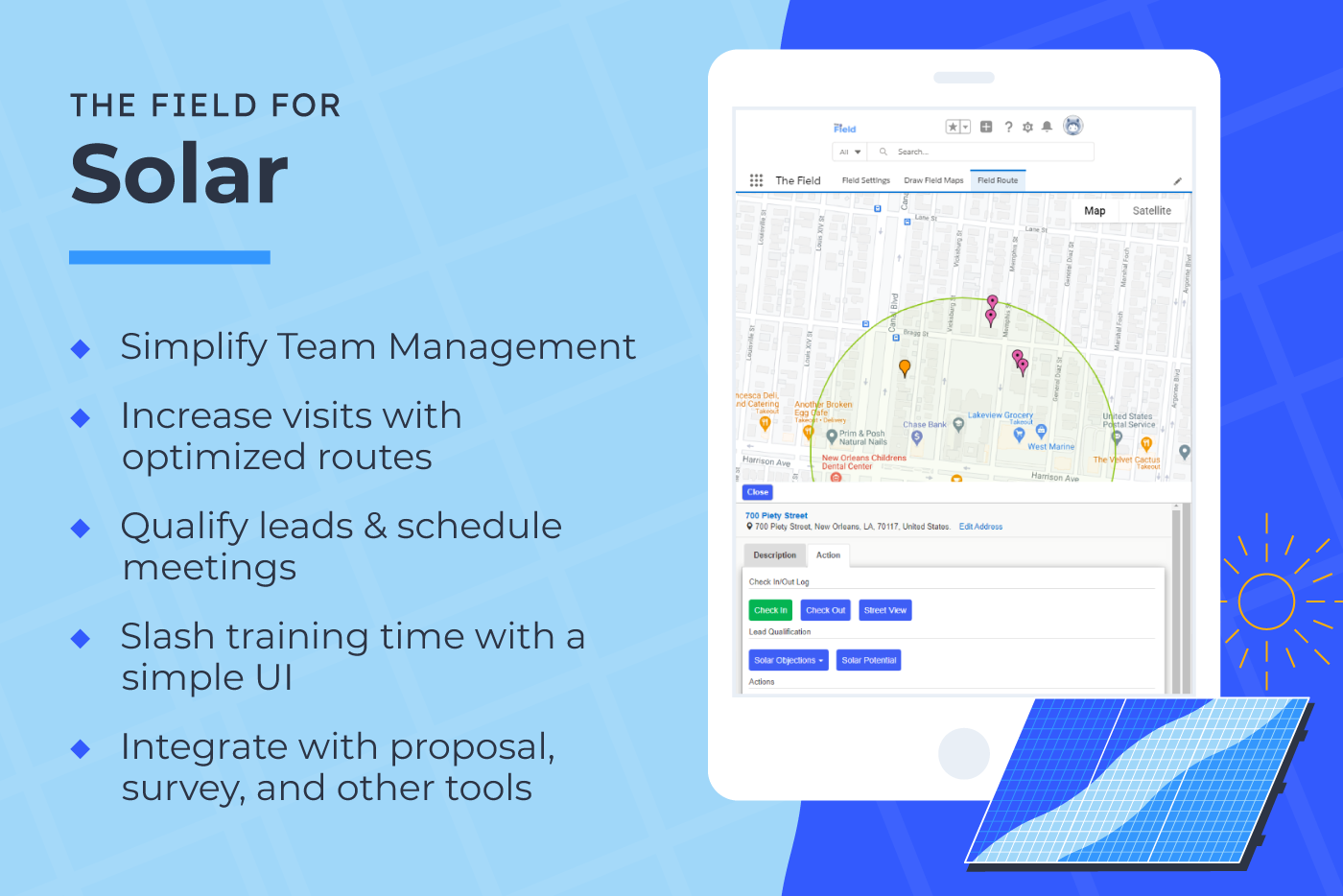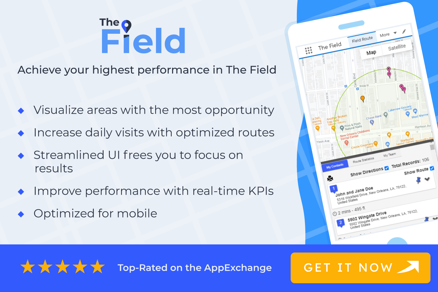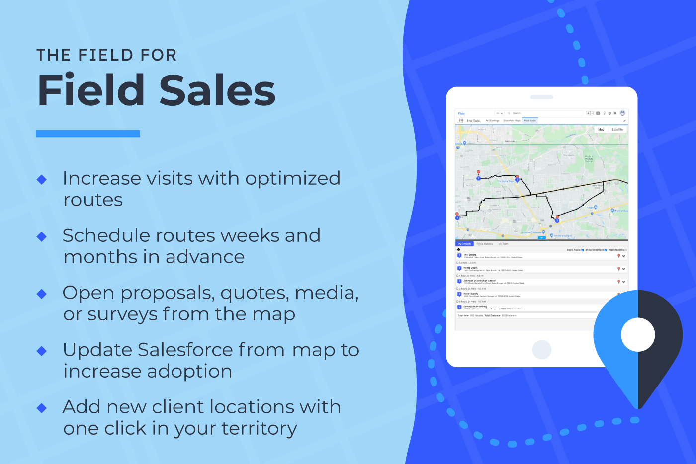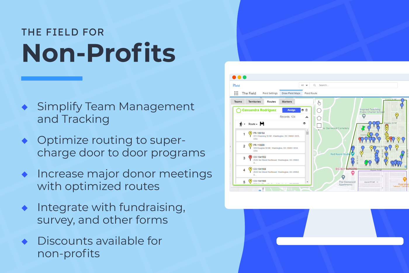 GeolocationWhether you're optimizing sales routes, recruiting donors, or contacting voters, The Field simplifies routing & territory management, integrating with fundraising, survey, and sales tools in your Salesforce.