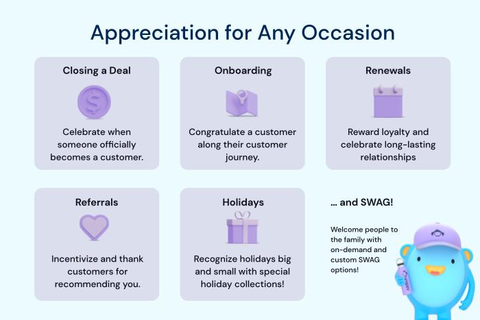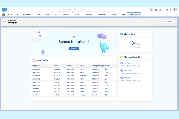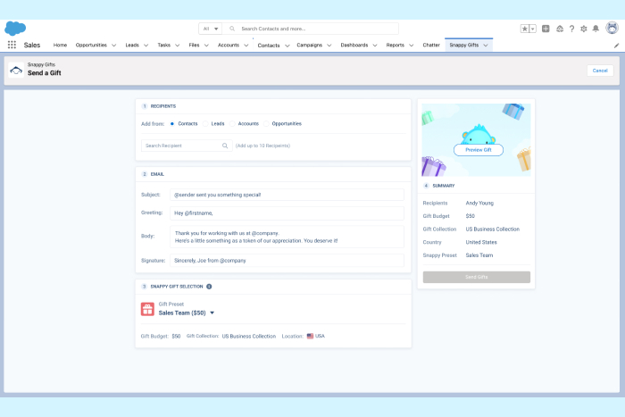 Deepen relationships and celebrate customer milestones by sending gifts to customers directly in Salesforce. Snappy helps customer success, and sales teams send physical gifts, sweets, treats, and branded swag directly from Salesforce.