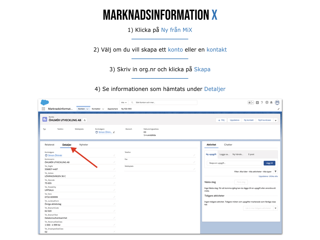 This Terms of Use Agreement ("Agreement") constitutes a legally binding agreement between you, whether personally or behalf of an entity ("you") and Öhlmér Utveckling AB, concerning your access to and use of the Marknadsinformatioon X application ("Application"). By accessing or using the application you agree to be bound by this agreement.####Öhlmér Utveckling AB cannot control the nature of all the content available in the application. Öhlmér Utveckling AB does not take responsibility for the following.####- Data from Marknadsinformation is correct.##- Data from Marknadsinformation is used according to law.##- Data from Salesforce does not get damaged in any way.##- Data from Marknadsinformation is saved correctly.##- Costs related to requests sent to Marknadsinfromation##- The agreement between you and Marknadsinformation.####For information about pricing and use of data, contact Marknadsinformation i Sverige AB.####Öhlmér Utveckling AB does not manage personal information.