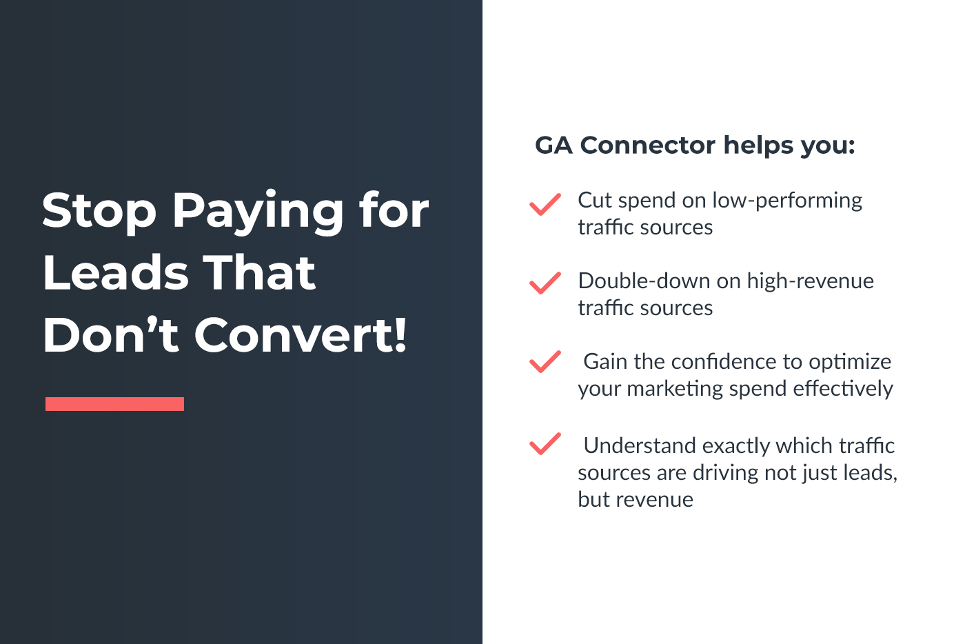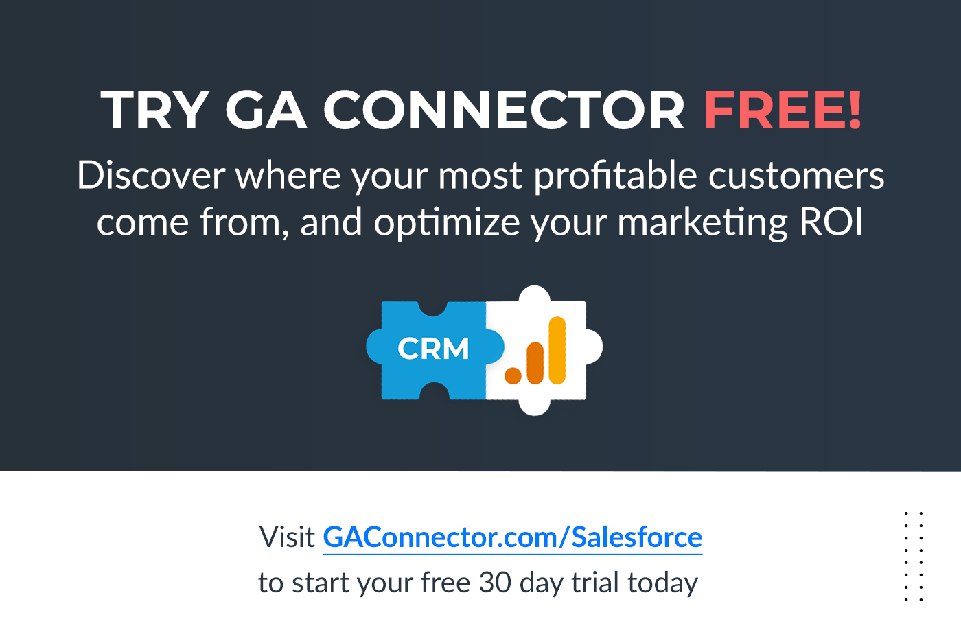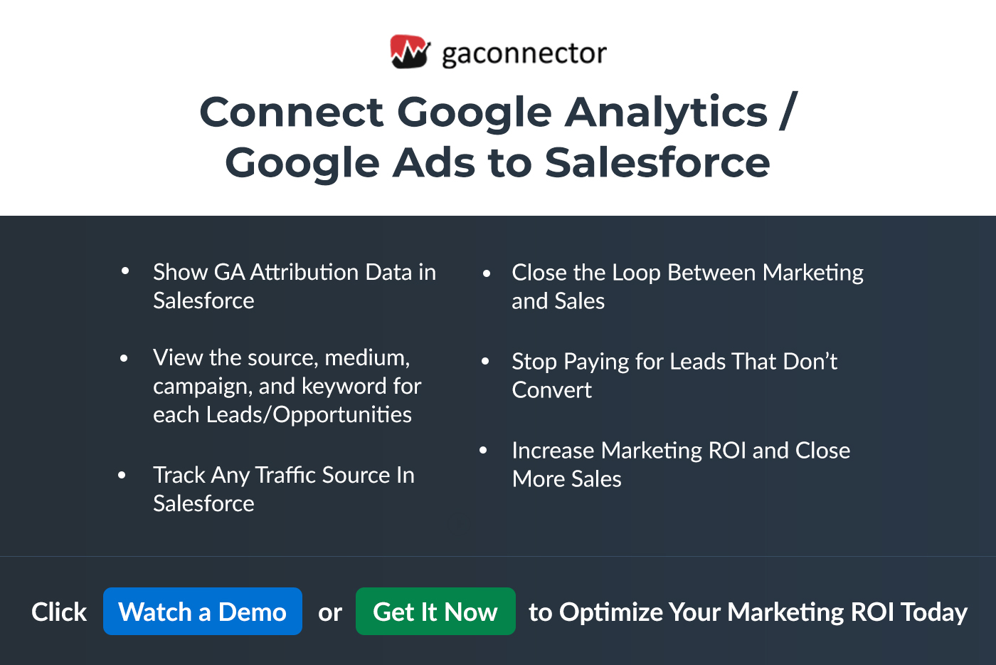 Sales IntelligenceStop paying for leads that don't convert! Learn which leads/opportunities generate revenue - and which are a waste of your marketing budget. Track marketing ROI without paying for a full-blown marketing attribution tool. ##► FREE TRIAL! GAConnector.com