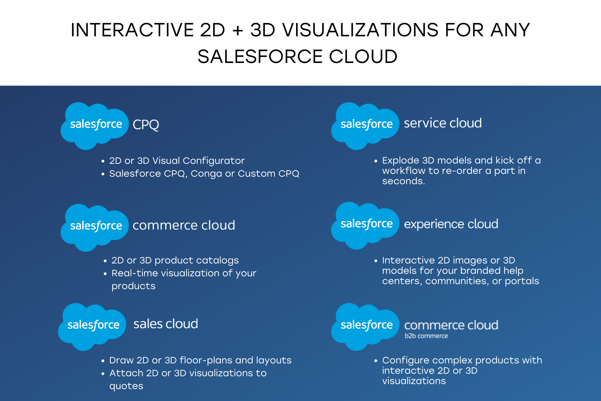 ManufacturingRenderDraw is 100% Salesforce-native and uses existing 2D product images/PDFs to create visual drag-and-drop configurators, retail planograms, and floor plans. 3D CAD or BIM drawings can also be used for real-time 3D visual configuration and self-service