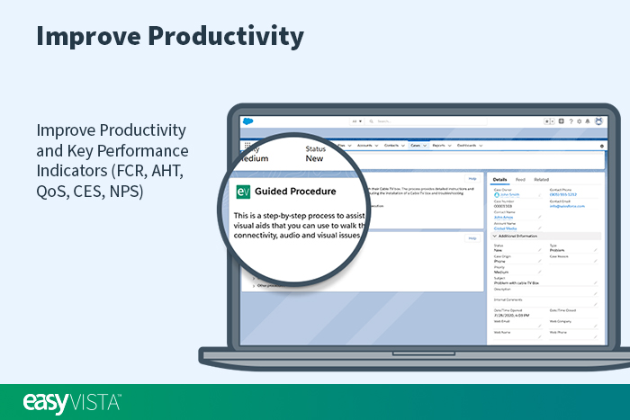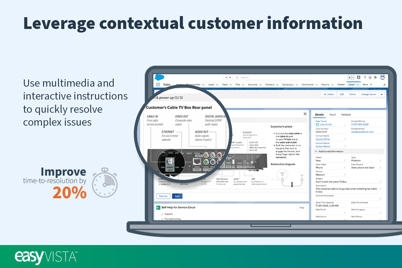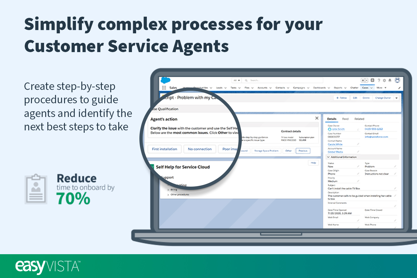 Agent ProductivityEasyVista Self Help for the Salesforce Service Cloud complements Salesforce Knowledge by providing data-driven interactive scripts to improve the handling of complex customer service issues.