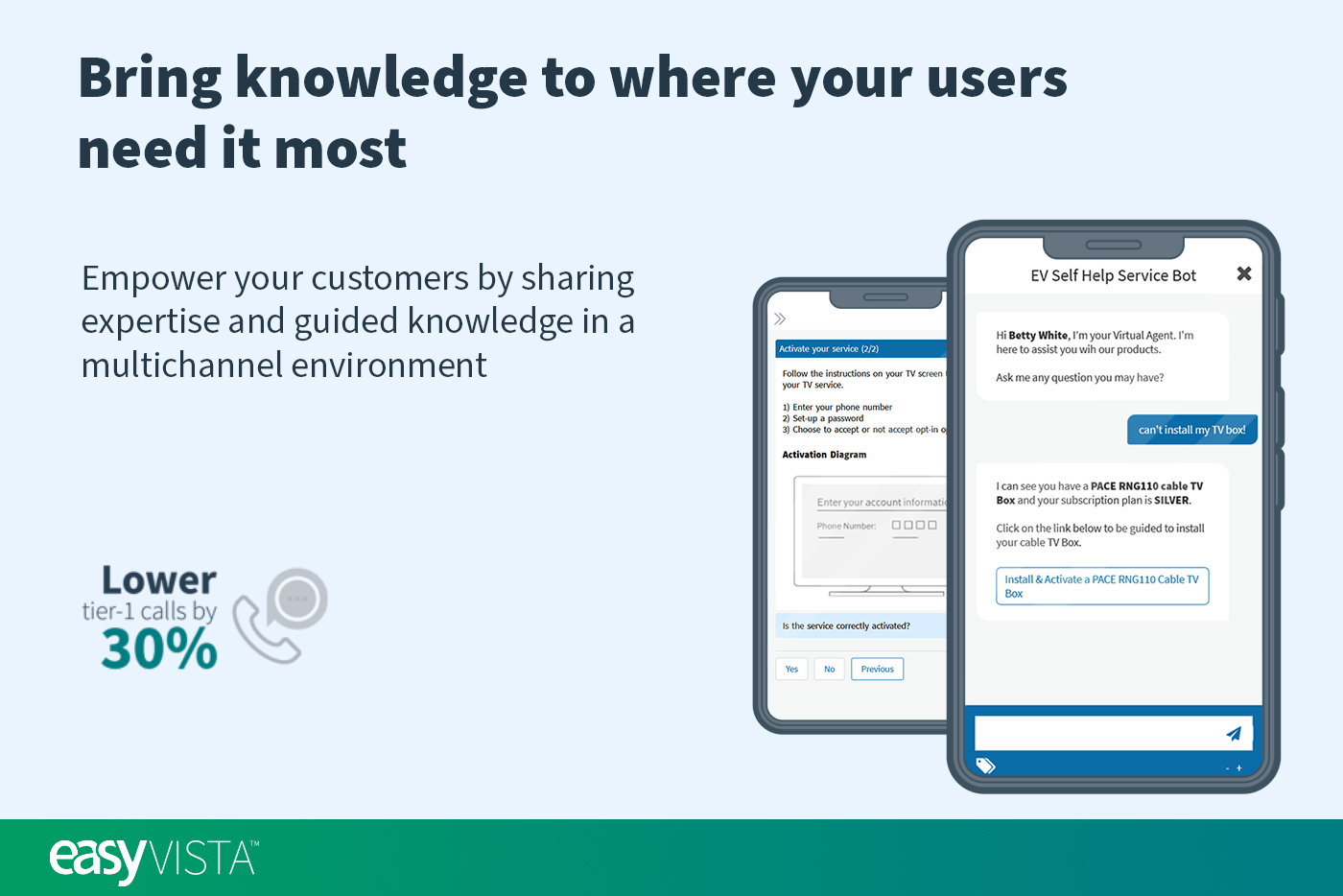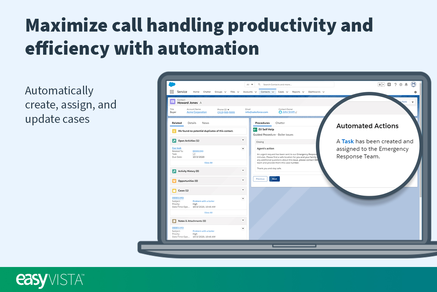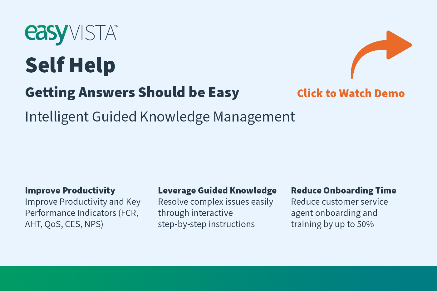 Agent ProductivityEasyVista Self Help for the Salesforce Service Cloud complements Salesforce Knowledge by providing data-driven interactive scripts to improve the handling of complex customer service issues.