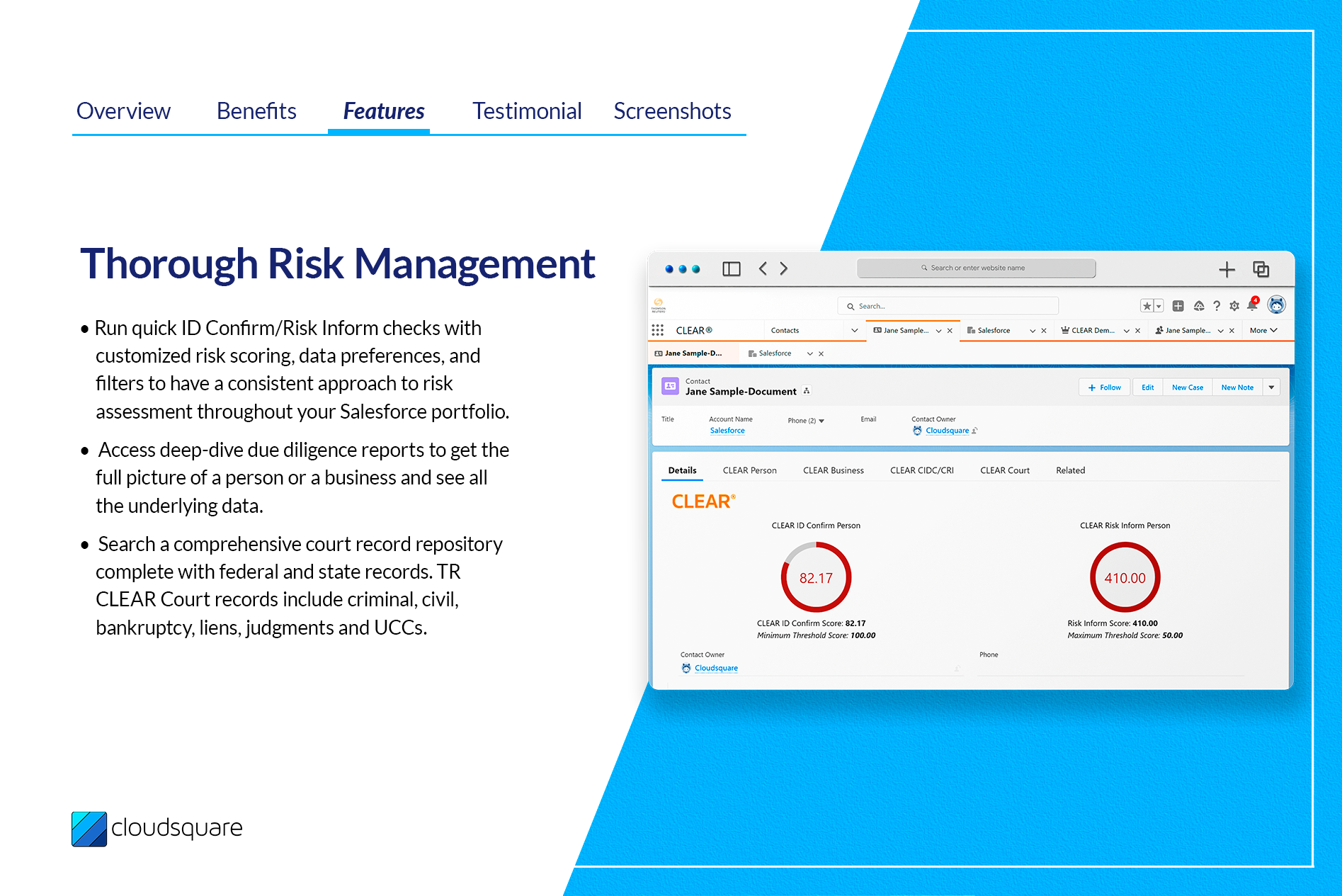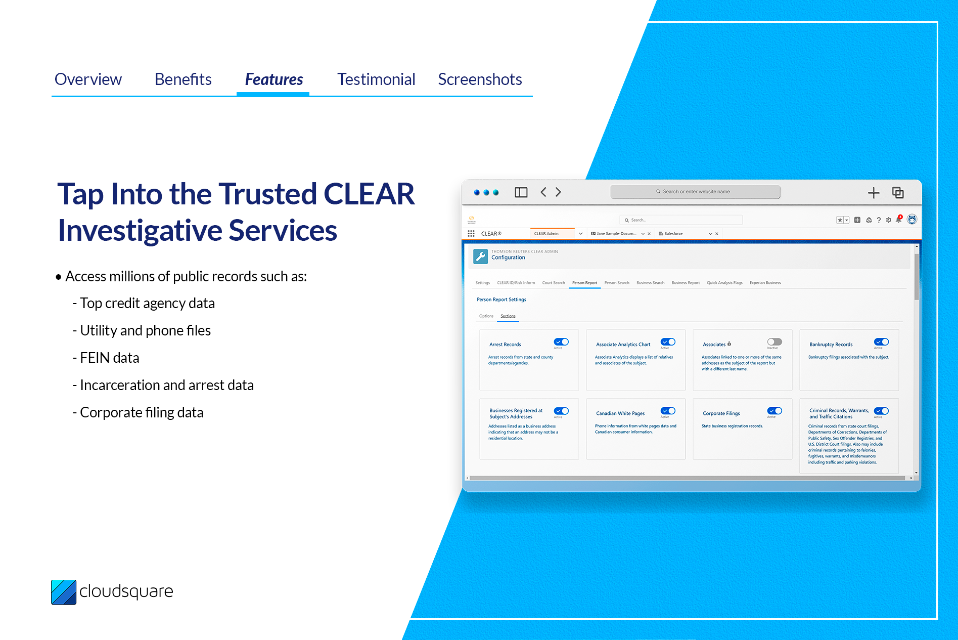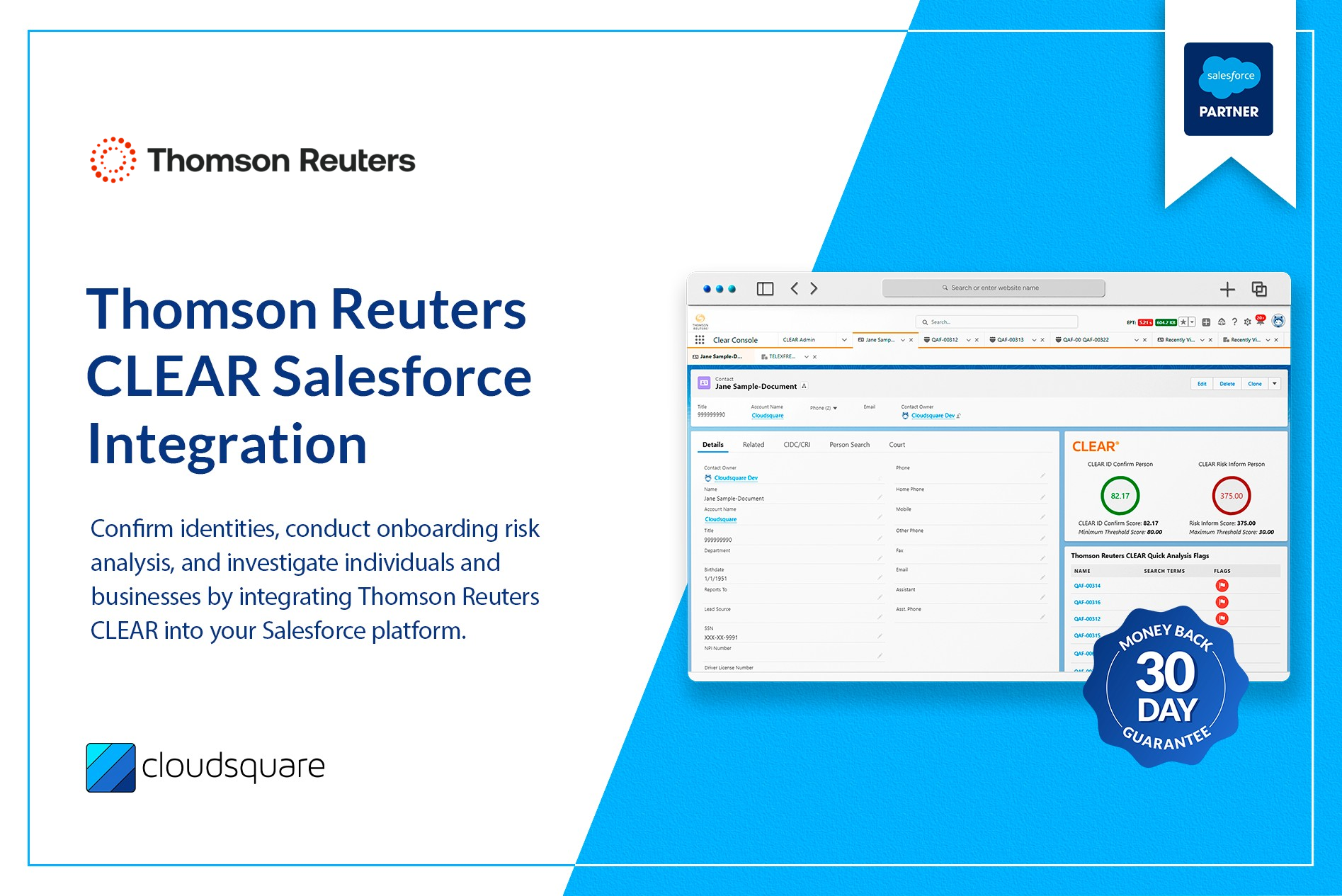 IntegrationImprove your investigative capabilities and optimize your Risk and Fraud solutions with Thomson Reuters CLEAR on Salesforce. Confirm identities, conduct onboarding risk analysis, and investigate individuals and businesses in a single environment