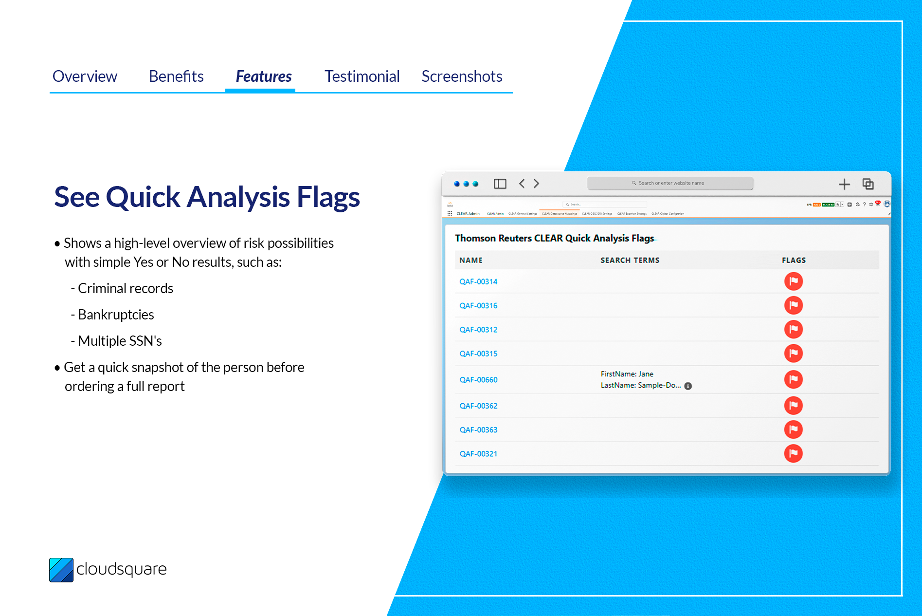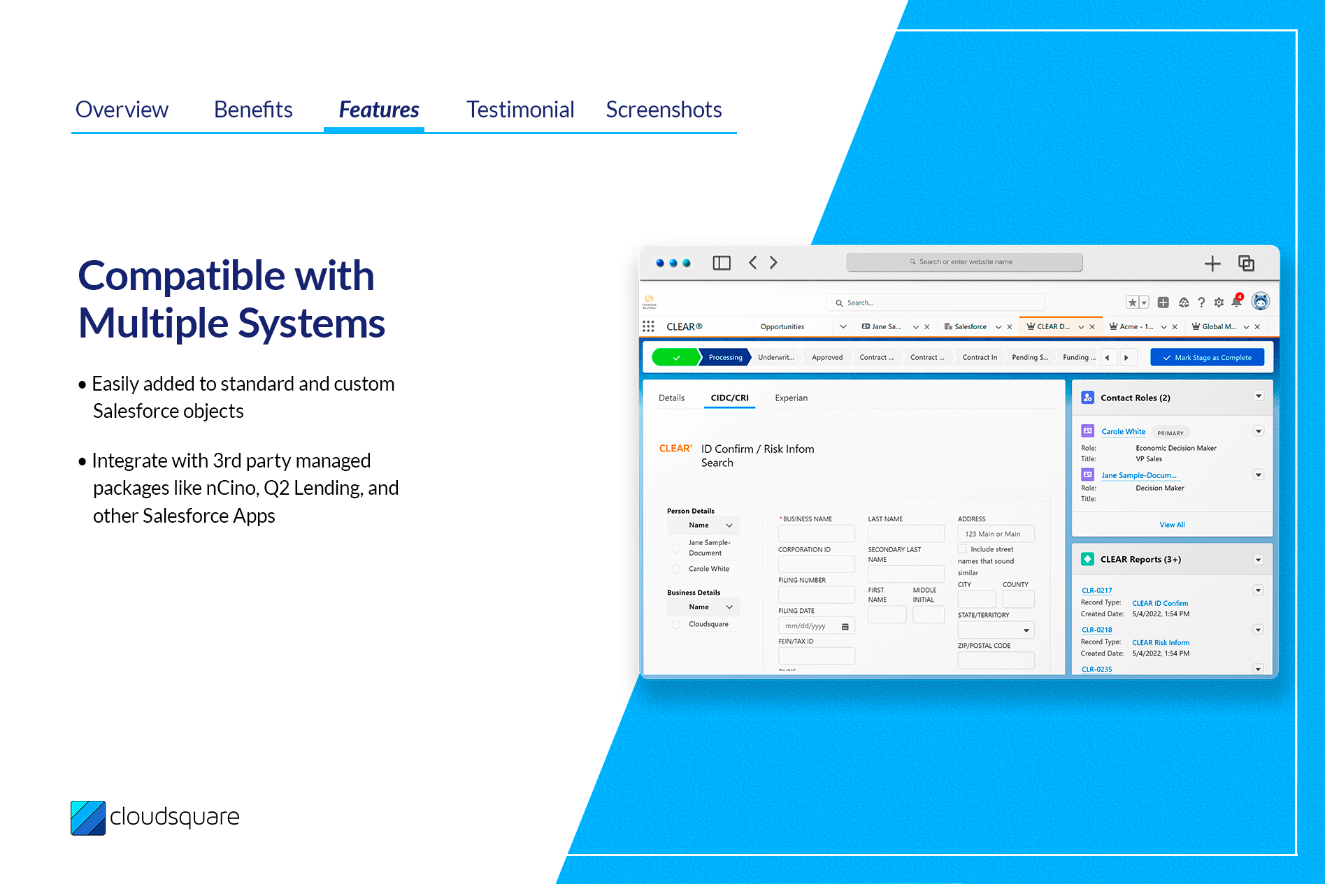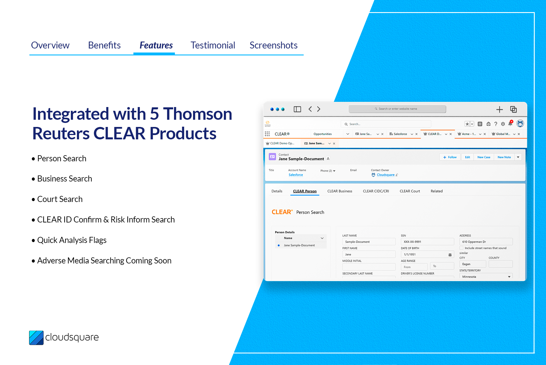 IntegrationImprove your investigative capabilities and optimize your Risk and Fraud solutions with Thomson Reuters CLEAR on Salesforce. Confirm identities, conduct onboarding risk analysis, and investigate individuals and businesses in a single environment