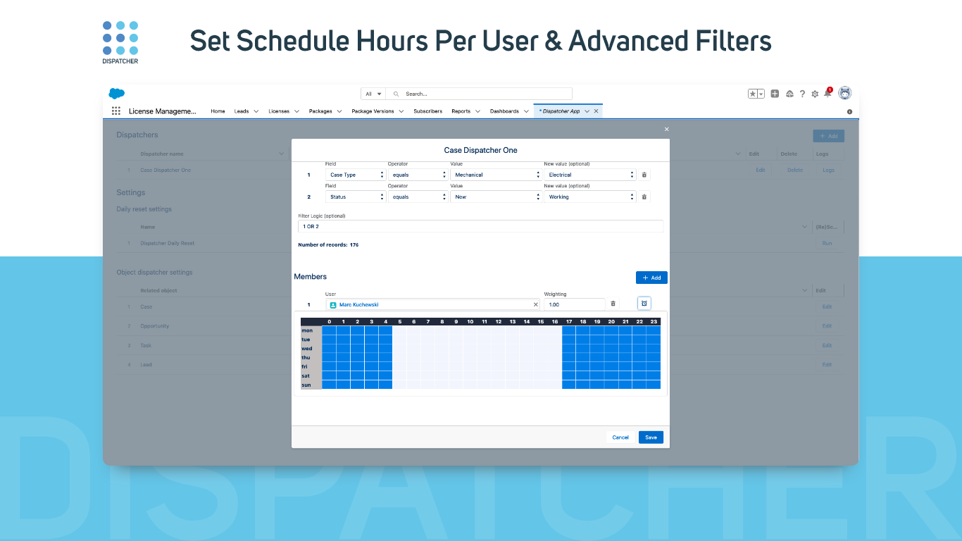 ProductivityEasily set assignment and routing rules for standard Salesforce objects Leads, Tasks, Cases, and Opportunities. Control the routing algorithm via Round Robin and weighted modes. Schedule users on an hourly basis.