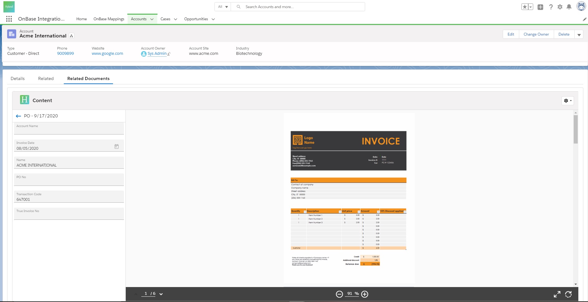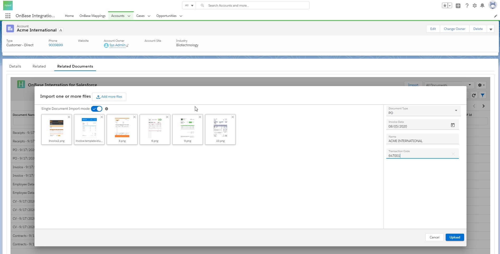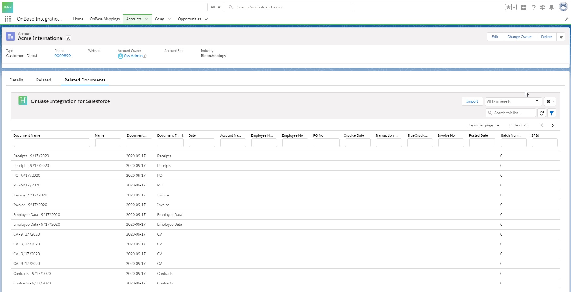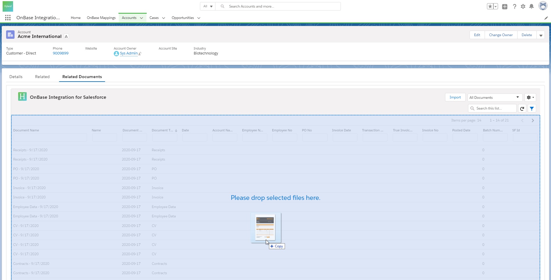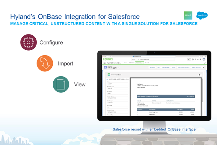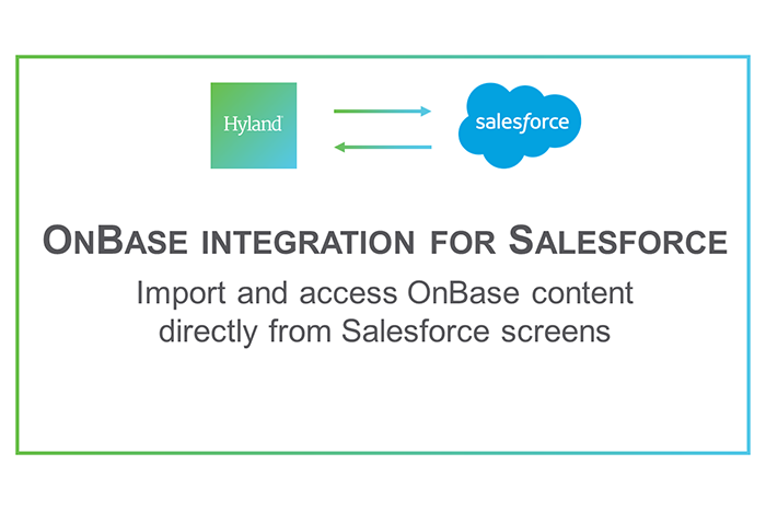 Document ManagementThe OnBase Integration for Salesforce combines Hyland’s industry-leading content management capabilities with the power of Salesforce, providing instant access to critical relationship data and content. Centralizes content for all industries.