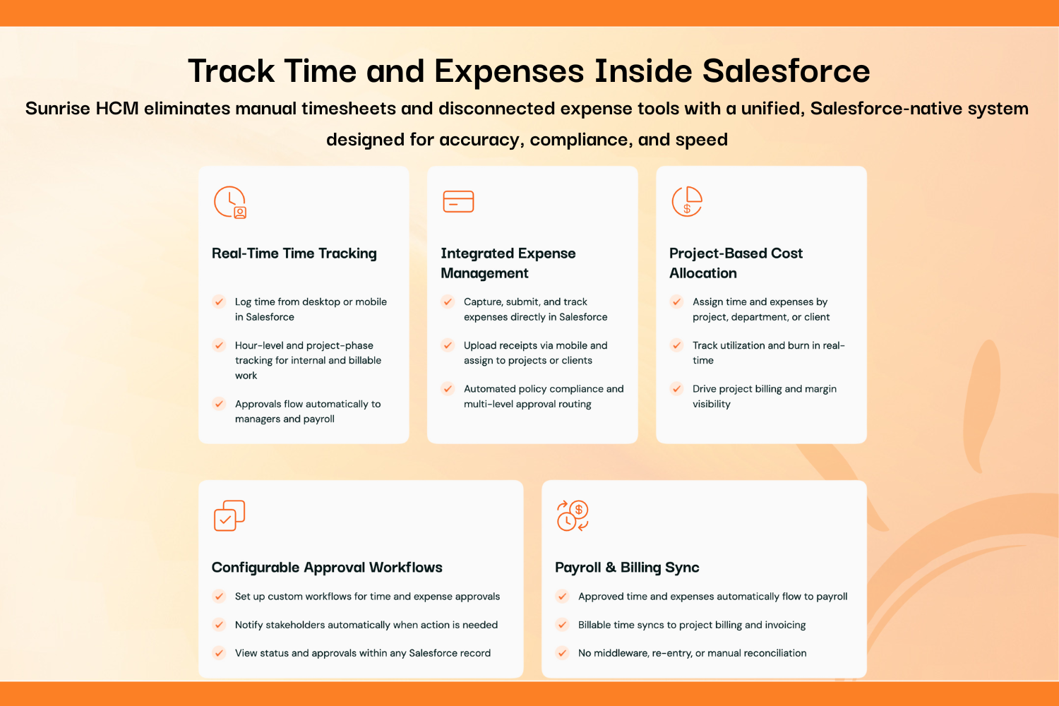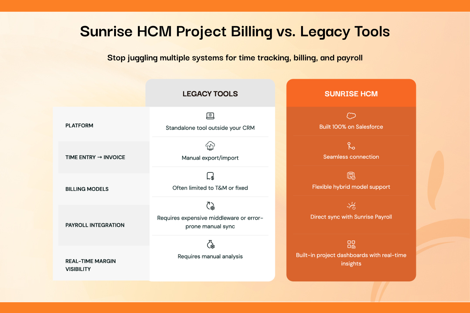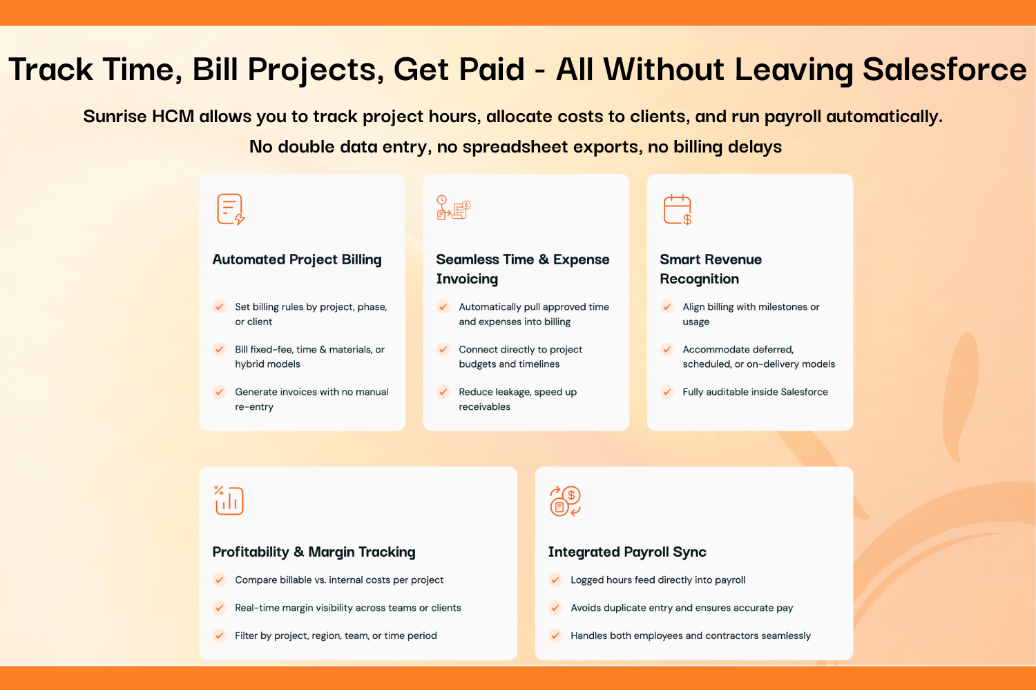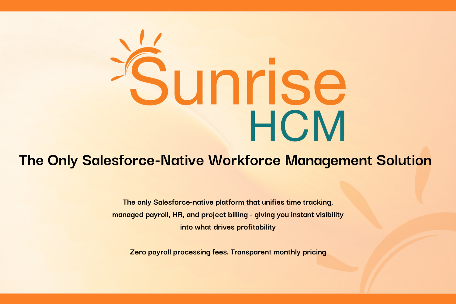 Human ResourcesEliminate data silos between your CRM, payroll, and billing. Sunrise HCM provides real-time visibility into project profitability, employee utilization, and labor costs - all native to Salesforce. Zero payroll fees. No middleware. One source of truth.