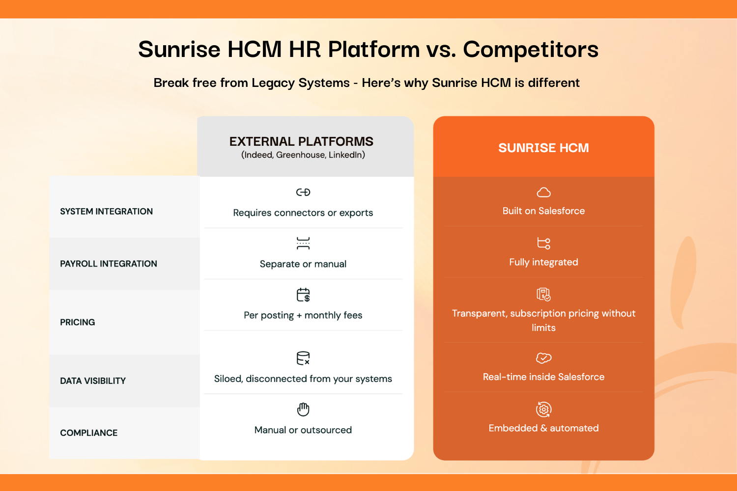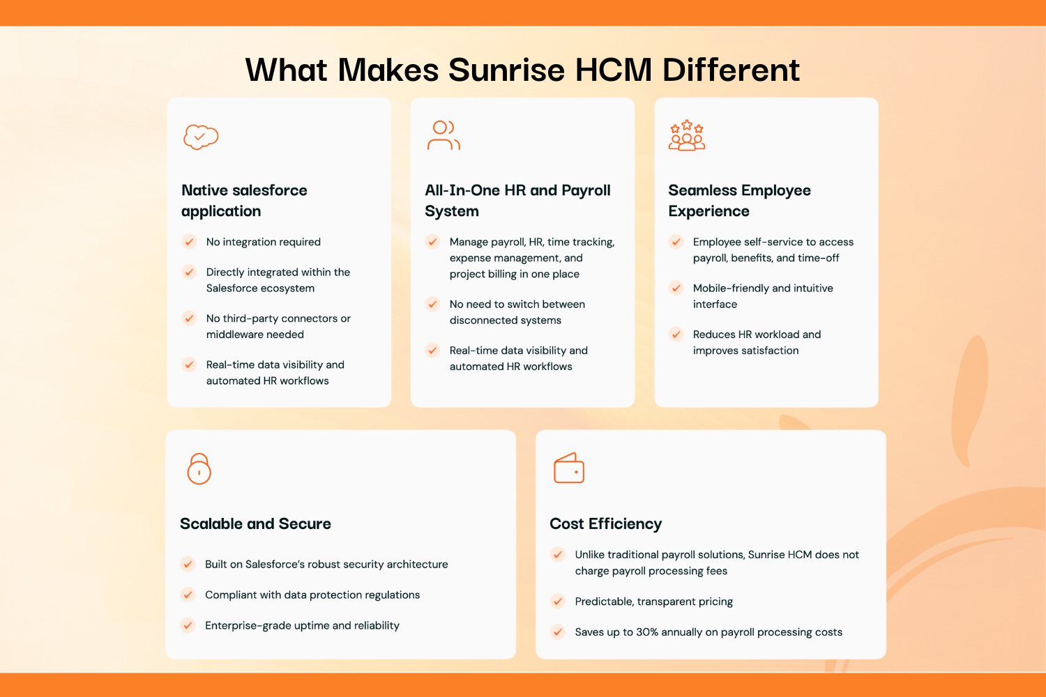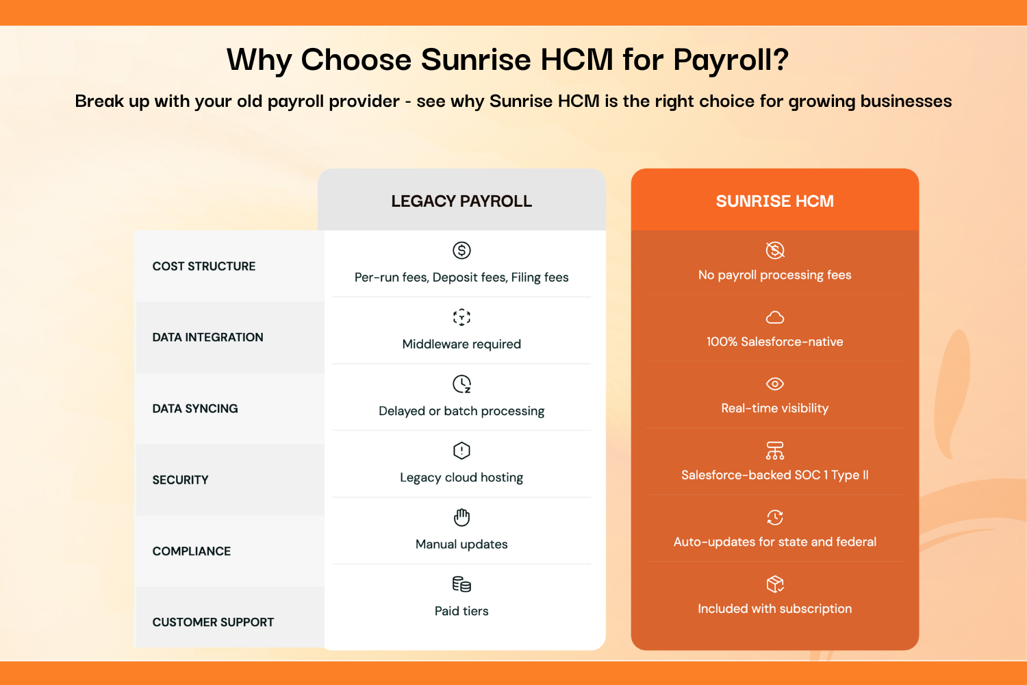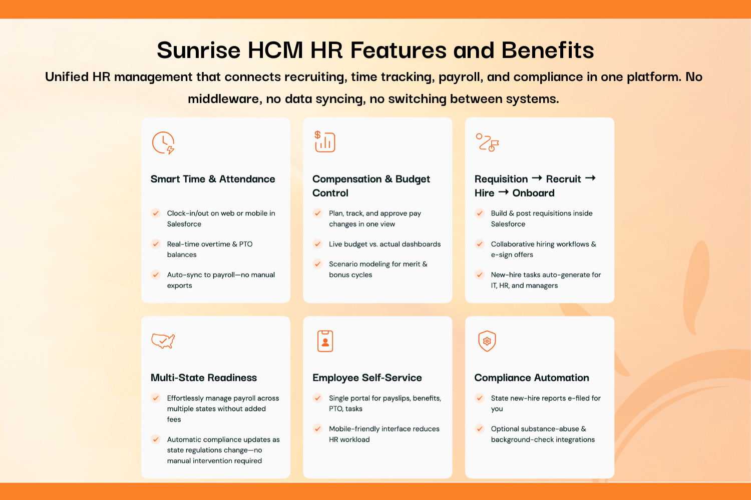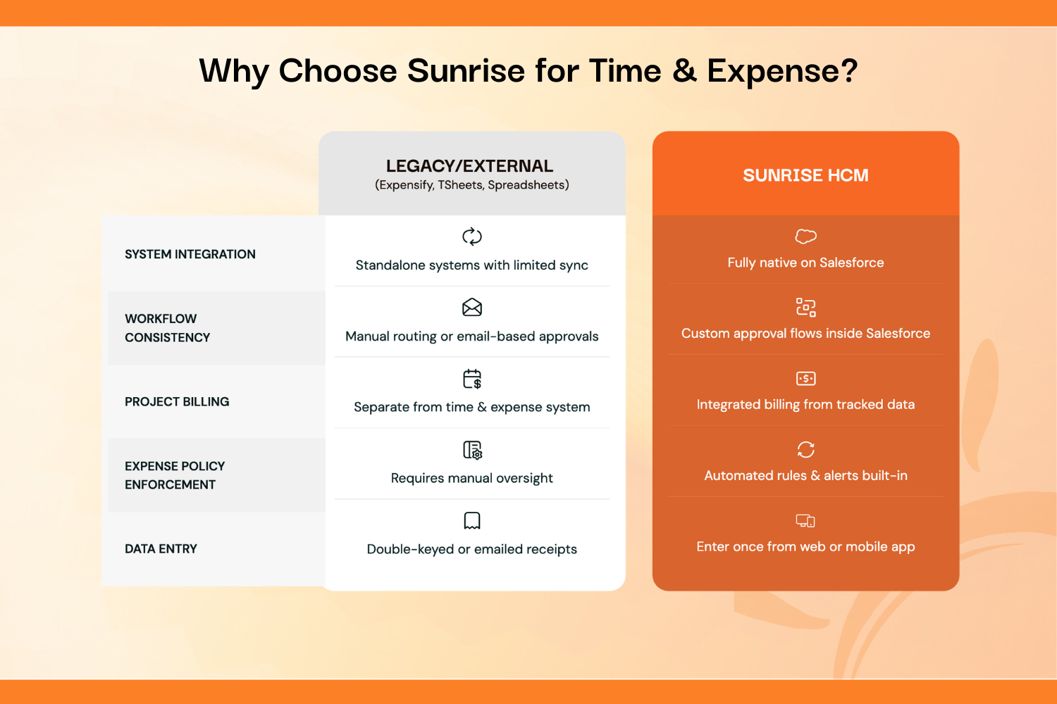 Human ResourcesEliminate data silos between your CRM, payroll, and billing. Sunrise HCM provides real-time visibility into project profitability, employee utilization, and labor costs - all native to Salesforce. Zero payroll fees. No middleware. One source of truth.