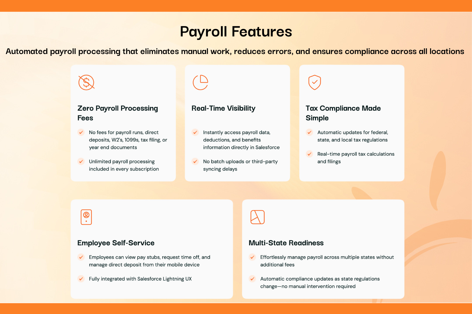 Starting at $12 USD per user per month Significant savings vs. legacy HCM and PSA solutions, built entirely on Salesforce. Zero payroll processing fees. Transparent monthly pricing includes Salesforce license and payroll bureau access. Contact us for details.
