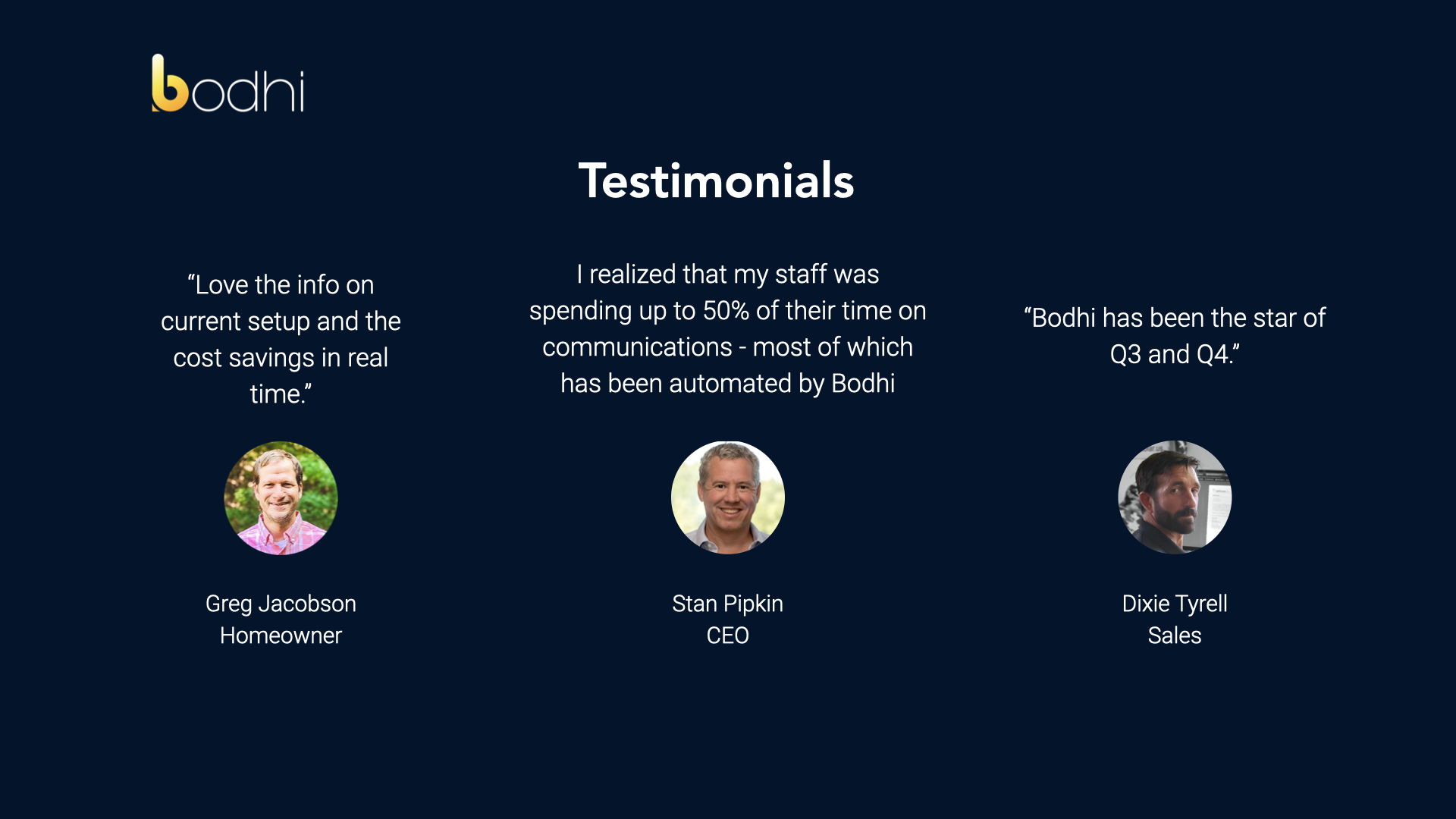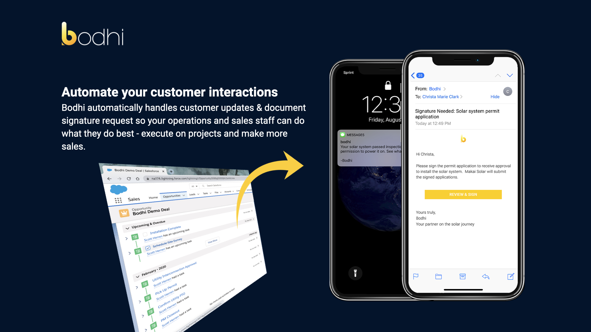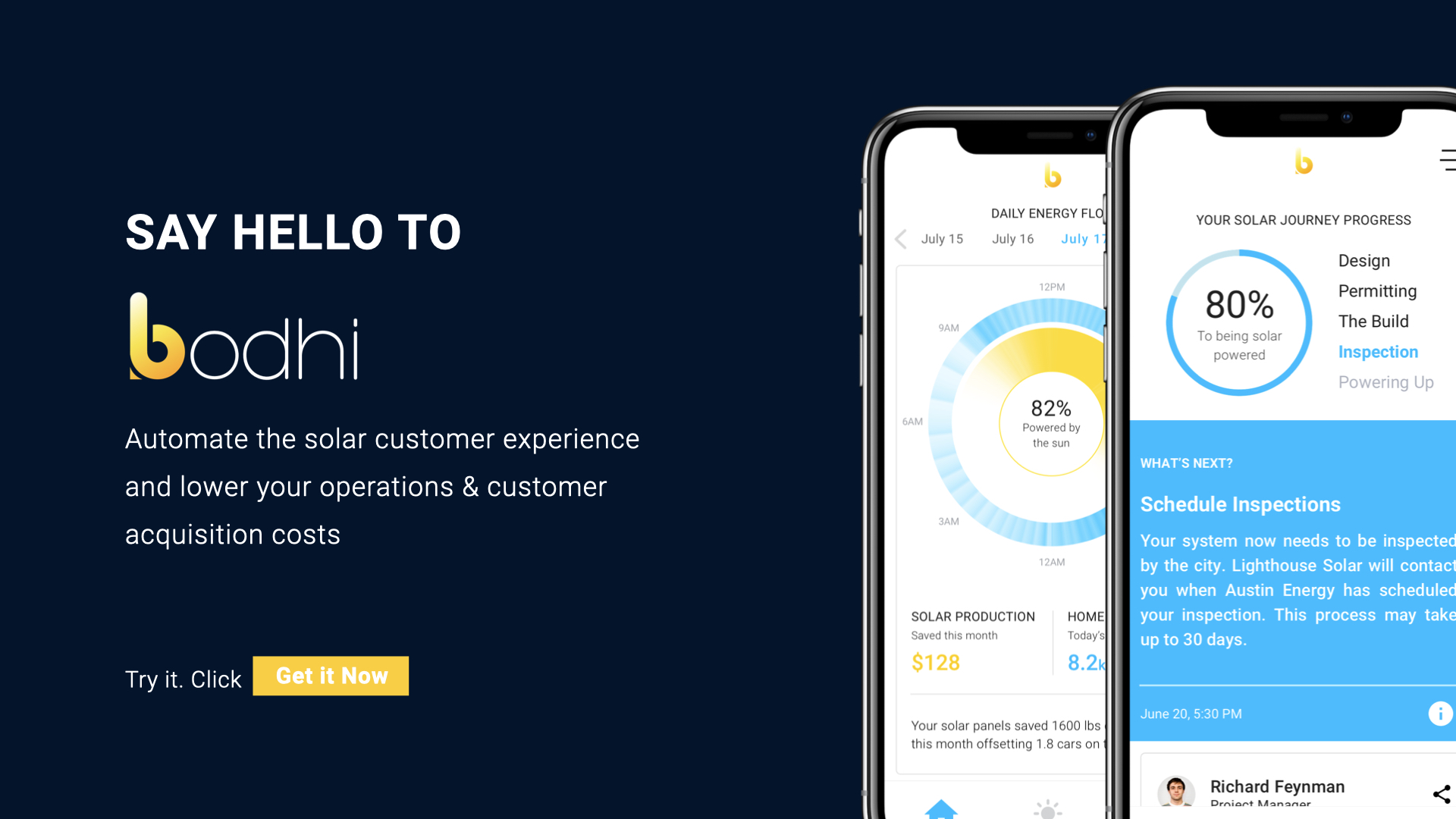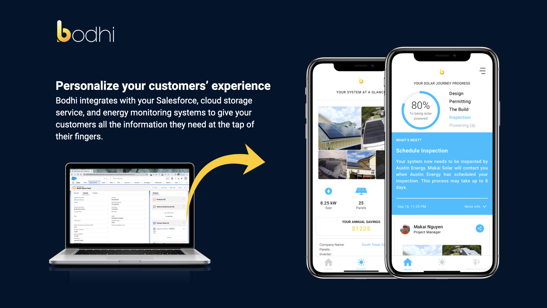 Agent ProductivityBodhi is a customer experience software platform & customer portal for the solar industry. Bodhi automates communication and personalizes the homeowners’ experience so installers can focus on what they do best - executing projects & making more sales.