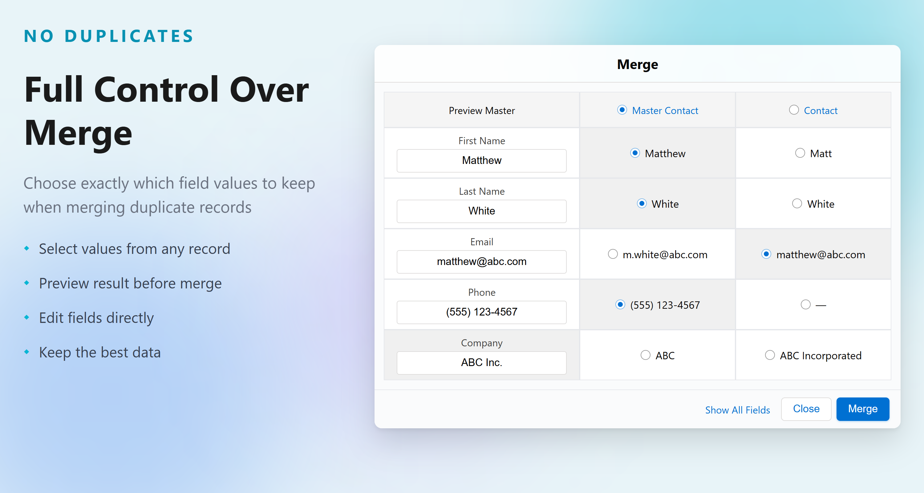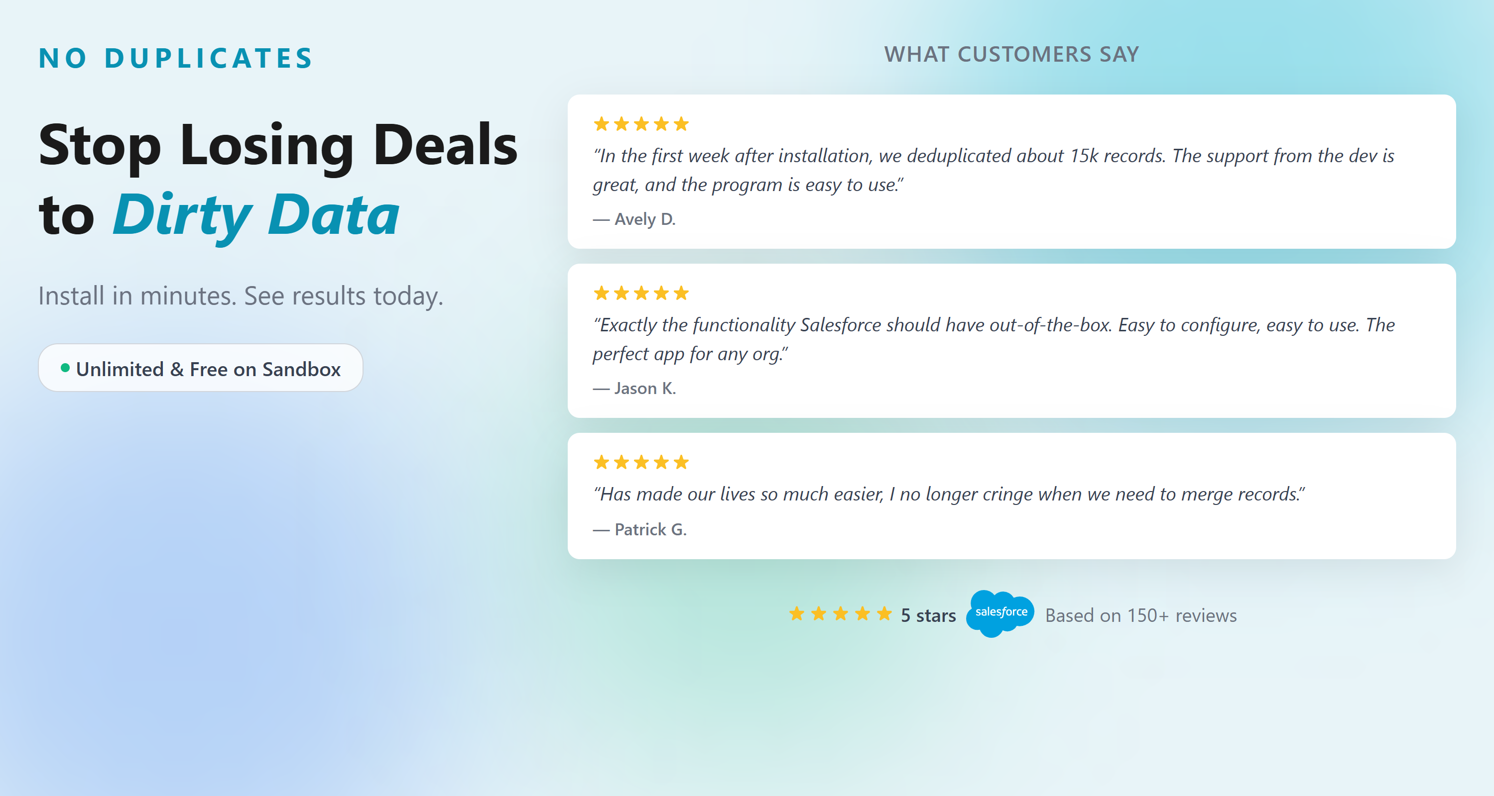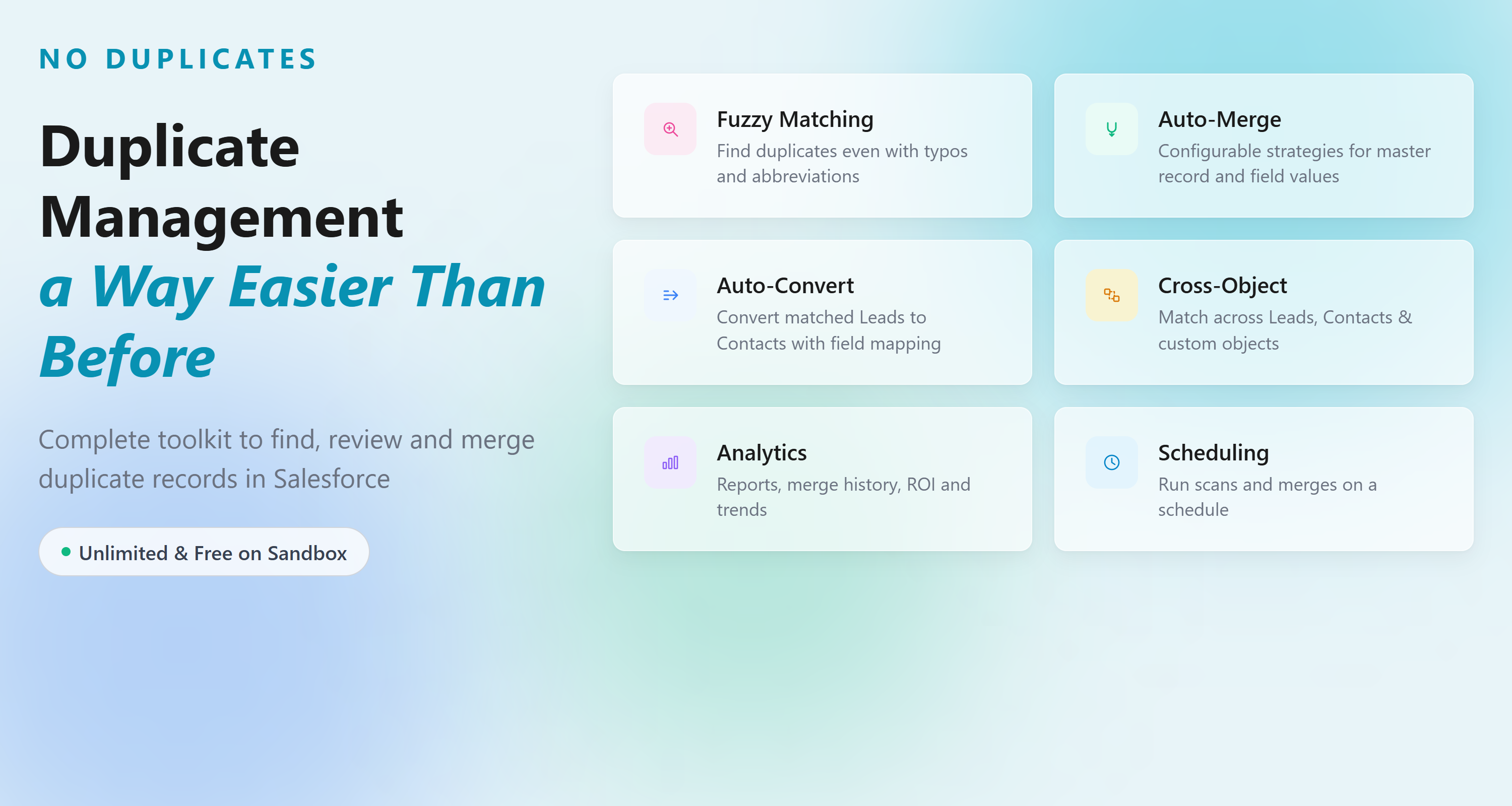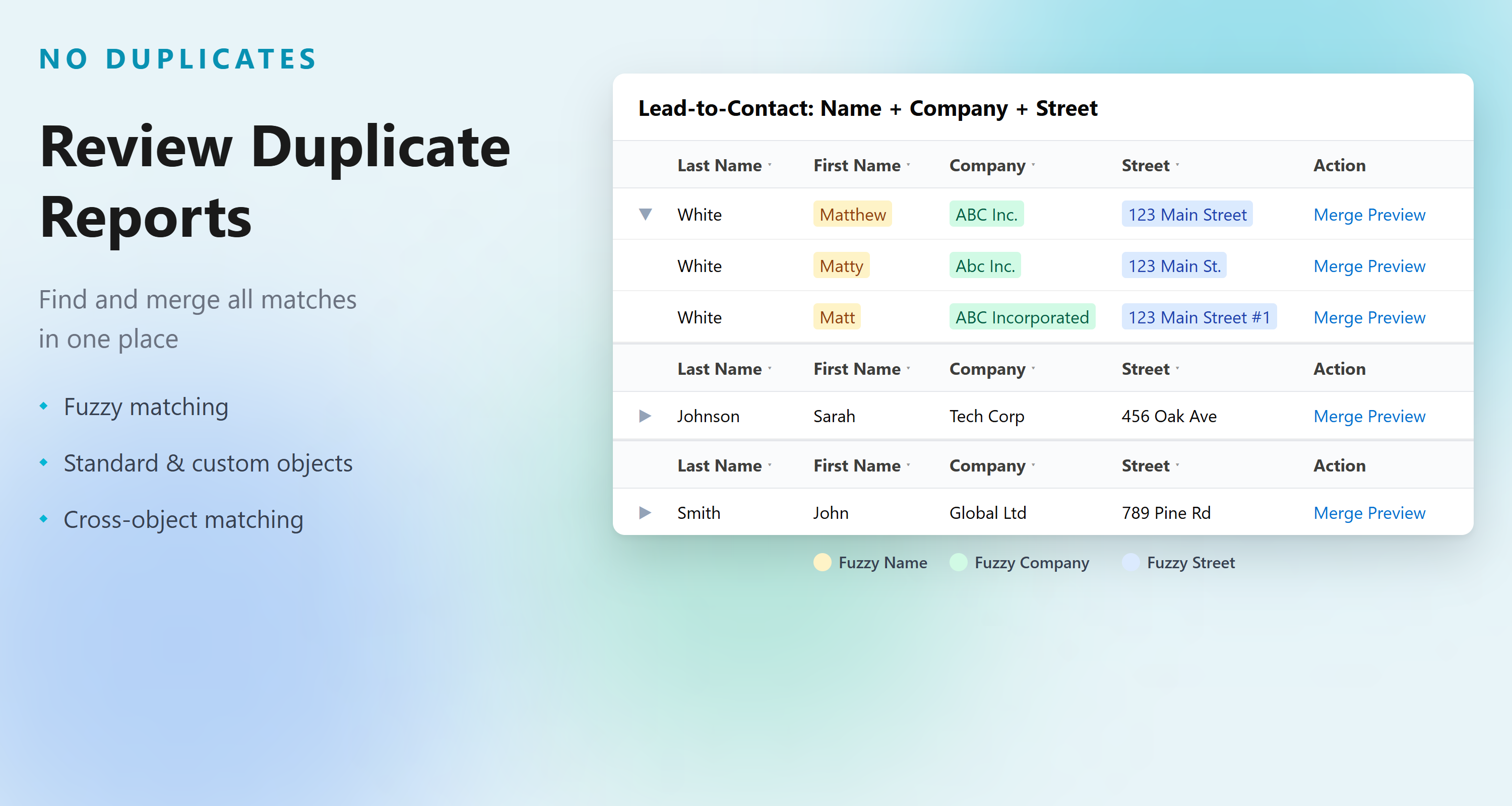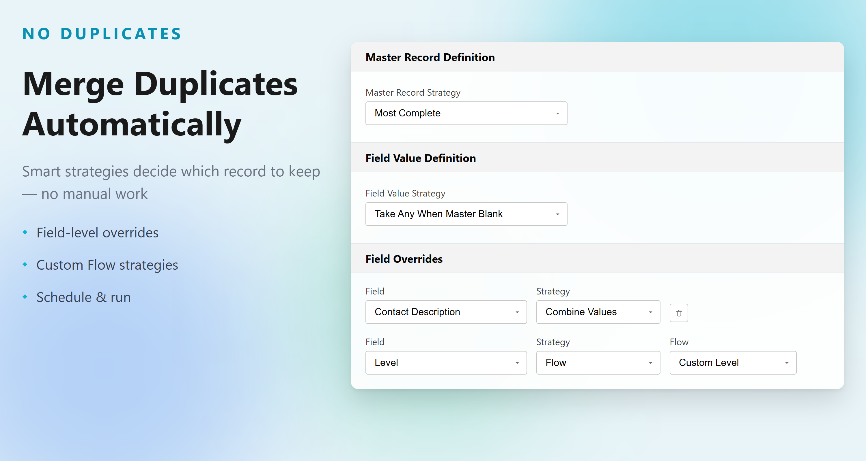 GovernmentDuplicate management app to merge duplicates across all objects. Find duplicates and generate duplicate reports with a few clicks. Maintain data quality inside Salesforce using modern deduplication and duplicate check capabilities