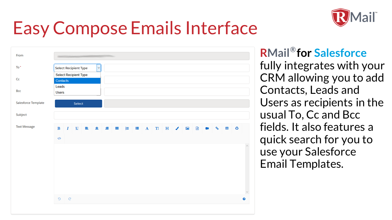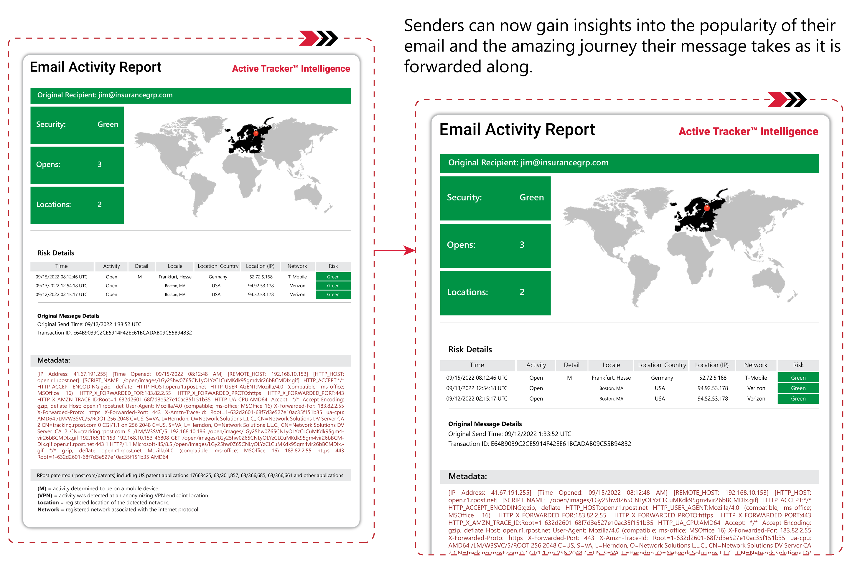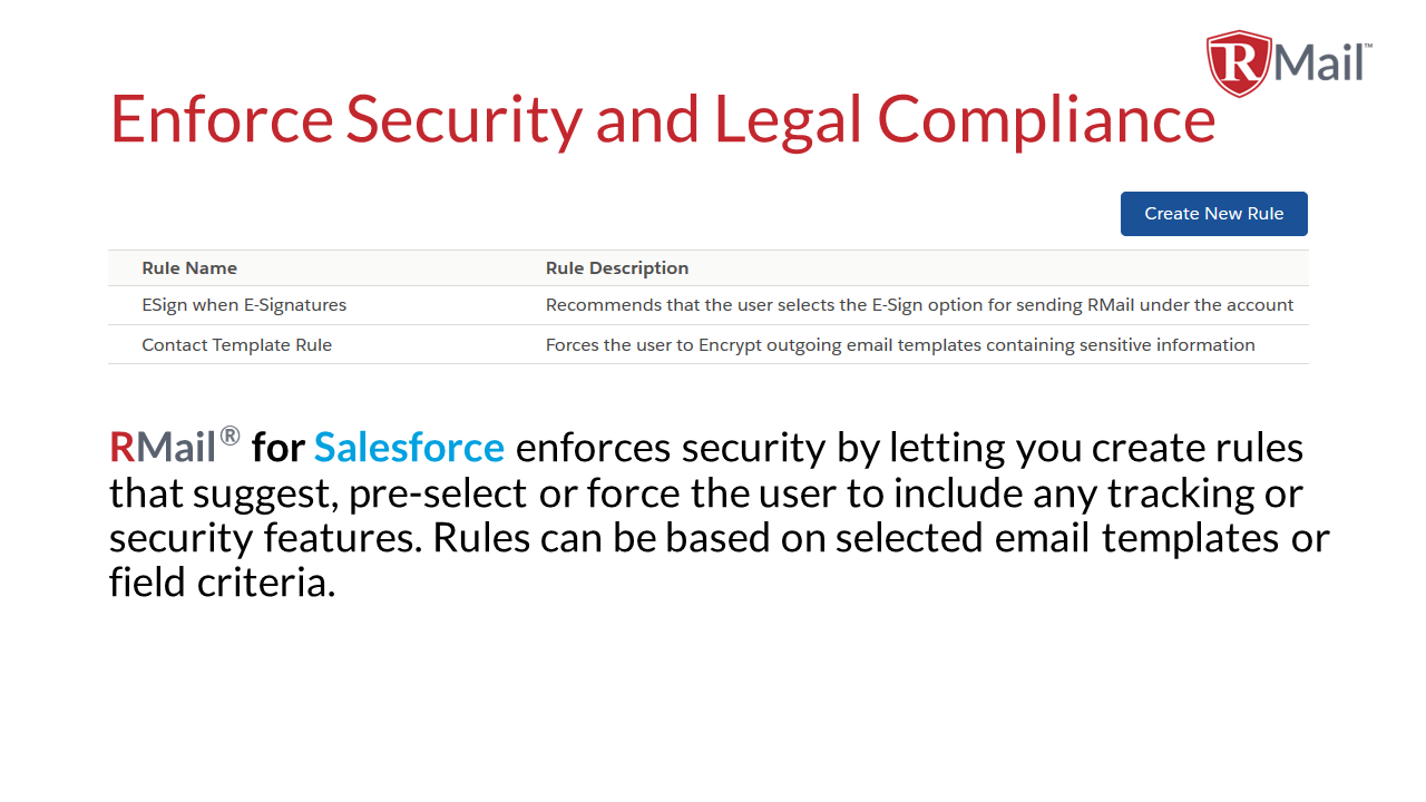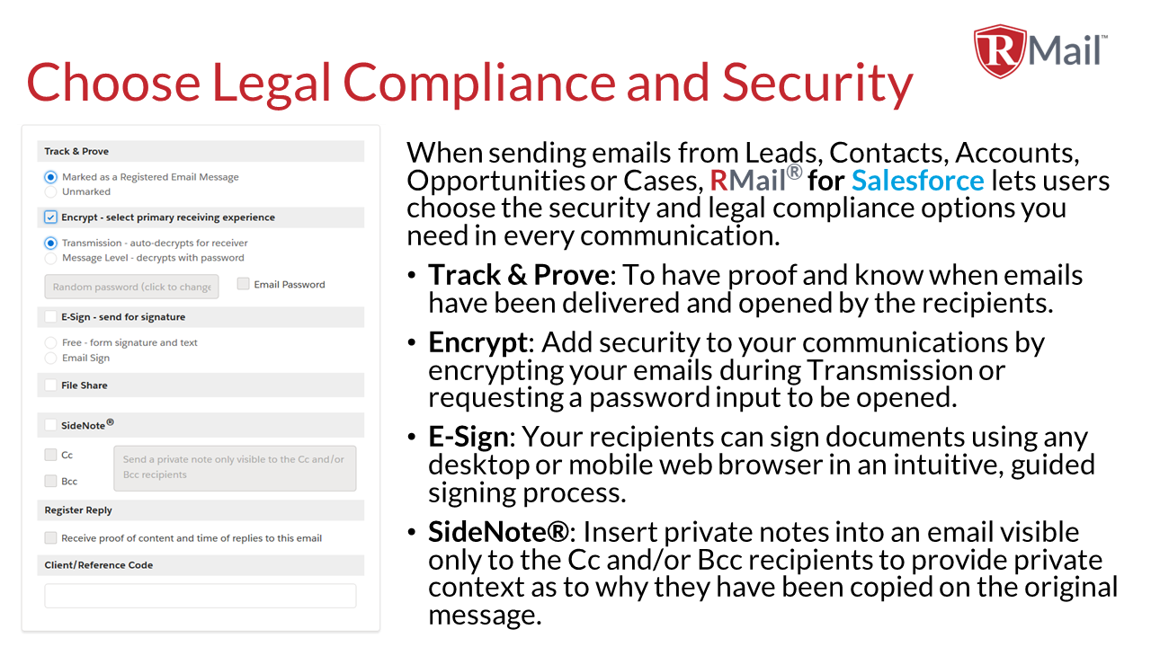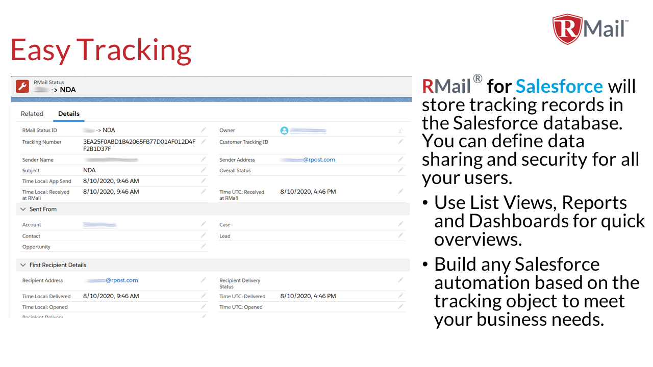 Agent ProductivityHow you send matters. RMail for Salesforce allows you to track email delivery and opening, with court-admissible proof, encrypt emails to be compliant and get real-time notification of which of your recipient's email account is being eavesdropped on.