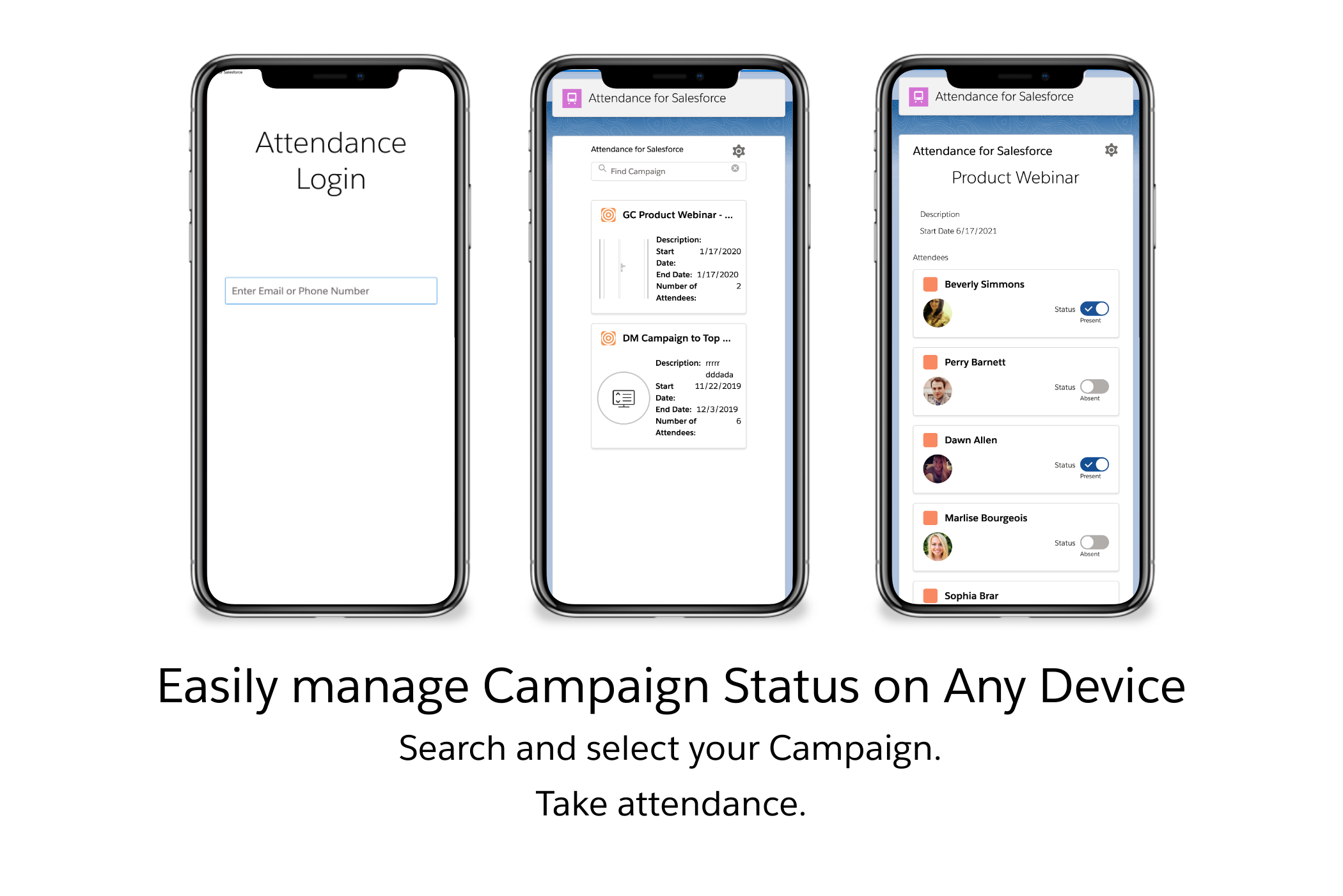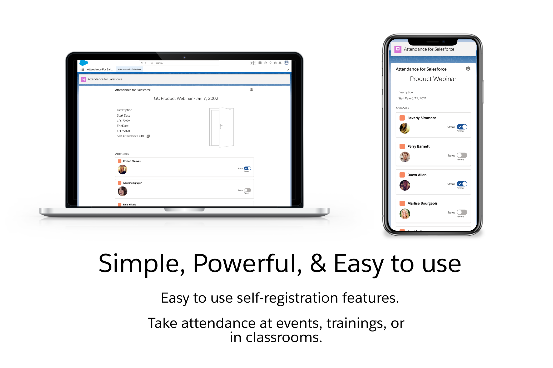 Time & ExpenseAttendance for Salesforce allows companies and organizations to easily and accurately track attendance, including easy to use registration and self check-in features.
