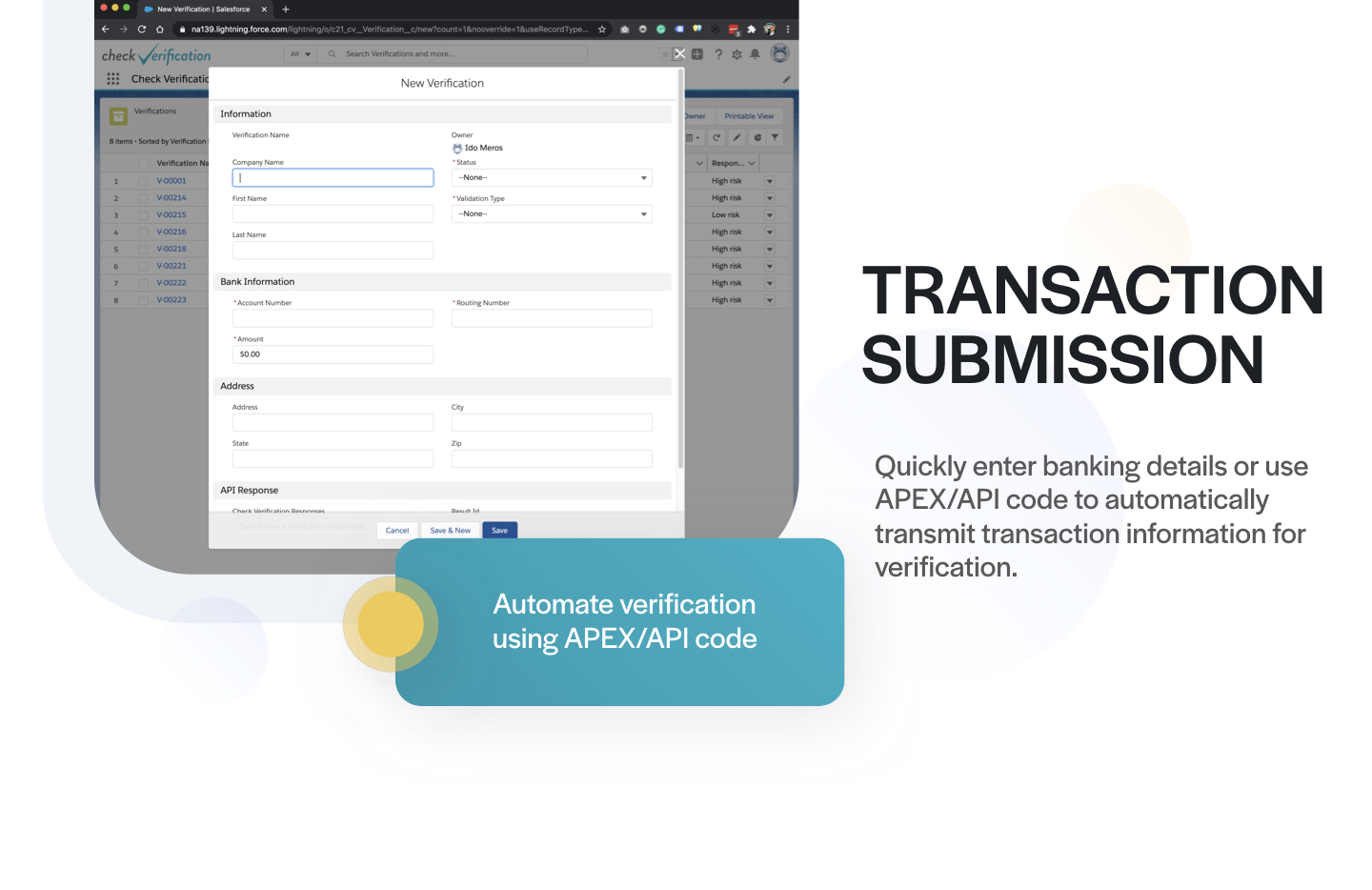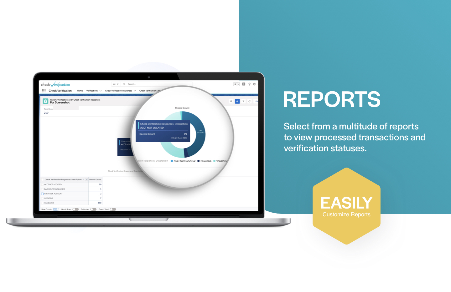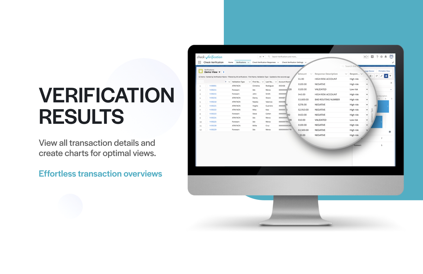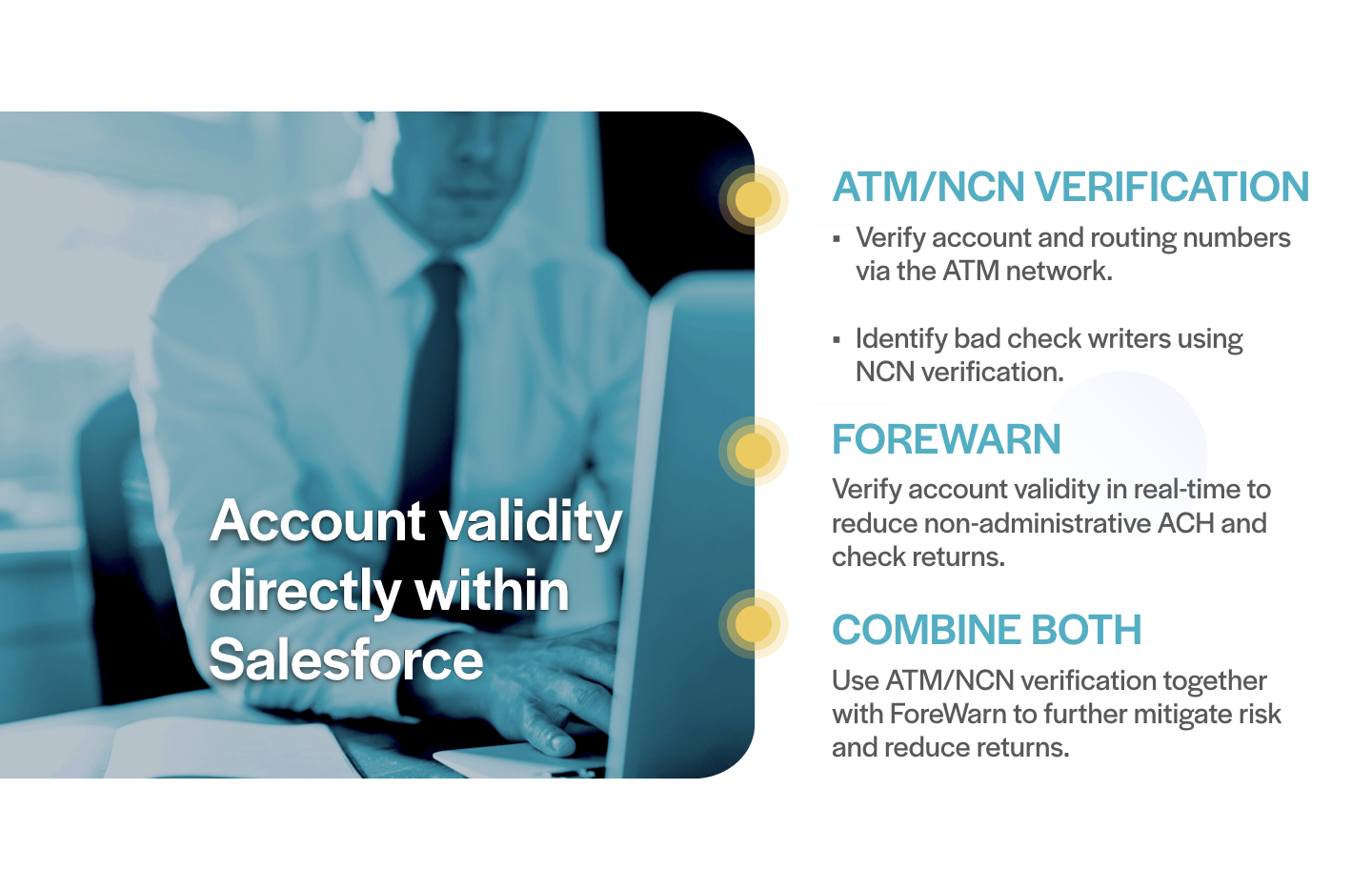 Payment ProcessingCheck Verification offers multiple methods of verifying account validity and check-writing history directly within Salesforce. Choose between ATM/NCN Verification and ForeWarn - or use them in combination to further mitigate your risk of returns.