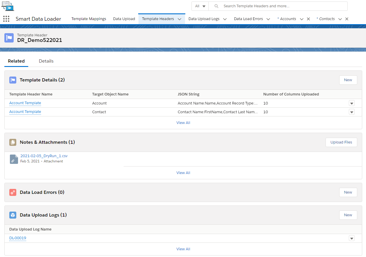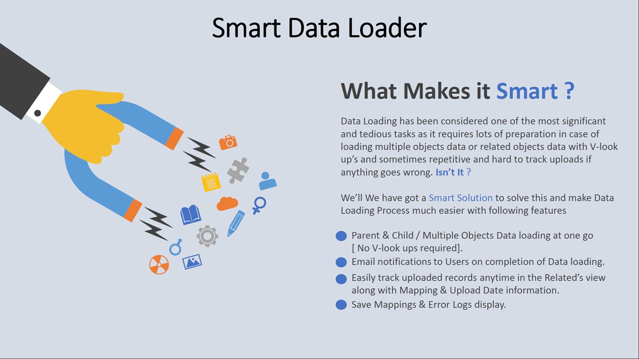 Admin & Developer Tools1. Load master child records into the Salesforce in one go##2. Use the names like product name, and account name to load associated data into Salesforce##3. Use the template to load data multiple times without a field map
