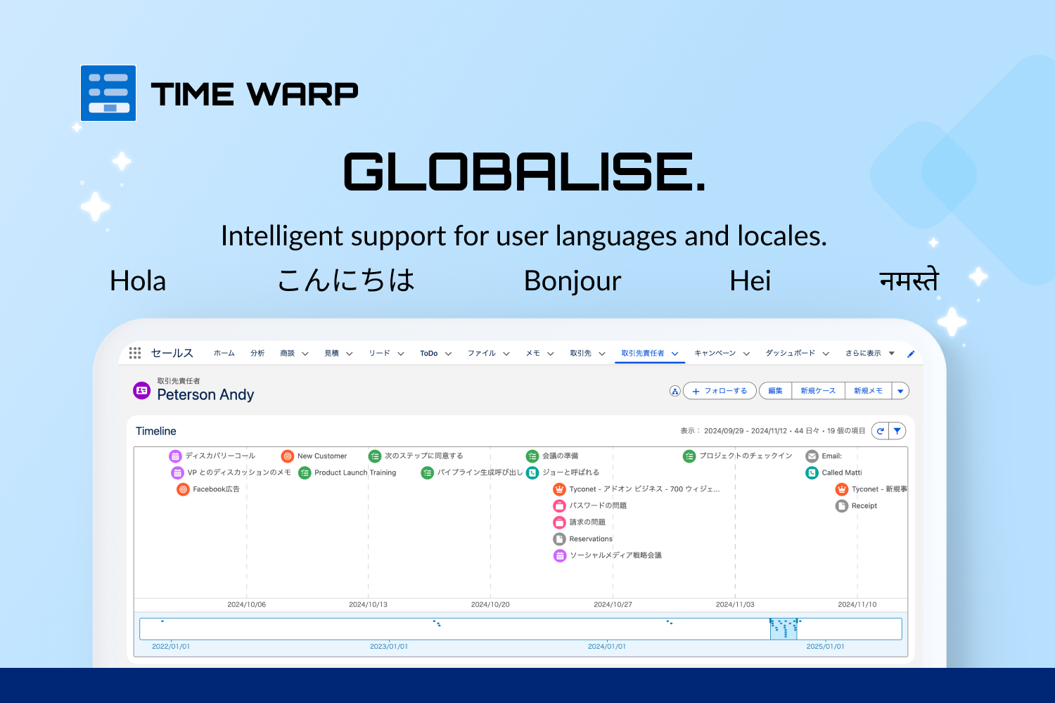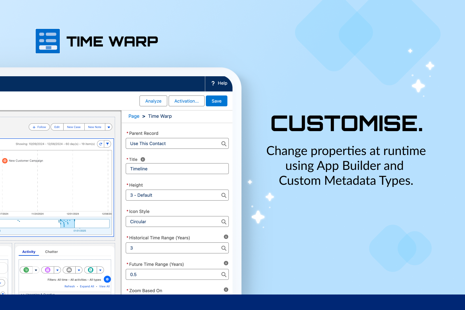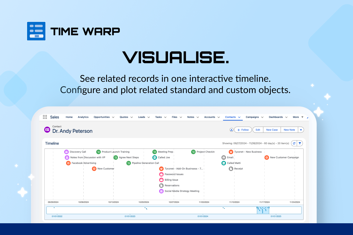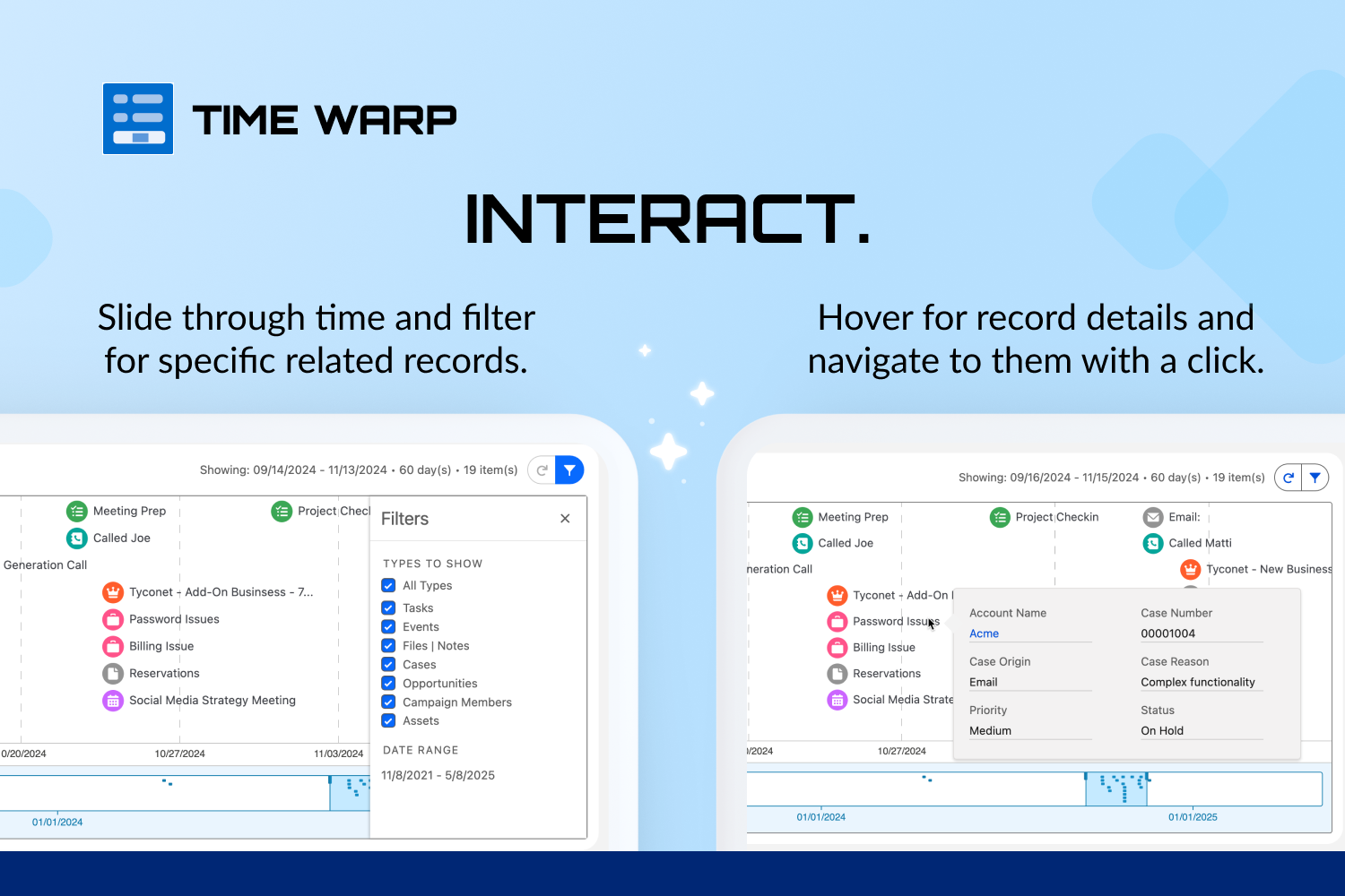 Get a 360 degree view of key Leads, Accounts, Contacts, Cases, Assets and more by viewing their related records on one beautiful, interactive timeline. Scroll, zoom, hover and click your way to visualising a complete picture of your customer data.