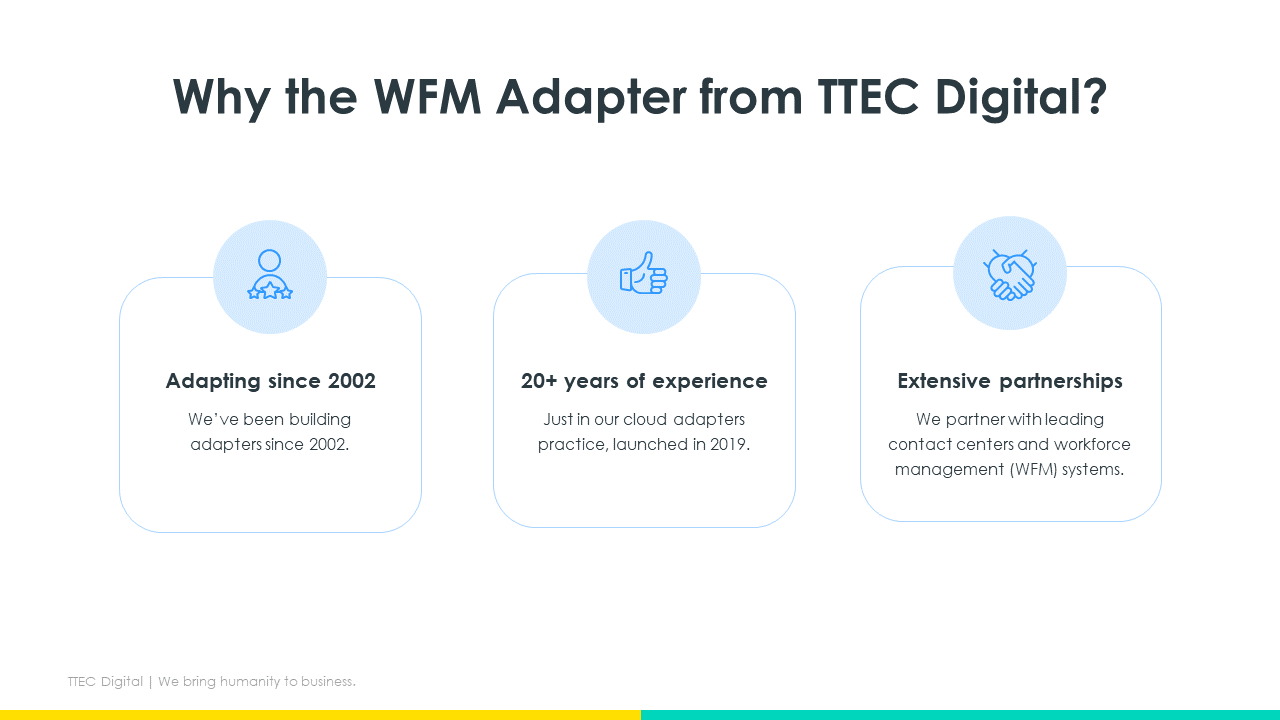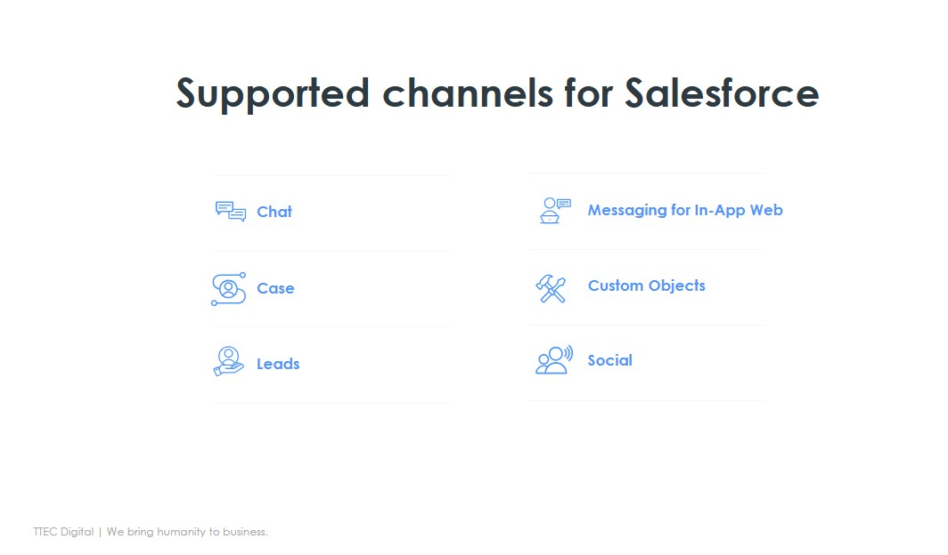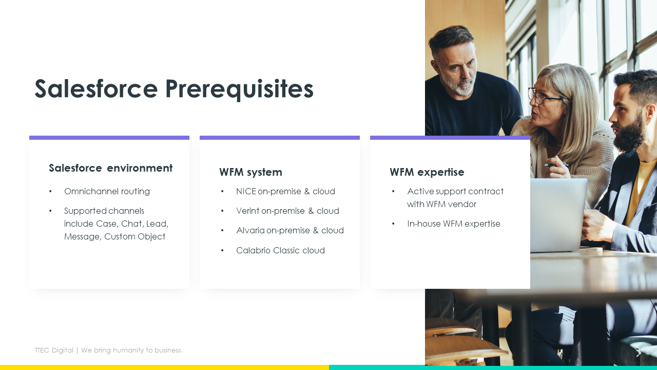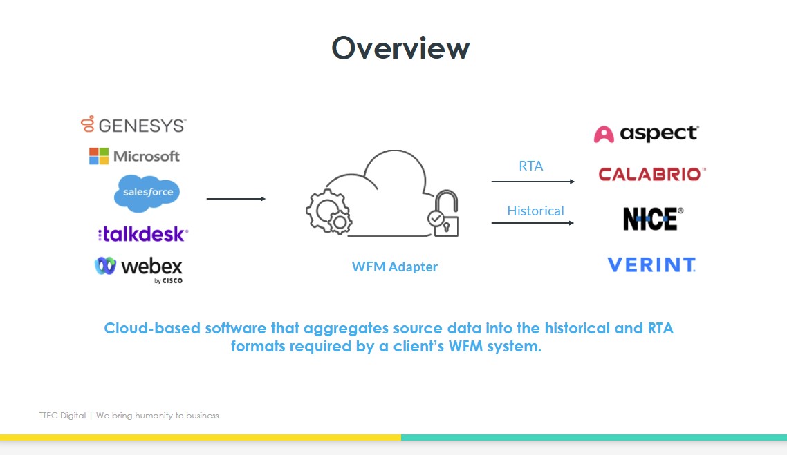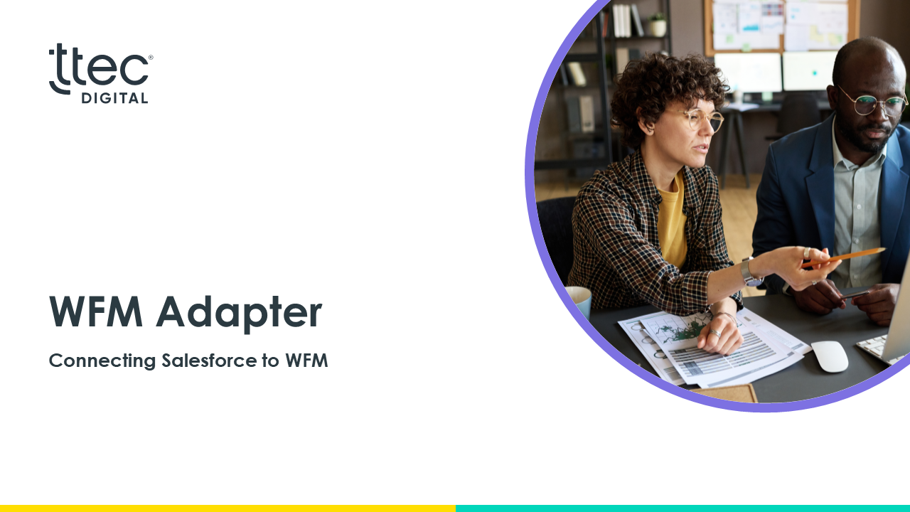 ProductivityTTEC Digital WFM Adapter for Salesforce integrates Service Cloud and Sales Cloud into industry-leading Workforce Management systems to monitor Salesforce users’ adherence and forecast schedules for Salesforce cases using your WFM solution of choice.